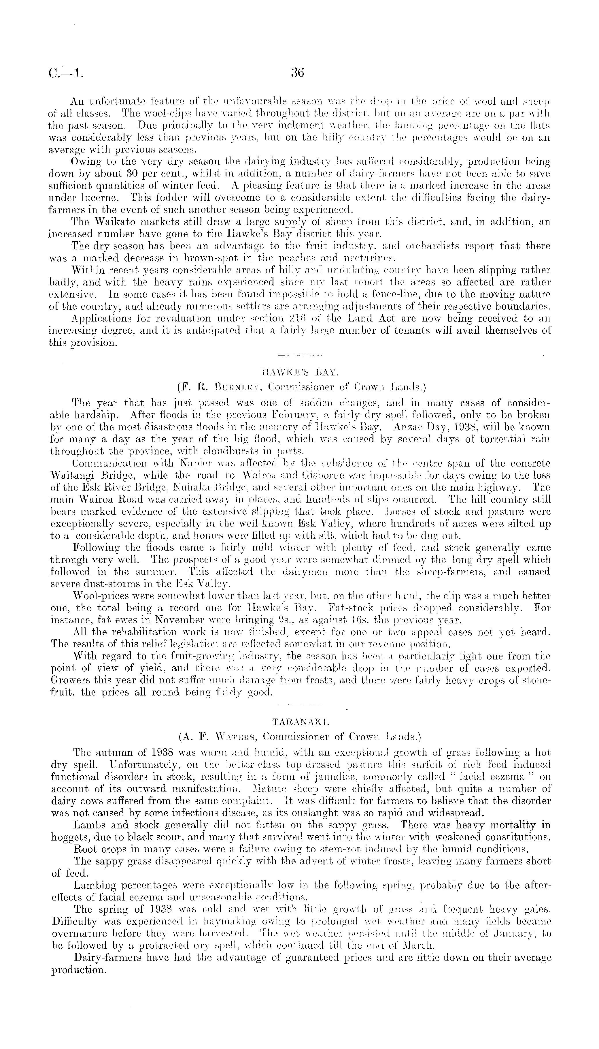 TARANAKI. (A. F. Waters, Commissioner of Crown Lands.) The autumn of 1938 was warm and humid, with an exceptional growth of grass following a hot dry spell. Unfortunately, on the better-class top-dressed pasture this surfeit of rich feed induced functional disorders in stock, resulting in a form of jaundice, commonly called " facial eczema " on account of its outward manifestation. Mature sheep were chiefly affected, but quite a number of dairy cows suffered from the same complaint. It was difficult for farmers to believe that the disorder was not caused by some infectious disease, as its onslaught was so rapid and widespread. Lambs and stock generally did not fatten on the sappy grass. There was heavy mortality in hoggets, due to black scour, and many that survived went into the winter with weakened constitutions. Root crops in many cases were a failure owing to stem-rot induced by the humid conditions. The sappy grass disappeared quickly with the advent of winter frosts, leaving many farmers short of feed. Lambing percentages were exceptionally low in the following spring, probably due to the aftereffects of facial eczema and unseasonable conditions. The spring of 1938 was cold and wet with little growth of grass and frequent heavy gales. Difficulty was experienced in haymaking owing to prolonged wet weather and many fields became overmature before they were harvested. The wet weather persisted until the middle of January, to be followed by a protracted dry spell, which continued till the end of March. Dairy-farmers have had the advantage of guaranteed prices and are little down on their average production.