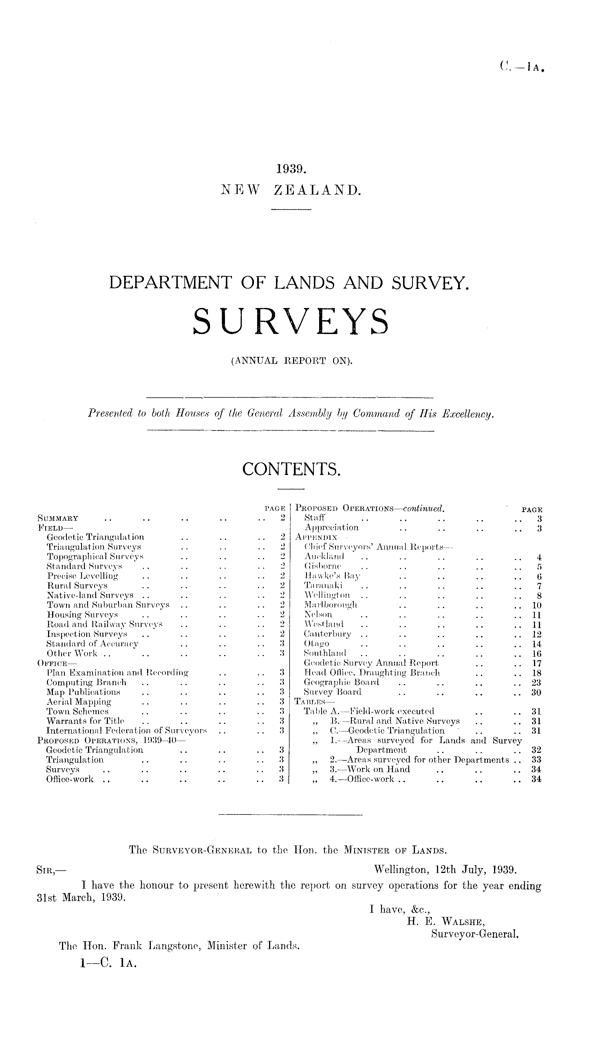 The Surveyor-General to the Hon. the Minister op Lands. Sir, —- Wellington, 12th July, 1939. I have the honour to present herewith the report on survey operations for the year ending 31st March, 1939. I have, &c., H. E. Walshe, Surveyor-General. The Hon. Frank Langstone, Minister of Lands.