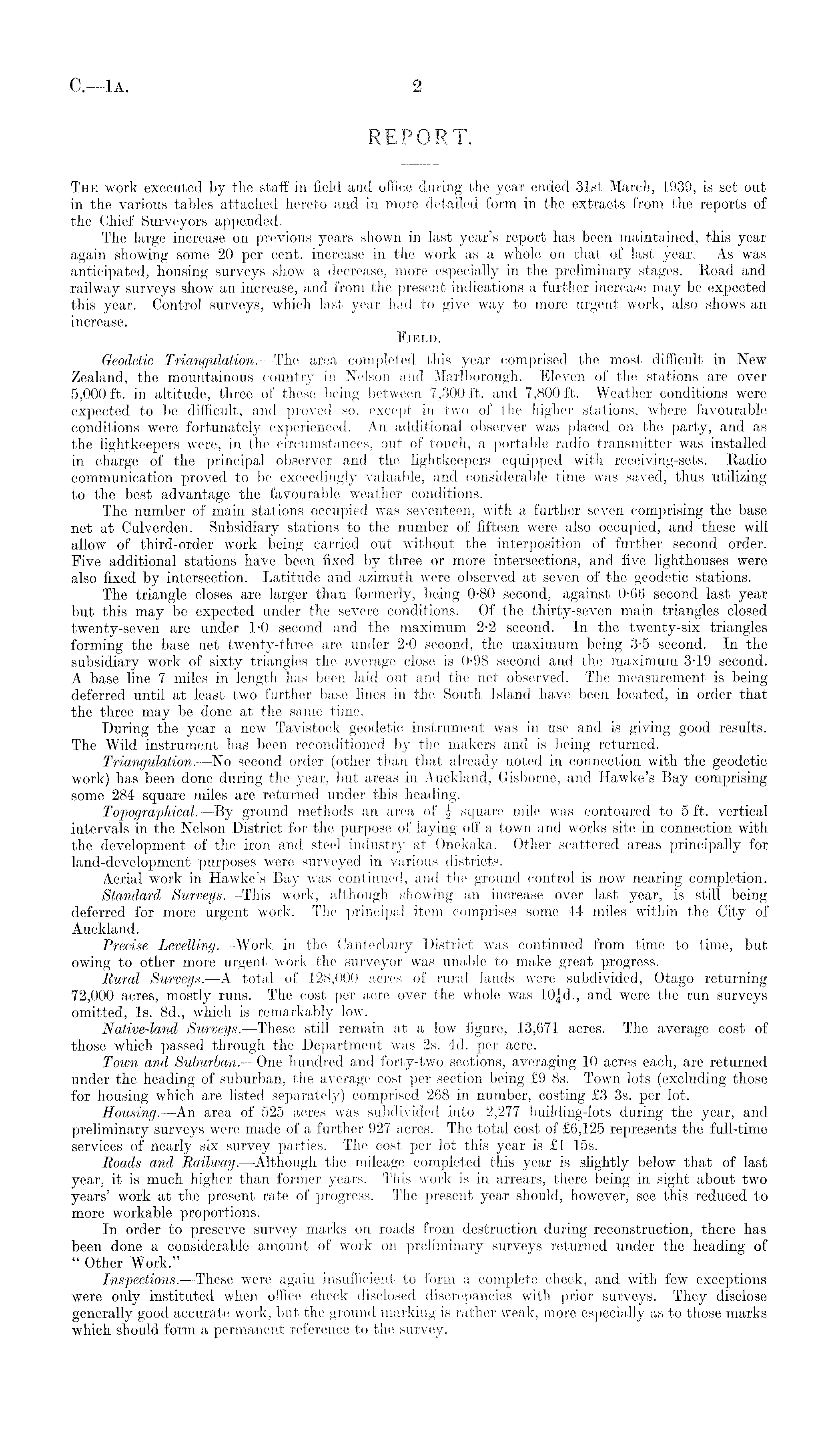 The work executed by the staff in field and office during the year ended 31st March, 1939, is set out in the various tables attached hereto and in more detailed form in the extracts from the reports of the Chief Surveyors appended. The large increase on previous years shown in last year's report has been maintained, this year again showing some 20 per cent, increase in the work as a whole on that of last year. As was anticipated, housing surveys show a decrease, more especially in the preliminary stages. Road and railway surveys show an increase, and from the present indications a further increase may be expected this year. Control surveys, which last year had to give way to more urgent work, also shows an increase. Field. Geodetic Triangulation. —The area completed this year comprised the most difficult in New Zealand, the mountainous country in Nelson and Marlborough. Eleven of the stations are over 5,000 ft. in altitude, three of these being between 7,300 ft. and 7,800 ft. Weather conditions were expected to be difficult, and proved so, except in two of the higher stations, where favourable conditions were fortunately experienced. An additional observer was placed on the party, and as the lightkeepers were, in the circumstances, out of touch, a portable radio transmitter was installed in charge of the principal observer and the lightkeepers equipped with receiving-sets. Radio communication proved to be exceedingly valuable, and considerable time was saved, thus utilizing to the best advantage the favourable weather conditions. The number of main stations occupied was seventeen, with a further seven comprising the base net at Culverden. Subsidiary stations to the number of fifteen were also occupied, and these will allow of third-order work being carried out without the interposition of further second order. Five additional stations have been fixed by three or more intersections, and five lighthouses were also fixed by intersection. Latitude and azimuth were observed at seven of the geodetic stations. The triangle closes are larger than formerly, being 0-80 second, against 0-66 second last year but this may be expected under the severe conditions. Of the thirty-seven main triangles closed twenty-seven are under 1-0 second and the maximum 2-2 second. In the twenty-six triangles forming the base net twenty-three are under 2-0 second, the maximum being 3-5 second. In the subsidiary work of sixty triangles the average close is 0-98 second and the maximum 3-19 second. A base line 7 miles in length has been laid out and the net observed. The measurement is being deferred until at least two further base lines in the South Island have been located, in order that the three may be done at the same time. During the year a new Tavistock geodetic instrument was in use and is giving good results. The Wild instrument has been reconditioned by the makers and is being returned. Triangulation. —No second order (other than that already noted in connection with the geodetic work) has been done during the year, but areas in Auckland, Gisborne, and Hawke's Bay comprising some 284 square miles are returned under this heading. Topographical. —By ground methods an area of square mile was contoured to 5 ft. vertical intervals in the Nelson District for the purpose of laying off a town and works site in connection with the development of the iron and steel industry at Onekaka. Other scattered areas principally for land-development purposes were surveyed in various districts. Aerial work in Hawke's Bay was continued,, and the ground control is now nearing completion. Standard Surveys. —This work, although showing an increase over last year, is still being deferred for more urgent work. The principal item comprises some 44 miles within the City of Auckland. Precise Levelling.—Work in the Canterbury District was continued from time to time, but owing to other more urgent work the surveyor was unable to make great progress. Rural Surveys. —A total of 128,000 acres of rural lands were subdivided, Otago returning 72,000 acres, mostly runs. The cost per acre over the whole was 10Jd., and were the run surveys omitted, Is. Bd., which is remarkably low. Native-land Surveys.—These still remain at a low figure, 13,671 acres. The average cost of those which passed through the Department was 2s. 4d. per acre. Town and Suburban. —One hundred and forty-two sections, averaging 10 acres each, are returned under the heading of suburban, the average cost per section being £9 Bs. Town lots (excluding those for housing which are listed separately) comprised 268 in number, costing £3 3s. per lot. Housing. —An area of 525 acres was subdivided into 2,277 building-lots during the year, and preliminary surveys were made of a further 927 acres. The total cost of £6,125 represents the full-time services of nearly six survey parties. The cost per lot this year is £1 15s. Roads and Railway. —Although the mileage completed this year is slightly below that of last year, it is much higher than former years. This work is in arrears, there being in sight about two years' work at the present rate of progress. The present year should, however, see this reduced to more workable proportions. In order to preserve survey marks on roads from destruction during reconstruction, there has been done a considerable amount of work on preliminary surveys returned under the heading of " Other Work." Inspections. —These were again insufficient to form a complete check, and with few exceptions were only instituted when office check disclosed discrepancies with prior surveys. They disclose generally good accurate work, but the ground marking is rather weak, more especially as to those marks which should form a permanent reference to the survey.