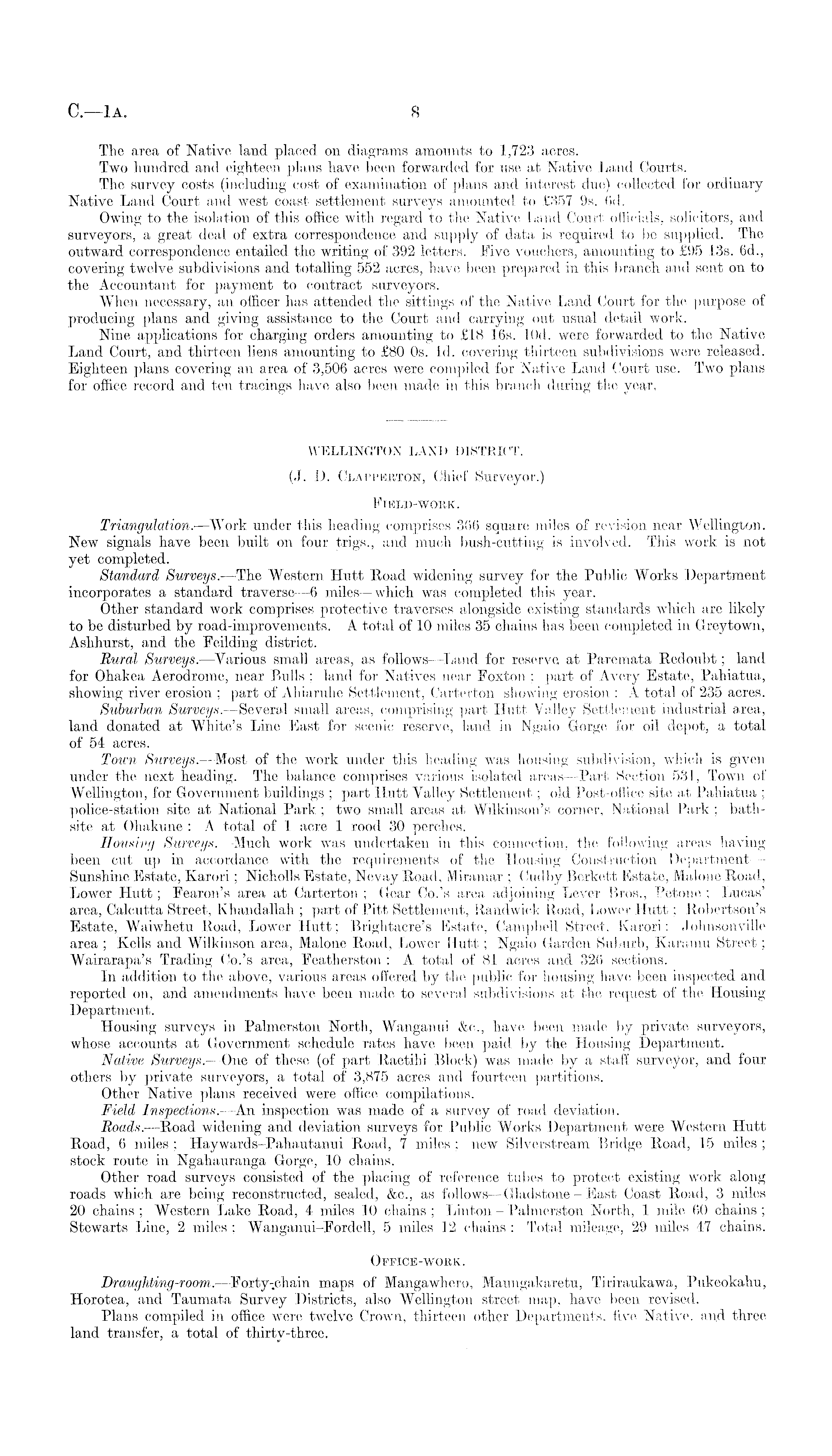 WELLINGTON LAND DISTRICT. (J. D. Clapperton, Chief Surveyor.) Field-work. Triangulation.—Work under this heading comprises 366 square miles of revision near Wellington. New signals have been built on four trigs., and much bush-cutting is involved. This work is not yet completed. Standard Surveys.—The Western Hutt Road widening survey for the Public Works Department incorporates a standard traverse—6 miles—which was completed this year. Other standard work comprises protective traverses alongside existing standards which are likely to be disturbed by road-improvements. A total of 10 miles 35 chains has been completed in Greytown, Aslihurst, and the Feilding district. Rural Surveys. —Various small areas, as follows—Land for reserve at Paremata Redoubt; land for Ohakea Aerodrome, near Bulls ; land for Natives near Foxton ; part of Avery Estate, Pahiatua, showing river erosion ; part of Ahiaruhe Settlement, Carterton showing erosion : A total of 235 acres. Suburban Surveys.—Several small areas, comprising part Hutt Valley Settlement industrial area, land donated at White's Line. East for scenic reserve, land in Ngaio Gorge for oil depot, a total of 54 acres. Town Surveys. —Most of the work under this heading was housing subdivision, which is given under the next heading. The balance comprises various isolated areas —Part Section 531, Town of Wellington, for Government buildings ; part Hutt Valley Settlement; old Post-office site at Pahiatua ; police-station site at National Park ; two small areas at Wilkinson's corner, National Park ; bathsite at Ohakune : A total of 1 acre 1 rood 30 perches. Housing Surveys. —Much work was undertaken in this connection, the following areas having been cut up in accordance with the requirements of the Housing Construction Department — Sunshine Estate, Karori; Nicholls Estate, Nevay Road, Miramar ; Cudby Berkett Estate, Malone Road, Lower Hutt; Fearon's area at Carterton ; Gear Co.'s area adjoining Lever Bros., Petone ; Lucas' area, Calcutta Street, Khandallah ; part of Pitt Settlement, Randwick Road, Lower Hutt; Robertson's Estate, Waiwhetu Road, Lower Hutt; Brightacre's Estate, Campbell Street, Karori; Johnsonville area ; Kells and Wilkinson area, Malone Road, Lower Hutt; Ngaio Garden Suburb, Karamu Street; Wairarapa's Trading Co.'s area, Featherston : A total of 81 acres and 326 sections. In addition to the above, various areas offered by the public for housing have been inspected and reported on, and amendments have been made to several subdivisions at the request of the Housing Department. Housing surveys in Palmerston North, Wanganui &c., have been made by private surveyors, whose accounts at Government schedule rates have been paid by the Housing Department. Native Surveys. —One of these (of part Raetihi Block) was made by a staff surveyor, and four others by private surveyors, a total of 3,875 acres and fourteen partitions. Other Native plans received were office compilations. Field Inspections. —An inspection was made of a survey of road deviation. Roads.—Road widening and deviation surveys for Public Works Department were Western Hutt Road, 6 miles ; Haywards-Pahautanui Road, 7 miles ; new Silverstream Bridge Road, 15 miles ; stock route in Ngahauranga Gorge, 10 chains. Other road surveys consisted of the placing of reference tubes to protect existing work along roads which are being reconstructed, sealed, &c., as follows —Gladstone - East Coast Road, 3 miles 20 chains ; Western Lake Road, 4 miles 10 chains ; Linton - Palmerston North, 1 mile 60 chains ; Stewarts Line, 2 miles ; Wanganui-Fordell, 5 miles 12 chains : Total mileage, 29 miles 47 chains. Office-work. Draughting-room.—Forty-chain maps of Mangawhero, Maungakaretu, Tiriraukawa, Pukeokahu, Horotea, and Taumata Survey Districts, also Wellington street map, have been revised. Plans compiled in office were twelve Crown, thirteen other Departments, five Native, and three land transfer, a total of thirty-three.