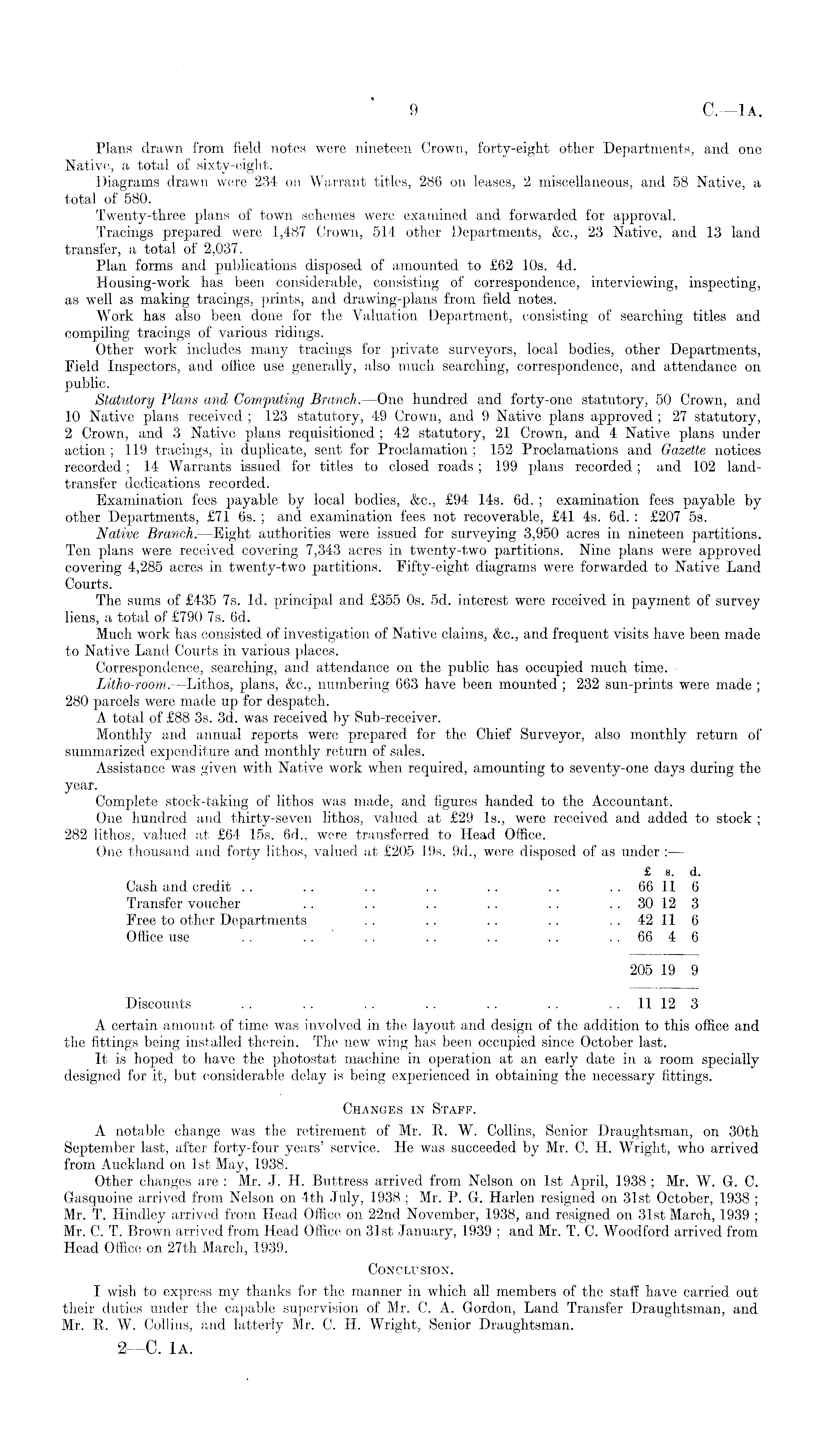 Plans drawn from field notes were nineteen Crown, forty-eight other Departments, and one Native, a total of sixty-eight. Diagrams drawn were 234 on Warrant titles, 286 on leases, 2 miscellaneous, and 58 Native, a total of 580. Twenty-three plans of town schemes were examined and forwarded for approval. Tracings prepared were 1,487 Crown, 514 other Departments, &c., 23 Native, and 13 land transfer, a total of 2,037. Plan forms and publications disposed of amounted to £62 10s. 4d. Housing-work has been considerable, consisting of correspondence, interviewing, inspecting, as well as making tracings, prints, and drawing-plans from field notes. Work has also been done for the Valuation Department, consisting of searching titles and compiling tracings of various ridings. Other work includes many tracings for private surveyors, local bodies, other Departments, Field Inspectors, and office use generally, also much searching, correspondence, and attendance on public. Statutory Plans and Computing Branch.. —One hundred and forty-one statutory, 50 Crown, and 10 Native plans received ; 123 statutory, 49 Crown, and 9 Native plans approved ; 27 statutory, 2 Crown, and 3 Native plans requisitioned ; 42 statutory, 21 Crown, and 4 Native plans under action ; 119 tracings, in duplicate, sent for Proclamation ; 152 Proclamations and Gazette notices recorded; 14 Warrants issued for titles to closed roads; 199 plans recorded; and 102 landtransfer dedications recorded. Examination fees payable by local bodies, &c., £94 14s. 6d. ; examination fees payable by other Departments, £71 6s. ; and examination fees not recoverable, £41 4s. 6d. : £207 ss. Native Branch.—Eight authorities were issued for surveying 3,950 acres in nineteen partitions. Ten plans were received covering 7,343 acres in twenty-two partitions. Nine plans were approved covering 4,285 acres in twenty-two partitions. Fifty-eight diagrams were forwarded to Native Land Courts. The sums of £435 7s. Id. principal and £355 os. sd. interest were received in payment of survey liens, a total of £790 7s. 6d. Much work has consisted of investigation of Native claims, &c., and frequent visits have been made to Native Land Courts in various places. Correspondence, searching, and attendance on the public has occupied much time. Litho-room. —Lithos, plans, &c., numbering 663 have been mounted ; 232 sun-prints were made ; 280 parcels were made up for despatch. A total of £88 3s. 3d. was received by Sub-receiver. Monthly and annual reports were prepared for the Chief Surveyor, also monthly return of summarized expenditure and monthly return of sales. Assistance was given with Native work when required, amounting to seventy-one days during the year. Complete stock-taking of lithos was made, and figures handed to the Accountant. One hundred and thirty-seven lithos, valued at £29 Is., were received and added to stock ; 282 lithos, valued at £64 15s. 6d., were transferred to Head Office. One thousand and forty lithos, valued at £205 19s. 9d., were disposed of as under : — £ s. d. Cash and credit .. .. .. .. .. .. .. 66 11 6 Transfer voucher .. .. .. .. .. .. 30 12 3 Free to other Departments .. .. .. .. 42 11 6 Office use .. .. * .. .. .. .. 66 4 6 205 19 9 Discounts .. . . .. .. . . .. 11 12 3 A certain amount of time was involved in the layout and design of the addition to this office and the fittings being installed therein. The new wing has been occupied since October last. It is hoped to have the photostat machine in operation at an early date in a room specially designed for it, but considerable delay is being experienced in obtaining the necessary fittings. Changes in Staff. A notable change was the retirement of Mr. R. W. Collins, Senior Draughtsman, on 30th September last, after forty-four years' service. He was succeeded by Mr. C. H. Wright, who arrived from Auckland on Ist May, 1938. Other changes are : Mr. J. H. Buttress arrived from Nelson on Ist April, 1938 ; Mr. W. G. C. Gasquoine arrived from Nelson on 4th July, 1938 ; Mr. P. G. Harlen resigned on 31st October, 1938 ; Mr. T. Hindley arrived from Head Office on 22nd November, 1938, and resigned on 31st March, 1939 ; Mr. C. T. Brown arrived from Head Office on 31st January, 1939 ; and Mr. T. C. Woodford arrived from Head Office on 27th March, 1939. Conclusion. I wish to express my thanks for the manner in which all members of the staff have carried out their duties under the capable supervision of Mr. C. A. Gordon, Land Transfer Draughtsman, and Mr. R. W. Collins, and latterly Mr. C. H. Wright, Senior Draughtsman.