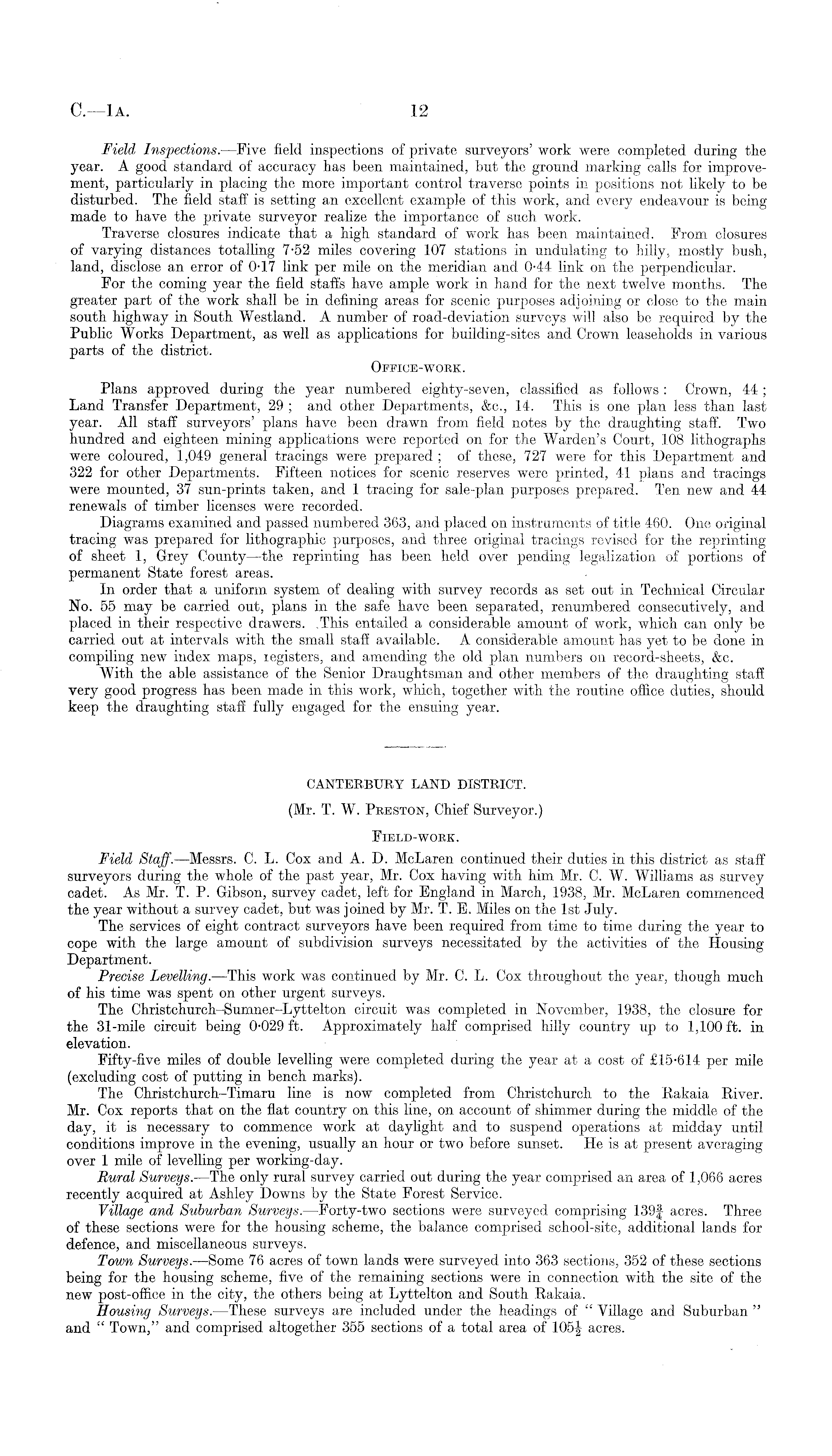 CANTERBURY LAND DISTRICT. (Mr. T. W. Preston, Chief Surveyor.) Field-work. Field Staff. —Messrs. C. L. Cox and A. D. McLaren continued their duties in this district as staff surveyors during the whole of the past year, Mr. Cox having with him Mr. C. W. Williams as survey cadet. As Mr. T. P. Gibson, survey cadet, left for England in March, 1938, Mr. McLaren commenced the year without a survey cadet, but was joined by Mr. T. E. Miles on the Ist July. The services of eight contract surveyors have been required from time to time during the year to cope with the large amount of subdivision surveys necessitated by the activities of the Housing Department. Precise Levelling. —This work was continued by Mr. C. L. Cox throughout the year, though much of his time was spent on other urgent surveys. The Christchurch-Sumner-Lyttelton circuit was completed in November, 1938, the closure for the 31-mile circuit being 0-029 ft. Approximately half comprised hilly country up to 1,100 ft. in elevation. Fifty-five miles of double levelling were completed during the year at a cost of £15-614 per mile (excluding cost of putting in bench marks). The Christchurch-Timaru line is now completed from Christchurch to the Rakaia River. Mr. Cox reports that on the flat country on this line, on account of shimmer during the middle of the day, it is necessary to commence work at daylight and to suspend operations at midday until conditions improve in the evening, usually an hour or two before sunset. He is at present averaging over 1 mile of levelling per working-day. Rural Surveys. —The only rural survey carried out during the year comprised an area of 1,066 acres recently acquired at Ashley Downs by the State Forest Service. Village and Suburban Surveys. —Forty-two sections were surveyed comprising 139f acres. Three of these sections were for the housing scheme, the balance comprised school-site, additional lands for defence, and miscellaneous surveys. Town Surveys.—Some 76 acres of town lands were surveyed into 363 sections, 352 of these sections being for the housing scheme, five of the remaining sections were in connection with the site of the new post-office in the city, the others being at Lyttelton and South Rakaia. Housing Surveys. —These surveys are included under the headings of " Village and Suburban " and " Town," and comprised altogether 355 sections of a total area of 105J acres.