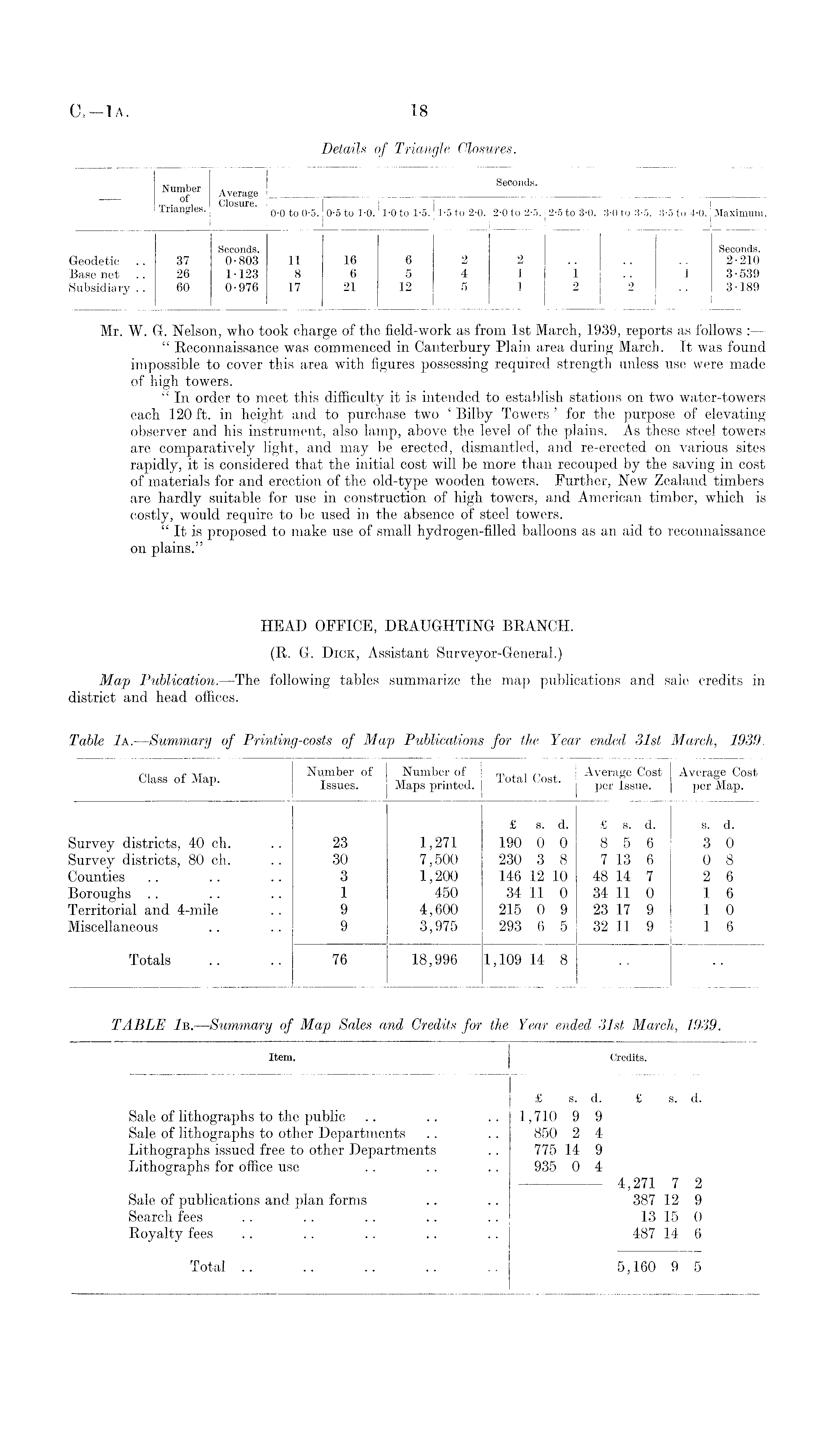 Mr. W. G. Nelson, who took charge of the field-work as from Ist March, 1939, reports as follows : — " Reconnaissance was commenced in Canterbury Plain area during March. It was found impossible to cover this area with figures possessing required strength unless use were made of high towers. " In order to meet this difficulty it is intended to establish stations on two water-towers each 120 ft. in height and to purchase two ' Bilby Towers ' for the purpose of elevating observer and his instrument, also lamp, above the level of the plains. As these steel towers are comparatively light, and may be erected, dismantled, and re-erected on various sites rapidly, it is considered that the initial cost will be more than recouped by the saving in cost of materials for and erection of the old-type wooden towers. Further, New Zealand timbers are hardly suitable for use in construction of high towers, and American timber, which is costly, would require to be used in the absence of steel towers. " It is proposed to make use of small hydrogen-filled balloons as an aid to reconnaissance on plains." HEAD OFFICE, DRAUGHTING BRANCH. (R. G. Dick, Assistant Surveyor-General.) Map Publication. —The following tables summarize the map publications and sale credits in district and head offices.