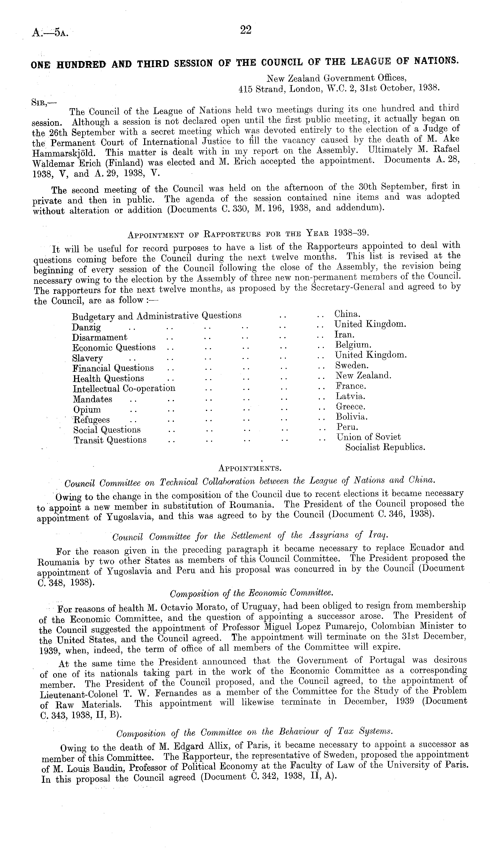 ONE HUNDRED AND THIRD SESSION OF THE COUNCIL OF THE LEAGUE OF NATIONS. New Zealand Government Offices, 415 Strand, London, W.C. 2, 31st October, 1938. The Council of the League of Nations held two meetings during its one hundred and third session. Although a session is not declared open until the first public meeting, it actually began on the 26th September with a secret meeting which was devoted entirely to the election of a Judge of the Permanent Court of International Justice to fill the vacancy caused by the death of M. Ake Hammarskjold. This matter is dealt with in my report on the Assembly. Ultimately M. Rafael Waldemar Erich (Finland) was elected and M. Erich accepted the appointment. Documents A. 28, 1938, V, and A. 29, 1938, Y. The second meeting of the Council was held on the afternoon of the 30th September, first m private and then in public. The agenda of the session contained nine items and was adopted without alteration or addition (Documents C. 330, M. 196, 1938, and addendum). Appointment of Rapporteurs for the Year 1938-39. It will be useful for record purposes to have a list of the Rapporteurs appointed to deal with questions coming before the Council during the next twelve months. This list is revised at the beginning of every session of the Council following the close of the Assembly, the revision being necessary owing to the election by the Assembly of three new non-permanent members of the Council. The rapporteurs for the next twelve months, as proposed by the Secretary-General and agreed to by the Council, are as follow : — Budgetary and Administrative Questions .. • • China. Danzig • • • • • • • • • • United Kingdom. Disarmament . . • • • • • ■ • • Iran. Economic Questions . . ■. ■ • • • • • Belgium. Slavery .. ■ • • • • • • • • • United Kingdom. Financial Questions . . ■ • ■ ■ • • ■ • Sweden. Health Questions .. ■ ■ • • • • • • New Zealand. Intellectual Co-operation .. ■ • • • • • France. Mandates . . • • • • • • • • • • Latvia. Opium .. ■ • • • • • • • • • Greece. Refugees .. • • • • • • • • ■ • Bolivia. Social Questions .. . • • • • ■ • • P eru - Transit Questions .. .. • • • • • • Union ol Soviet Socialist Republics. Appointments. Council Committee on Technical Collaboration between the League of Nations and China. Owing to the change in the composition of the Council due to recent elections it became necessary to appoint a new member in substitution of Roumania. The President of the Council proposed the appointment of Yugoslavia, and this was agreed to by the Council (Document C. 346, 1938). Council Committee for the Settlement of the Assyrians of Iraq. For the reason given in the preceding paragraph it became necessary to replace Ecuador and Roumania by two other States as members of this Council Committee. The President proposed the appointment of Yugoslavia and Peru and his proposal was concurred in by the Council (Document C. 348, 1938). Composition of the Economic Committee. For reasons of health M. Octavio Morato, of Uruguay, had been obliged to resign from membership of the Economic Committee, and the question of appointing a successor arose. The President of the Council suggested the appointment of Professor Miguel Lopez Pumarejo, Colombian Minister to the United States, and the Council agreed. The appointment will terminate on the 31st December, 1939, when, indeed, the term of office of all members of the Committee will expire. At the same time the President announced that the Government of Portugal was desirous of one of its nationals taking part in the work of the Economic Committee as a corresponding member. The President of the Council proposed, and the Council agreed, to the appointment of Lieutenant-Colonel T. W. Fernandes as a member of the Committee for the Study of the Problem of Raw Materials. This appointment will likewise terminate in December, 1939 (Document C. 343, 1938, 11, B). Composition of the Committee on the Behaviour of Tax Systems. Owinc to the death of M. Edgard Allix, of Paris, it became necessary to appoint a successor as member of this Committee. The Rapporteur, the representative of Sweden, proposed the appointment of M. Louis Baudin, Professor of Political Economy at the Faculty of Law of the University of Paris. In this proposal the Council agreed (Document C. 342, 1938, 11, A).