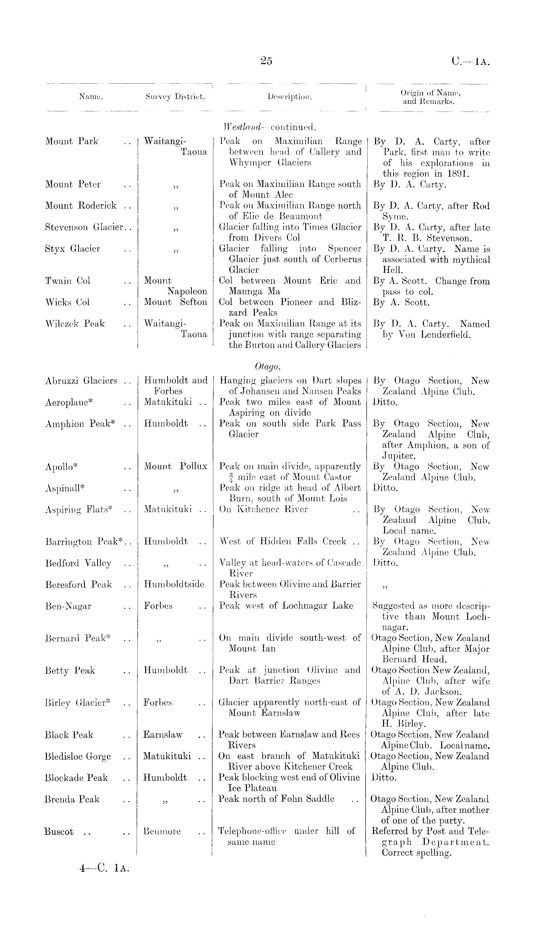 Name. 1 Survey District. Description. § „ a e, J and Kemarks. I W estland —continued. Mount Park . . Waitangi- Peak on Maximilian Range By D. A. Carty, after Taona between head of Callery and Park, first man to write Wliymper Glaciers of his explorations in this region in 1891. Mount Peter .. „ Peak on Maximilian Range south By D. A. Carty. of Mount Alec Mount Roderick .. „ Peak on Maximilian Range north By D. A. Carty, after Rod of Elie de Beaumont Syme. Stevenson Glacier.. ,, Glacier falling into Times Glacier By D. A. Carty, after late from Divers Col T. R. B. Stevenson. Styx Glacier .. „ Glacier falling into Spencer By D. A. Carty. Name is Glacier just south of Cerberus associated with mythical Glacier Hell. Twain Col .. Mount Col between Mount Eric and By A. Scott. Change from Napoleon Maunga Ma pass to col. Wicks Col .. Blount Sefton Col between Pioneer and Bliz- By A. Scott. zard Peaks Wilczek Peak . . Waitangi- Peak on Maximilian Range at its By D. A. Carty. Named Taona junction with range separating by Yon Lenderfield. the Burton and Callery Glaciers Otago. Abruzzi Glaciers . . Humboldt and Hanging glaciers on .Dart slopes By Otago Section, New Forbes of Johansen and Nansen Peaks Zealand Alpine Club. Aeroplane* .. Matukituki .. Peak two miles east of Mount Ditto. Aspiring on divide Amphion Peak* .. Humboldt .. Peak on south side Park Pass By Otago Section, New Glacier Zealand Alpine Club, after Amphion, a son of Jupiter. Apollo* .. Mount Pollux Peak on main divide, apparently By Otago Section, New f mile east of Mount Castor Zealand Alpine Club. Aspinall* .. „ Peak on ridge at head of Albert Ditto. Burn, south of Mount Lois Aspiring Flats* .. Matukituki .. On Kitchener River .. By Otago Section, New Zealand Alpine Club. Local name. Barrington Peak*.. Humboldt .. West of Hidden Falls Creek .. By Otago Section, New Zealand Alpine Club. Bedford Valley .. ,, .. Valley at head-waters of Cascade Ditto. River Beresford Peak .. Humboldtside Peak between Olivine and Barrier ,, Rivers Ben-Nagar .. Forbes .. Peak west of Lochnagar Lake Suggested as more descriptive than Mount Lochnagar. Bernard Peak* .. „ On main divide south-west of Otago Section, New Zealand Mount Ian Alpine Club, after Major Bernard Head. Betty Peak .. Humboldt .. Peak at junction Olivine and Otago Section New Zealand, Dart Barrier Ranges Alpine Club, after wife of A. D. Jackson. Birley Glacier* . . Forbes .. Glacier apparently north-east of Otago Section, New Zealand Mount Earnslaw Alpine Club, after late H. Birley. Black Peak .. Earnslaw .. Peak between Earnslaw and Rees Otago Section, New Zealand Rivers Alpine Club. Local name. Bledisloe Gorge .. Matukituki .. On east branch of Matukituki Otago Section, New Zealand River above Kitchener Creek Alpine Club. Blockade Peak .. Humboldt .. Peak blocking west end of Olivine Ditto. Ice Plateau Brenda Peak .. „ .. Peak north of Fohn Saddle .. Otago Section, New Zealand Alpine Club, after mother of one of the party. Buscot .. .. Benmore .. Telephone-office under hill of Referred by Post and Telesame name graph Department. Correct spelling.