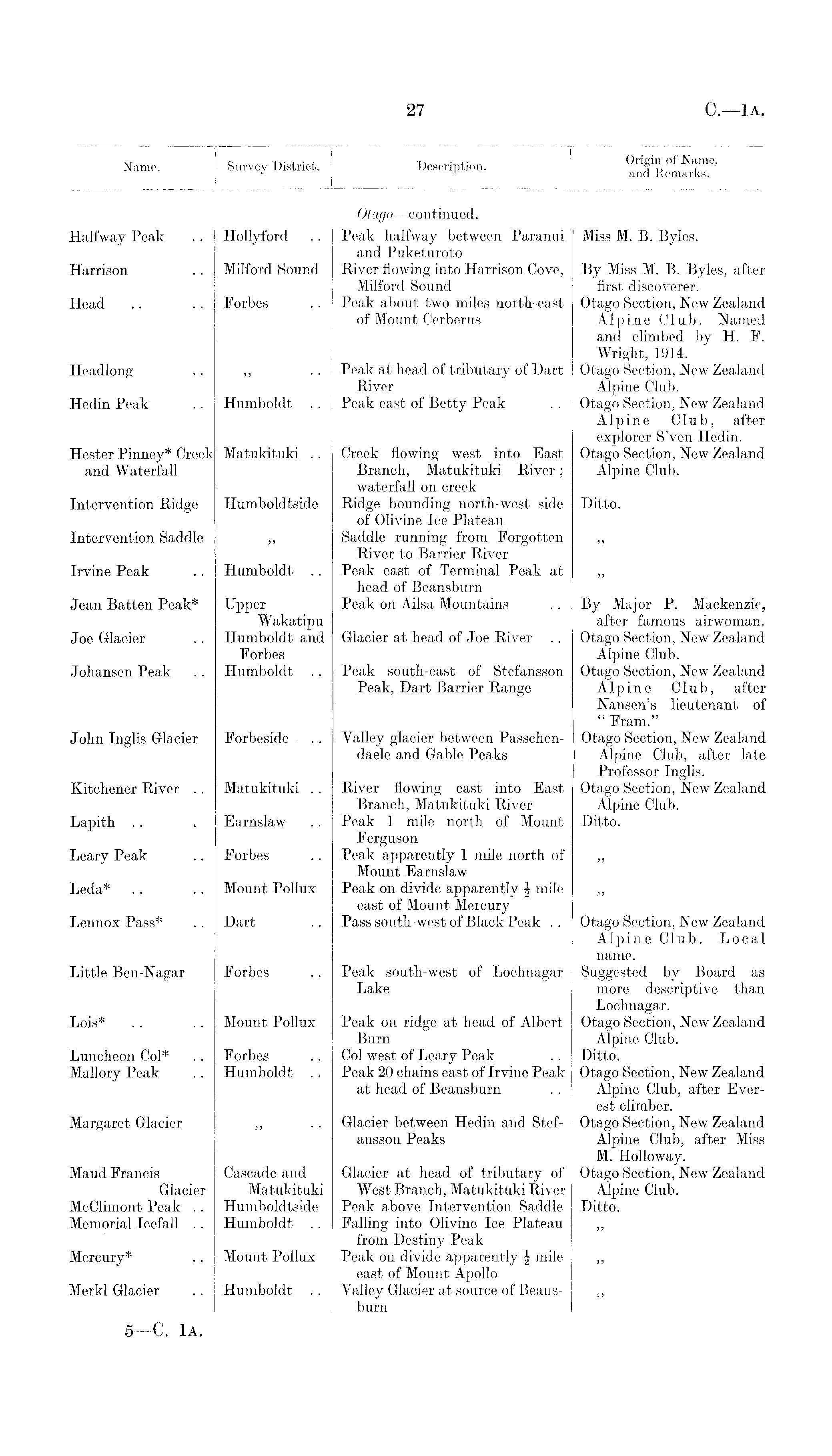Name. Survey District. Description. j *R(marks*' Otago —continued. Halfway Peak . . Hollyford . . Peak halfway between Paranui Miss M. B. Byles. and Puketuroto Harrison .. Milford Sound River flowing into Harrison Cove, By Miss M. B. Byles, after Milford Sound first discoverer. Head .. .. Forbes . . Peak about two miles north-east Otago Section, New Zealand of Mount Cerberus Alpine Club. Named and climbed by H. F. Wright, 1914. Headlong .. „ .. Peak at head of tributary of Dart Otago Section, New Zealand River Alpine Club. Hedin Peak .. Humboldt .. Peak east of Betty Peak .. Otago Section, New Zealand Alpine Club, after explorer S'ven Hedin. Hester Pinney* Creek Matukituki .. Creek flowing west into East Otago Section, New Zealand and Waterfall Branch, Matukituki River; Alpine Club. waterfall on creek Intervention Ridge Humboldtside Ridge bounding north-west side Ditto. of Olivine Ice Plateau Intervention Saddle „ Saddle running from Forgotten „ River to Barrier River Irvine Peak .. Humboldt .. Peak east of Terminal Peak at ,, head of Beansburn Jean Batten Peak* Upper Peak on Ailsa Mountains .. By Major P. Mackenzie, Wakatipu after famous airwoman. Joe Glacier .. Humboldt and Glacier at head of Joe River .. Otago Section, New Zealand Forbes Alpine Club. Johansen Peak .. Humboldt .. Peak south-east of Stefansson Otago Section, New Zealand Peak, Dart Barrier Range Alpine Club, after Nansen's lieutenant of " Fram." John Inglis Glacier Forbeside • .. Valley glacier between Passchen- Otago Section, New Zealand daele and Gable Peaks Alpine Club, after late Professor Inglis. Kitchener River .. Matukituki . . River flowing east into East Otago Section, New Zealand Branch, Matukituki River Alpine Club. Lapith .. . Earnslaw .. Peak 1 mile north of Mount Ditto. Ferguson Leary Peak .. Forbes .. Peak apparently 1 mile north of ,, Mount Earnslaw Leda* . . .. Mount Pollux Peak on divide apparently J mile ,, east of Mount Mercury Lennox Pass* .. Dart .. Pass south-west of Black Peak .. Otago Section, New Zealand Alpine Club. Local name. Little Ben-Nagar Forbes . . Peak south-west of Lochnagar Suggested by Board as Lake more descriptive than Lochnagar. Lois* .. .. Mount Pollux Peak on ridge at head of Albert Otago Section, New Zealand Burn Alpine Club. Luncheon Col* .. Forbes .. Col west of Leary Peak .. Ditto. Mallory Peak . . Humboldt .. Peak 20 chains east of Irvine Peak Otago Section, New Zealand at head of Beansburn .. Alpine Club, after Everest climber. Margaret Glacier „ .. Glacier between Hedin and Stef- Otago Section, New Zealand ansson Peaks Alpine Club, after Miss M. Holloway. Maud Francis Cascade and Glacier at head of tributary of Otago Section, New Zealand Glacier Matukituki West Branch, Matukituki River Alpine Club. McClimont Peak .. Humboldtside Peak above Intervention Saddle Ditto. Memorial Icefall .. Humboldt .. Falling into Olivine Ice Plateau ,, from Destiny Peak Mercury* .. Mount Pollux Peak on divide apparently | mile ,, east of Mount Apollo Merkl Glacier .. Humboldt .. Valley Glacier at source of Beans- „ burn I