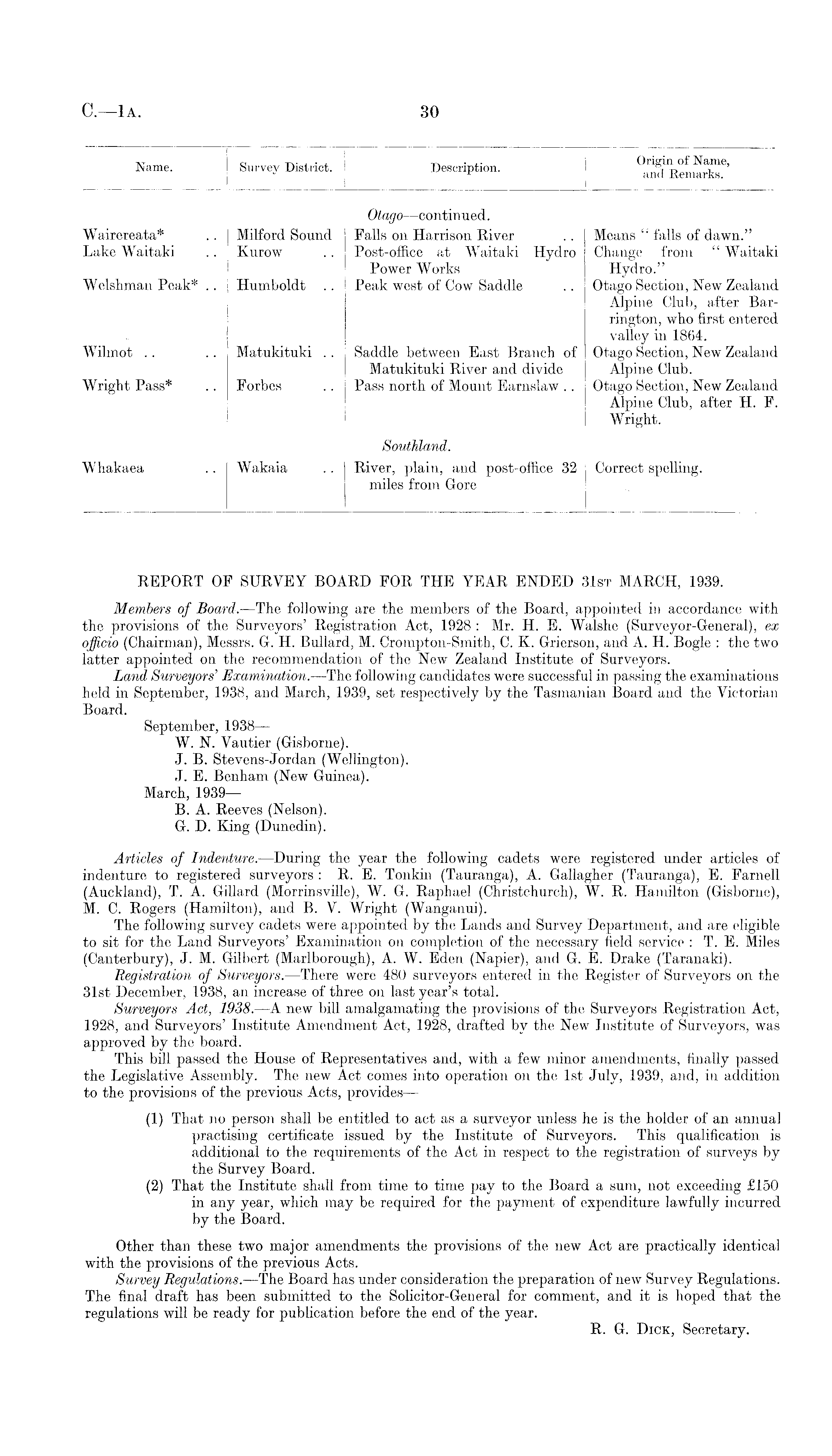REPORT OF SURVEY BOARD FOR THE YEAR ENDED 31st MARCH, 1939. Members of Board. —The following are the members of the Board, appointed in accordance with the provisions of the Surveyors' Registration Act, 1928 : Mr. H. E. Walshe (Surveyor-General), ex officio (Chairman), Messrs. G. H. Bullard, M. Crompton-Smith, C. K. Grierson, and A. H. Bogle : the two latter appointed on the recommendation of the New Zealand Institute of Surveyors. Land Surveyors' Examination. —The following candidates were successful in passing the examinations held in September, 1938, and March, 1939, set respectively by the Tasmanian Board and the Victorian Board. September, 1938 — W. N. Vautier (Gisborne). J. B. Stevens-Jordan (Wellington). J. E. Benham (New Guinea). March, 1939— B. A. Reeves (Nelson). G. D. King (Dunedinj. Articles of Indenture. —During the year the following cadets were registered under articles of indenture to registered surveyors : R. E. Tonkin (Tauranga), A. Gallagher (Tauranga), E. Farnell (Auckland), T. A. Gillard (Morrinsville), W. G. Raphael (Christchurch), W. R. Hamilton (Gisborne), M. C. Rogers (Hamilton), and B. V. Wright (Wanganui). The following survey cadets were appointed by the Lands and Survey Department, and are eligible to sit for the Land Surveyors' Examination on completion of the necessary field service : T. E. Miles (Canterbury), J. M. Gilbert (Marlborough), A. W. Eden (Napier), and G. E. Drake (Taranaki). Registration of Surveyors. —There were 480 surveyors entered in the Register of Surveyors on the 31st December, 1938, an increase of three on last year's total. Surveyors Act, 1938. —A new bill amalgamating the provisions of the Surveyors Registration Act, 1928, and Surveyors' Institute Amendment Act, 1928, drafted by the New Institute of Surveyors, was approved by the board. This bill passed the House of Representatives and, with a few minor amendments, finally passed the Legislative Assembly. The new Act comes into operation on the Ist July, 1939, and, in addition to the provisions of the previous Acts, provides— (1) That no person shall be entitled to act as a surveyor unless he is the holder of an annual practising certificate issued by the Institute of Surveyors. This qualification is additional to the requirements of the Act in respect to the registration of surveys by the Survey Board. (2) That the Institute shall from time to time pay to the Board a sum, not exceeding £150 in any year, which may be required for the payment of expenditure lawfully incurred by the Board. Other than these two major amendments the provisions of the new Act are practically identical with the provisions of the previous Acts. Survey Regulations.—The Board has under consideration the preparation of new Survey Regulations. The final draft has been submitted to the Solicitor-General for comment, and it is hoped that the regulations will be ready for publication before the end of the year. R. G. Dick, Secretary.