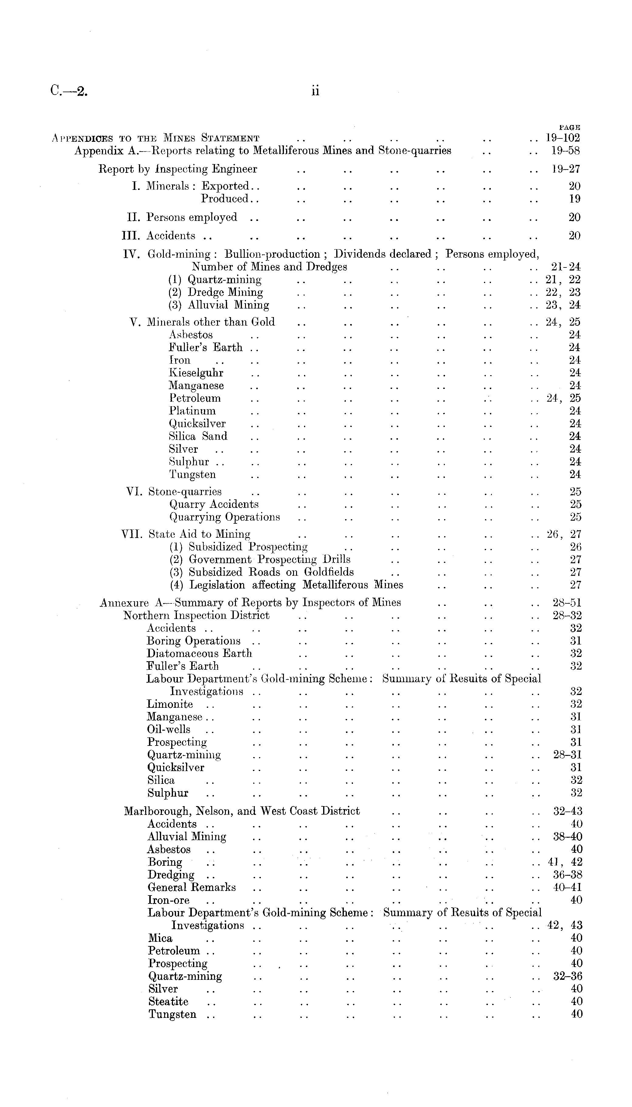 A PPENDIOES TO THE MINES STATEMENT . . . . . . . . . . . . 19-102 Appendix A.—Reports relating to Metalliferous Mines and Stone-quarries .. .. 19-58 Report by Inspecting Engineer .. .. .. .. .. .. 19-27 I. Minerals: Exported.. .. .. .. .. .. .. 20 Produced.. .. .. .. .. .. .. 19 11. Persons employed .. .. .. .. .. .. .. 20 111. Accidents .. .. .. .. .. .. .. .. 20 IV. Gold-mining : Bullion-production ; Dividends declared ; Persons employed, Number of Mines and Dredges .. .. .. .. 21-24 (1) Quartz-mining .. .. .. .. .. .. 21, 22 (2) Dredge Mining .. .. .. .. .. .. 22, 23 (3) Alluvial Mining .. .. .. .. .. .. 23, 24 Y. Minerals other than Gold .. .. .. .. .. .. 24, 25 Asbestos .. .. .. .. .. .. .. 24 Fuller's Earth .. .. .. .. .. .. . . 24 Iron .. .. .. .. .. .. .. .. 24 Kieselguhr .. .. .. .. .. .. .. 24 Manganese .. .. .. .. .. .. .. 24 Petroleum .. .. .. .. .. .. .. 24, 25 Platinum .. .. .. .. .. .. .. 24 Quicksilver .. .. .. .. .. .. .. 24 Silica Sand . . .. . . .. .. . . . . 24 Silver .. .. .. .. .. .. .. .. 24 Sulphur .. .. .. .. .. .. .. .. 24 Tungsten .. .. .. .. .. .. .. 24 VI. Stone-quarries .. .. .. .. .. .. .. 25 Quarry Accidents .. .. .. .. .. .. 25 Quarrying Operations .. .. .. .. .. .. 25 VII. State Aid to Mining .. .. .. .. .. .. 26, 27 (1) Subsidized Prospecting .. .. .. .. .. 26 (2) Government Prospecting Drills .. .. .. . . 27 (3) Subsidized Roads on Goldfields .. .. .. .. 27 (4) Legislation affecting Metalliferous Mines .. .. .. 27 Annexure A—Summary of Reports by Inspectors of Mines .. .. .. 28-51 Northern Inspection District .. .. .. .. .. .. 28-32 Accidents .. .. .. .. .. .. .. .. 32 Boring Operations .. .. .. .. .. .. .. 31 Diatomaceous Earth .. .. .. .. .. .. 32 Fuller's Earth .. .. . . .. .. .. .. 32 Labour Department's Gold-mining Scheme: Summary of Resuits of Special Investigations .. .. .. .. .. .. .. 32 Limonite .. .. .. .. .. .. .. .. 32 Manganese .. .. .. .. .. .. .. .. 31 Oil-wells .. .. .. .. .. .. .. .. 31 Prospecting .. .. .. .. .. .. .. 31 Quartz-mining .. .. .. .. .. .. .. 28-31 Quicksilver .. .. .. .. .. .. .. 31 Silica .. .. .. .. .. .. .. .. 32 Sulphur .. .. .. .. .. .. .. .. 32 Marlborough, Nelson, and West Coast District .. .. .. .. 32-43 Accidents .. .. .. .. .. .. .. .. 40 Alluvial Mining .. .. .. .. .. .. .. 38-40 Asbestos .. .. .. .. .. .. .. .. 40 Boring .. .. .. .. .. .. .. .. 4], 42 Dredging .. .. .. .. .. .. .. .. 36-38 General Remarks .. .. .. .. .. .. .. 40-41 Iron-ore .. .. .. .. .. .. .. 40 Labour Department's Gold-mining Scheme : Summary of Results of Special Investigations .. .. .. .. .. .. .. 42, 43 Mica .. .. .. .. .. .. .. .. 40 Petroleum .. .. .. .. .. .. .. .. 40 Prospecting ..... .. .. .. . .. 40 Quartz-mining .. .. .. .. .. .. . . 32-36 Silver .. .. .. .. .. .. .. .. 40 Steatite .. .. .. .. .. .. .. .. 40 Tungsten .. .. .. .. .. .. .. .. 40