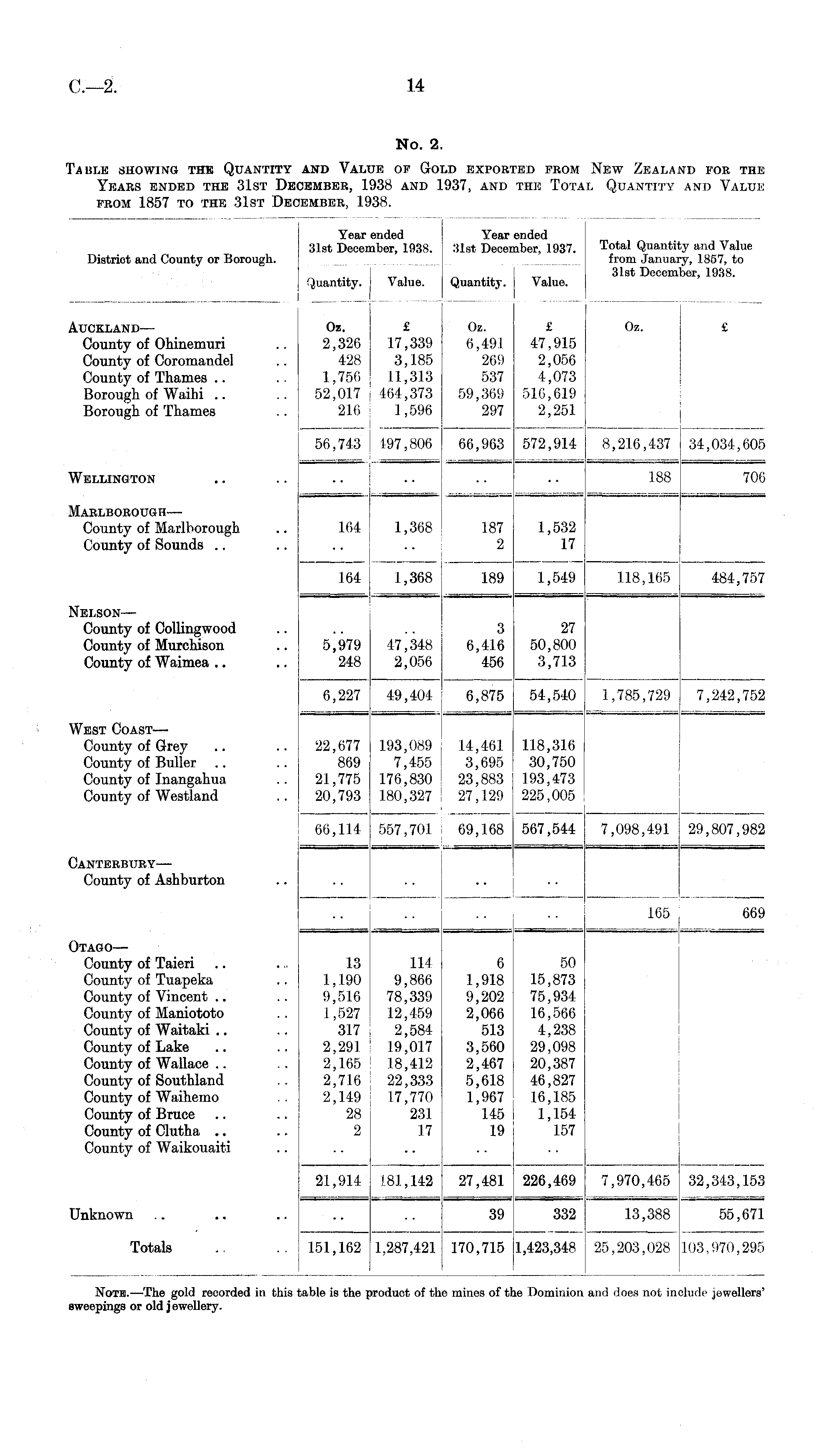 No. 2. Table showing the Quantity and Value of Gold exported from New Zealand for the Years ended the 31st December, 1938 and 1937, and the Total Quantity and Value from 1857 to the 31st December, 1938.