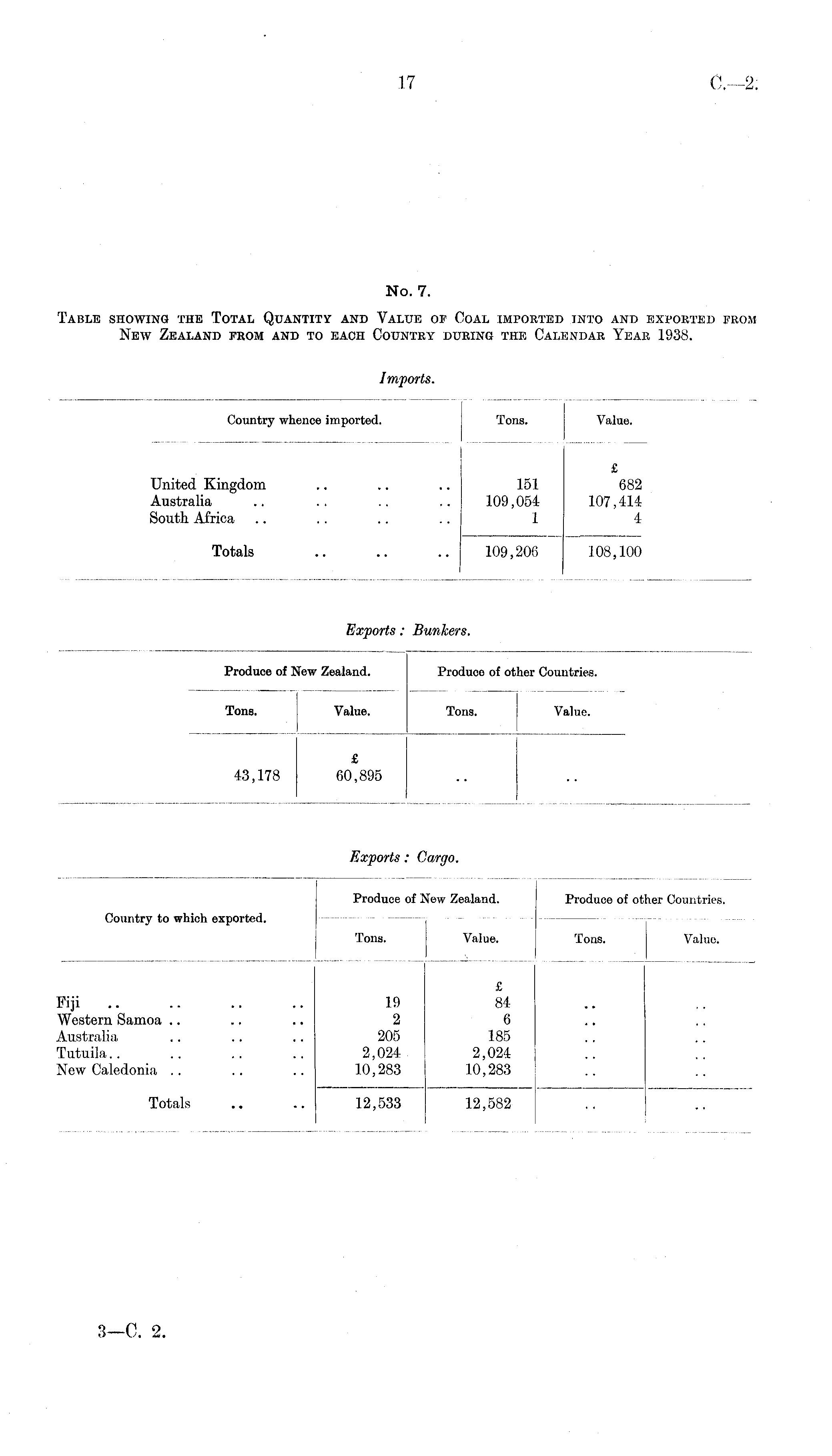 No. 7. Table showing the Total Quantity and Value of Coal imported into and exported from New Zealand from and to each Country during the Calendar Year 1938. Imports.