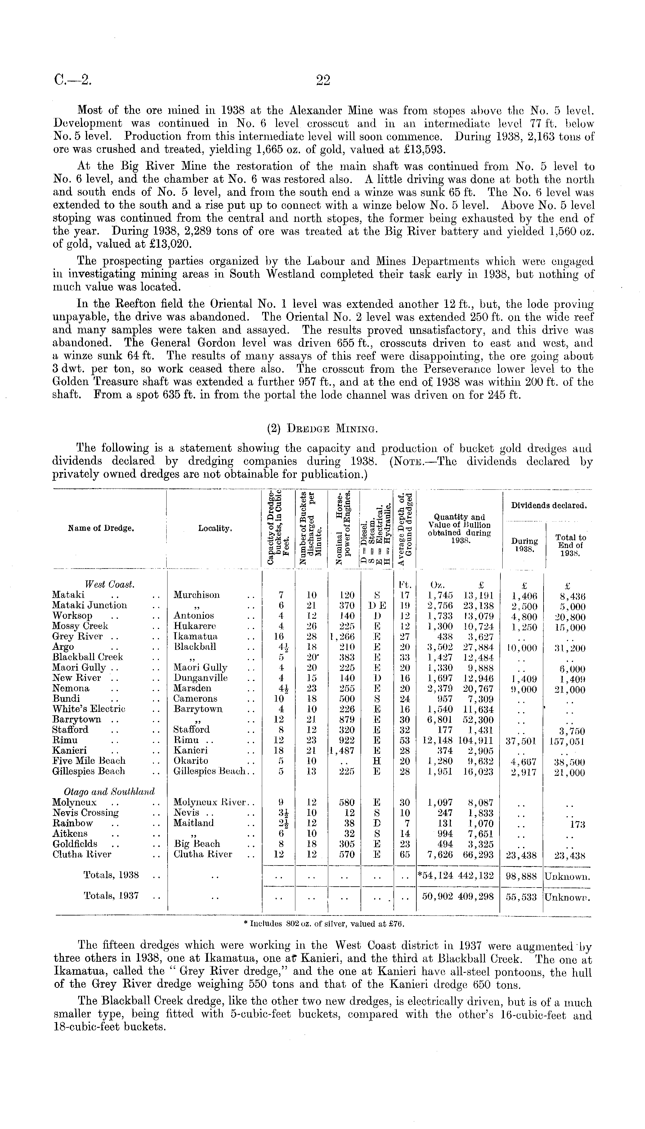 Most of the ore mined in 1938 at the Alexander Mine was from stopes above the No. 5 level. Development was continued in No. 6 level crosscut and in an intermediate levpl 77 ft. below No. 5 level. Production from this intermediate level will soon commence. During 1938, 2,163 tons of ore was crushed and treated, yielding 1,665 oz. of gold, valued at £13,593. At the Big River Mine the restoration of the main shaft was continued from No. 5 level to No. 6 level, and the chamber at No. 6 was restored also. A little driving was done at both the north and south ends of No. 5 level, and from the south end a winze was sunk 65 ft. The No. 6 level was extended to the south and a rise put up to connect with a winze below No. 5 level. Above No. 5 level stoping was continued from the central and north stopes, the former being exhausted by the end of the year. During 1938, 2,289 tons of ore was treated at the Big River battery and yielded 1,560 oz. of gold, valued at £13,020. The prospecting parties organized by the Labour and Mines Departments which were engaged in investigating mining areas in South Westland completed their task early in 1938, but nothing of much value was located. In the Reefton field the Oriental No. 1 level was extended another 12 ft., but, the lode proving unpayable, the drive was abandoned. The Oriental No. 2 level was extended 250 ft. on the wide reef and many samples were taken and assayed. The results proved unsatisfactory, and this drive was abandoned. The General Gordon level was driven 655 ft., crosscuts driven to east and west, and a winze sunk 64 ft. The results of many assays of this reef were disappointing, the ore going about 3 dwt. per ton, so work ceased there also. The crosscut from the Perseverance lower level to the Golden Treasure shaft was extended a further 957 ft., and at the end of 1938 was within 200 ft. of the shaft. From a spot 635 ft. in from the portal the lode channel was driven on for 245 ft. (2) Dredge Mining. The following is a statement showing the capacity and production of bucket gold dredges and dividends declared by dredging companies during 1938. (Note. —The dividends declared by privately owned dredges are not obtainable for publication.)