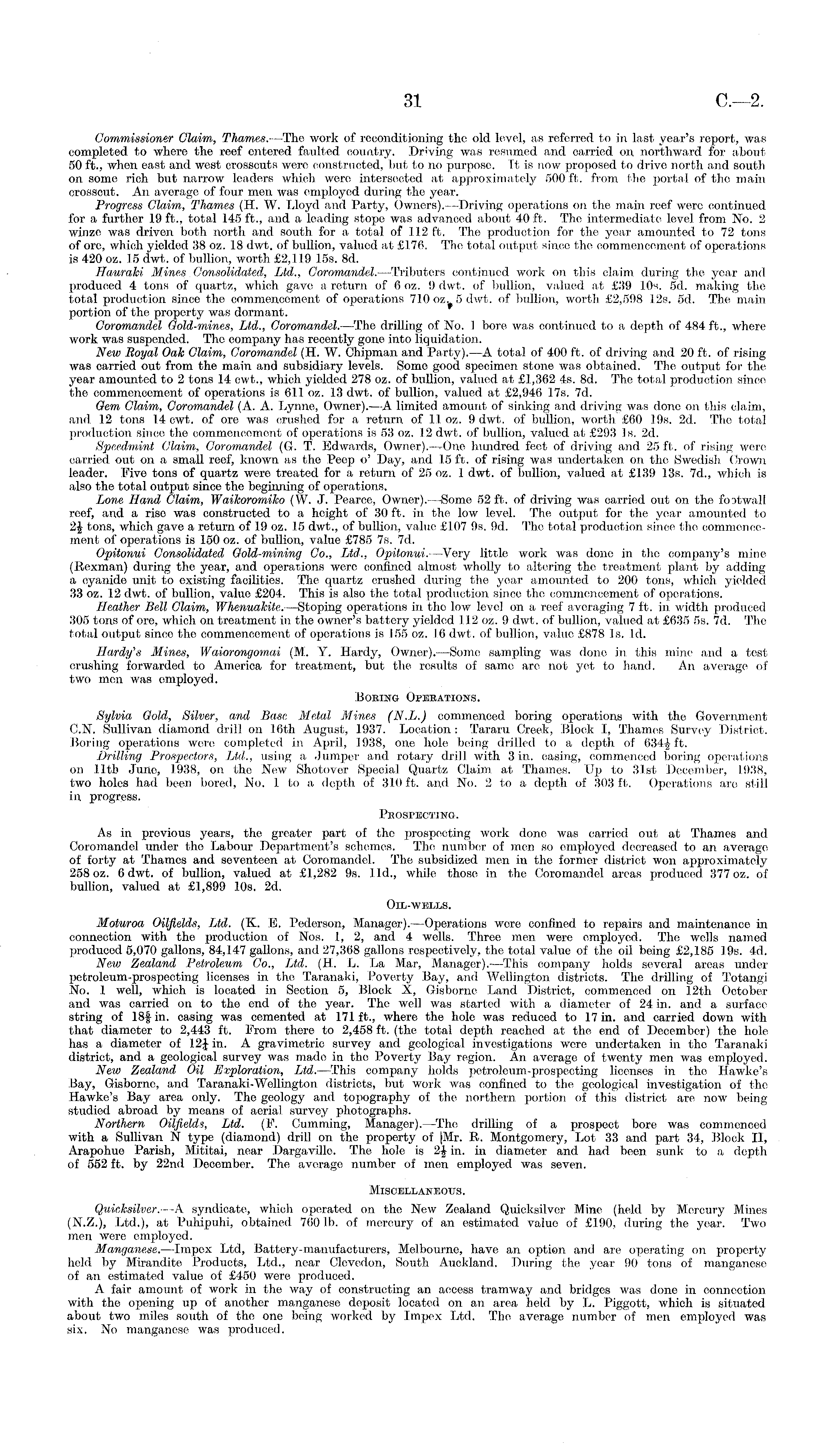 Commissioner Claim, Thames. —The work of reconditioning the old level, as referred to in last year's report, was completed to where the reef entered faulted country. Driving was resumed and carried on northward for about 50 ft., when east and west crosscuts were constructed, but to no purpose. Tt is now proposed to drive north and south on some rich but narrow leaders which were intersected at approximately 500 ft. from the portal of the main crosscut. An average of four men was employed during the year. Progress Claim, Thames (H. W. Lloyd and Party, Owners). —Driving operations on the main reef were continued for a further 19 ft., total 145 ft., and a leading stope was advanced about 40 ft. The intermediate level from No. 2 winze was driven both north and south for a total of 112 ft. The production for the yoar amounted to 72 tons of ore, which yielded 38 oz. 18 dwt. of bullion, valued at £176. The total output since the commencement of operations is 420 oz. 15 dwt. of bullion, worth £2,119 15s. Bd. Hauraki Mines Consolidated, Ltd., Coromandel.—Tributers continued work on this claim during the year and produced 4 tons of quartz, which gave a return of 0 oz. 9 dwt. of bullion, valued at £39 10s. sd. making the total production since the commencement of operations 710 5 dwt. of bullion, worth £2,598 12s. sd. The main portion of the property was dormant. Coromandel Gold-mines, Ltd., Coromandel. —The drilling of No. 1 bore was continued to a depth of 484 ft., where work was suspended. The company has recently gone into liquidation. New Royal Oak Claim, Coromandel (H. W. Chipman and Party).—A total of 400 ft. of driving and 20 ft. of rising was carried out from the main and subsidiary levels. Some good specimen stone was obtained. The output for the year amounted to 2 tons 14 cwt., which yielded 278 oz. of bullion, valued at £1,362 4s. Bd. The total production since the commencement of operations is 611 oz. 13 dwt. of bullion, valued at £2,946 17s. 7d. Oem Claim, Coromandel (A. A. Lynne, Owner).—A limited amount of sinking and driving was done on this claim, and 12 tons 14 cwt. of ore was crushed for a return of 11 oz. 9 dwt. of bullion, worth £60 19s. 2d. The total production since the commencement of operations is 53 oz. 12 dwt. of bullion, valued at £293 Is. 2d. Speedmint Claim, Coromandel (G. T. Edwards, Owner).—-One hundred feet of driving and 25 ft. of rising were carried out oil a small reef, known as the Peep o' Day, and 15 ft. of rising was undertaken on the Swedish Crown leader. Five tons of quartz were treated for a return of 25 oz. 1 dwt. of bullion, valued at £139 13s. 7d., which is also the total output since the beginning of operations. Lone Hand Claim, Waikoromiko (W. J. Pearee, Owner). —Some 52 ft. of driving was carried out on the foatwall reef, and a rise was constructed to a height of 30 ft. in the low level. The output for the year amounted to 2J tons, which gave a return of 19 oz. 15 dwt., of bullion, value £107 9s. 9d. The total production since the commencement of operations is 150 oz. of bullion, value £785 7s. 7d. Opitonui Consolidated Gold-mining Co., Ltd., Opitonui.—Very little work was done in the company's mine (Rexman) during the year, and operations were confined almost wholly to altering the treatment plant by adding a cyanide unit to existing facilities. The quartz crushed during the yoar amounted to 200 tons, which yielded 33 oz. 12 dwt. of bullion, value £204. This is also the total production since the commencement of operations. Heather Bell Claim, Whenuakite. —Stoping operations in the low level on a reef averaging 7 ft. in width produced 305 tons of ore, which on treatment in the owner's battery yielded 112 oz. 9 dwt. of bullion, valued at £635 ss. 7d. The total output since the commencement of operations is 155 oz. 16 dwt. of bullion, value £878 Is. Id. Hardy's Mines, Waiorongomai (M. Y. Hardy, Owner). —Some sampling was done in this mine and a test crushing forwarded to America for treatment, but the results of same are not yet to hand. An average of two men was employed. Bobing Operations. Sylvia Gold, Silver, and Base Metal Mines (N.L.) commenced boring operations with the Government C.N. Sullivan diamond drill on 16th August, 1937. Location: Tararu Creek, Block I, Thames Survey District. Boring operations were completed in April, 1938, one hole being drilled to a depth of 634| ft. Drilling Prospectors, Ltd., using a Jumper and rotary drill with 3 in. casing, commenced boring operations on lltb June, 1938, on the New Shotover Special Quartz Claim at Thames. Up to 31st December, 1938, two holes had been bored, No. 1 to a depth of 310 ft. and No. 2to a depth of 303 ft. Operations are still in progress. Prospecting. As in previous years, the greater part of the prospecting work done was carried out at Thames and Coromandel under the Labour Department's schemes. The number of men so employed decreased to an average of forty at Thames and seventeen at Coromandel. The subsidized men in the former district won approximately 258 oz. 6 dwt. of bullion, valued at £1,282 9s. lid., while those in the Coromandel areas produced 3770z. of bullion, valued at £1,899 10s. 2d. Oil-wells. Moturoa Oilfields, Ltd. (K. E. Pederson, Manager).—Operations were confined to repairs and maintenance in connection with the production of Nos. 1, 2, and 4 wells. Three men were employed. The wells named produced 5,070 gallons, 84,147 gallons, and 27,368 gallons respectively, the total value of the oil being £2,185 19s. 4d. New Zealand Petroleum Co., Ltd. (H. L. La Mar, Manager). -This company holds several areas under petroleum-prospecting licenses in the Taranaki, Poverty Bay, and Wellington districts. The drilling of Totangi No. 1 well, which is located in Section 5, Block X, Gisborne Land District, commenced on 12th October and was carried on to the end of the year. The well was started with a diameter of 24 in. and a surface string of 18