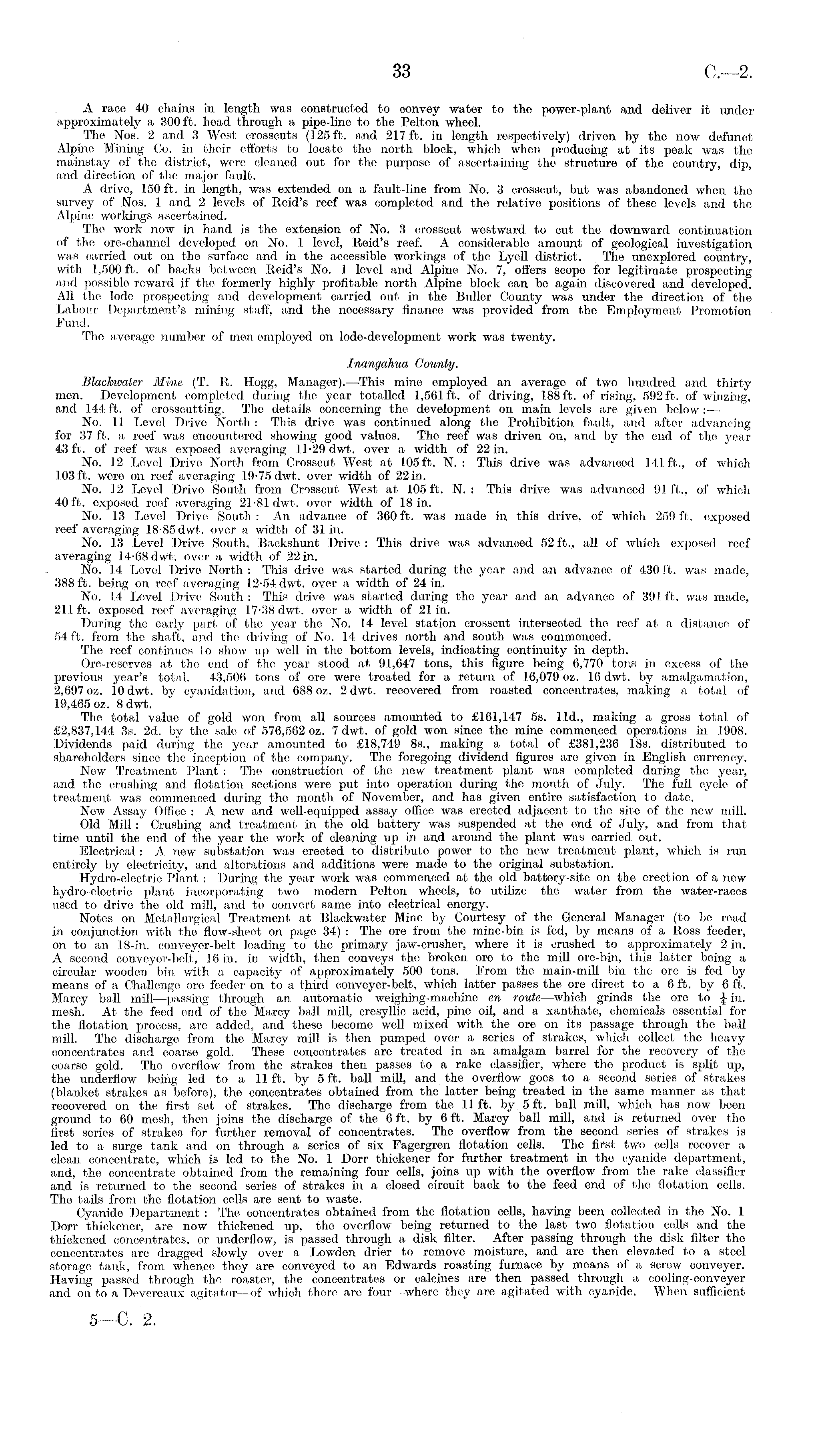 A race 40 chains in length was constructed to convey water to the power-plant and deliver it under approximately a 300 ft. head through a pipe-lino to the Pelton wheel. The Nos. 2 and 3 West crosscuts (125 ft. and 217 ft. in length respectively) driven by the now defunct Alpine Mining Co. in their efforts to locate the north block, which when producing at its peak was the mainstay of the district, were cleaned out for the purpose of ascertaining the structure of the country, dip, and direction of the major fault. A drive, 150 ft. in length, was extended on a fault-line from No. 3 crosscut, but was abandoned when the survey of Nos. 1 and 2 levels of Reid's reef was completed and the relative positions of these levels and the Alpine workings ascertained. The work now in hand is the extension of No. 3 crosscut westward to cut the downward continuation of the ore-channel developed on No. 1 level, Reid's reef. A considerable amount of geological investigation was carried out on the surface and in the accessible workings of the Lyell district. The unexplored country, with 1,500 ft. of backs between Reid's No. 1 level and Alpine No. 7, offers scope for legitimate prospecting and possible reward if the formerly highly profitable north Alpine block can be again discovered and developed. All the lode prospecting and development carried out in the Buller County was under the direction of the Labour Department's mining staff, and the necessary finance was provided from the Employment Promotion Fund. The average number of men employed on lode-development work. was twenty. Inangahua County. Blaclcwater Mine (T. R. Hogg, Manager).—This mine employed an average of two hundred and thirty men. Development completed during the year totalled 1,561 ft. of driving, 1.88 ft. of rising, 592 ft. of winzing, and 144 ft. of crosscutting. The details concerning the development on main levels are given below :— No. 11 Level Drive North: This drive was continued along the Prohibition fault, and after advancing for 37 ft. a reef was encountered showing good values. The reef was driven on, and by the end of the year 43 ft. of reef was exposed averaging 11-29 dwt. over a width of 22 in. No. 12 Level Drive North from Crossout West at 105 ft. N. : This drive was advanced 141 ft., of which 103 ft. were on reef averaging 19-75 dwt. over width of 22 in. No. 12 Level Drive South from Crosscut West at 105 ft. N. : This drive was advanced 91 ft., of which 40 ft. exposed reef averaging 21-81 dwt. over width of 18 in. No. 13 Level Drive South: An advance of 360 ft. was made in this drive, of which 259 ft. exposed reef averaging 18-85 dwt. over a width of 31 in. No. 13 Level Drive South, Backshunt Drive : This drive was advanced 52 ft., all of which exposed reef averaging 14-68 dwt: over a width of 22 in. No. 14 Level Drive North : This drive was started during the year and an advance of 430 ft. was made, 388 ft. being on reef averaging 12-54 dwt. over a width of 24 in. No. 14 Level Drive South : This drive was started during the year and an advance of 391 ft. was made, 211 ft. exposed reef averaging 17-38 dwt. over a width of 21 in. During the early part of the year the No. 14 level station crosscut intersected the reef at a distance of 54 ft. from the shaft, and the driving of No. 14 drives north and south was commenced. The reef continues to show up well in the bottom levels, indicating continuity in depth. Ore-reserves at the end of the year stood at 91,647 tons, this figure being 6,770 tons in excess of the previous year's total. 43,506 tons of ore were treated for a return of 16,079 oz. 16 dwt. by amalgamation, 2,697 oz. 10 dwt. by cyanidation, a7id 688 oz. 2 dwt. recovered from roasted concentrates, making a total of 19,465 oz. 8 dwt. The total value of gold won from all sources amounted to £161,147 ss. lid., making a gross total of £2,837,144 3s. 2d. by the sale of 576,562 oz. 7 dwt. of gold won since the mine commenced operations in 1908. Dividends paid during the year amounted to £18,749 Bs., making a total of £381,236 18s. distributed to shareholders since the inception of the company. The foregoing dividend figures are given in English currency. New Treatment Plant : The construction of the new treatment plant was completed during the year, and the crushing and flotation sections were put into operation during the month of July. The full cycle of treatment was commenced during the month of November, and has given entire satisfaction to date. New Assay Office : A new and well-equipped assay office was erected adjacent to the site of the new mill. Old Mill: Crushing and treatment in the old battery was suspended at the end of July, and from that time until the end of the year the work of cleaning up in and around the plant was carried out. Electrical : A new substation was erected to distribute power to the new treatment plant, which is run entirely by electricity, and alterations and additions were made to the original substation. Hydro-electric Plant : During the year work was commenced at the old battery-site on the erection of a now hydro electric plant incorporating two modern Pelton wheels, to utilize the water from the water-races used to drive the old mill, and to convert same into electrical energy. Notes on Metallurgical Treatment at Blackwater Mine by Courtesy of the General Manager (to be road in conjunction with the flow-sheet on page 34) : The ore from the mine-bin is fed, by means of a Ross feeder, on to an 18-in. conveyer-belt leading to the primary jaw-crusher, where it is crushed to approximately 2 in. A second oonveyer-belt, 16 in. in width, then conveys the broken ore to the mill ore-bin, this latter being a circular wooden bin with a capacity of approximately 500 tons. From the main-mill bin the ore is fod by means of a Challenge ore feeder on to a third conveyer-belt, which latter passes the ore direct to a 6 ft. by 6 ft. Marcy ball mill —passing through an automatic weighing-machine en ro