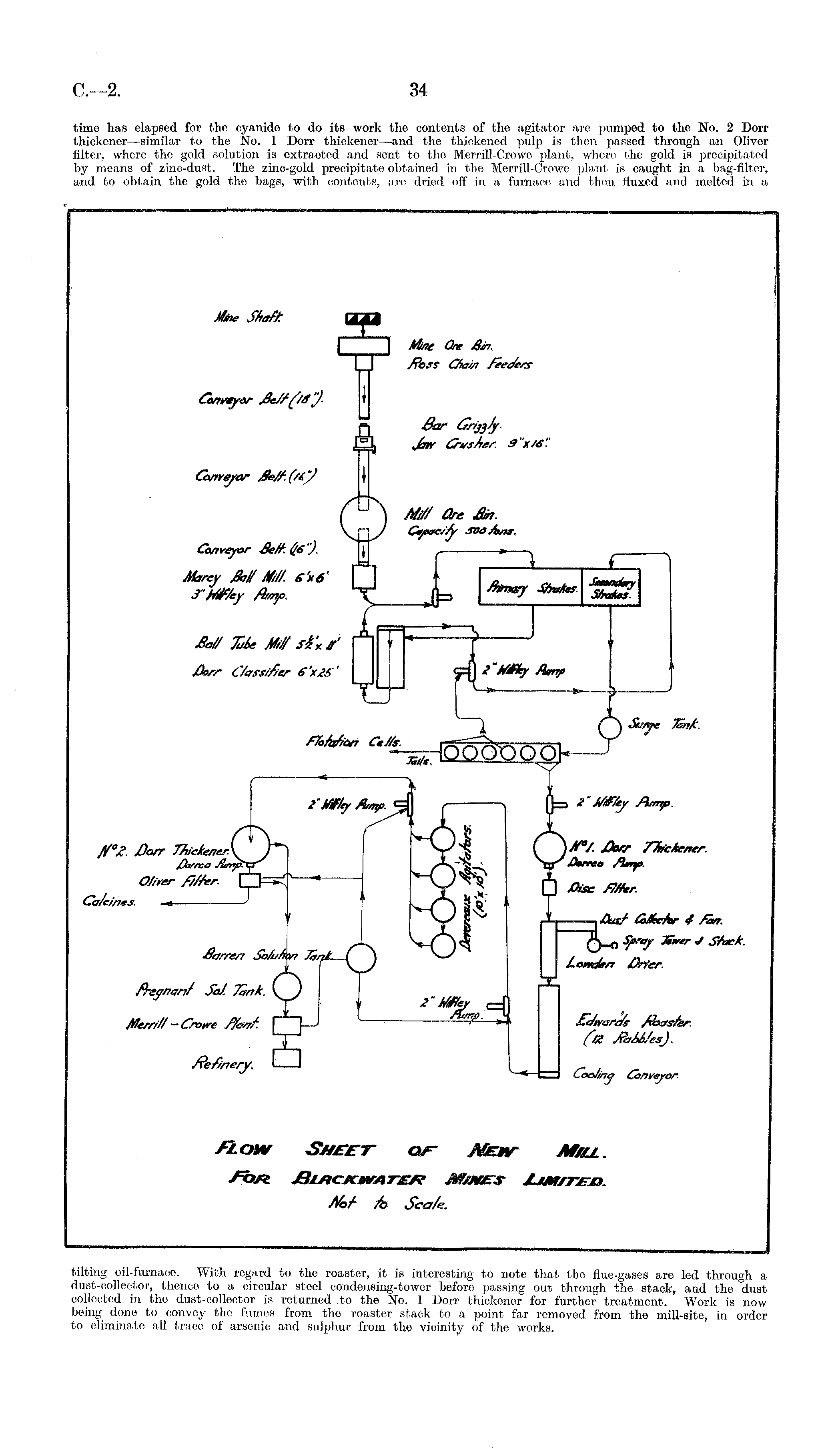 time has elapsed for the cyanide to do its work the contents of the agitator are pumped to the No. 2 Dorr thickener—similar to the No. 1 Dorr thickener—and the thickened pulp is then passed through an Oliver filter, whore the gold solution is oxtraoted and sent to the Merrill-Crowe plant, where the gold is precipitated by means of zinc-dust. The zinc-gold precipitate obtained in the Merrill-Crowe plant is caught in a bag-filter, and to obtain tho gold the bags, with contents, are dried off in a furnace and then fluxed and melted in a