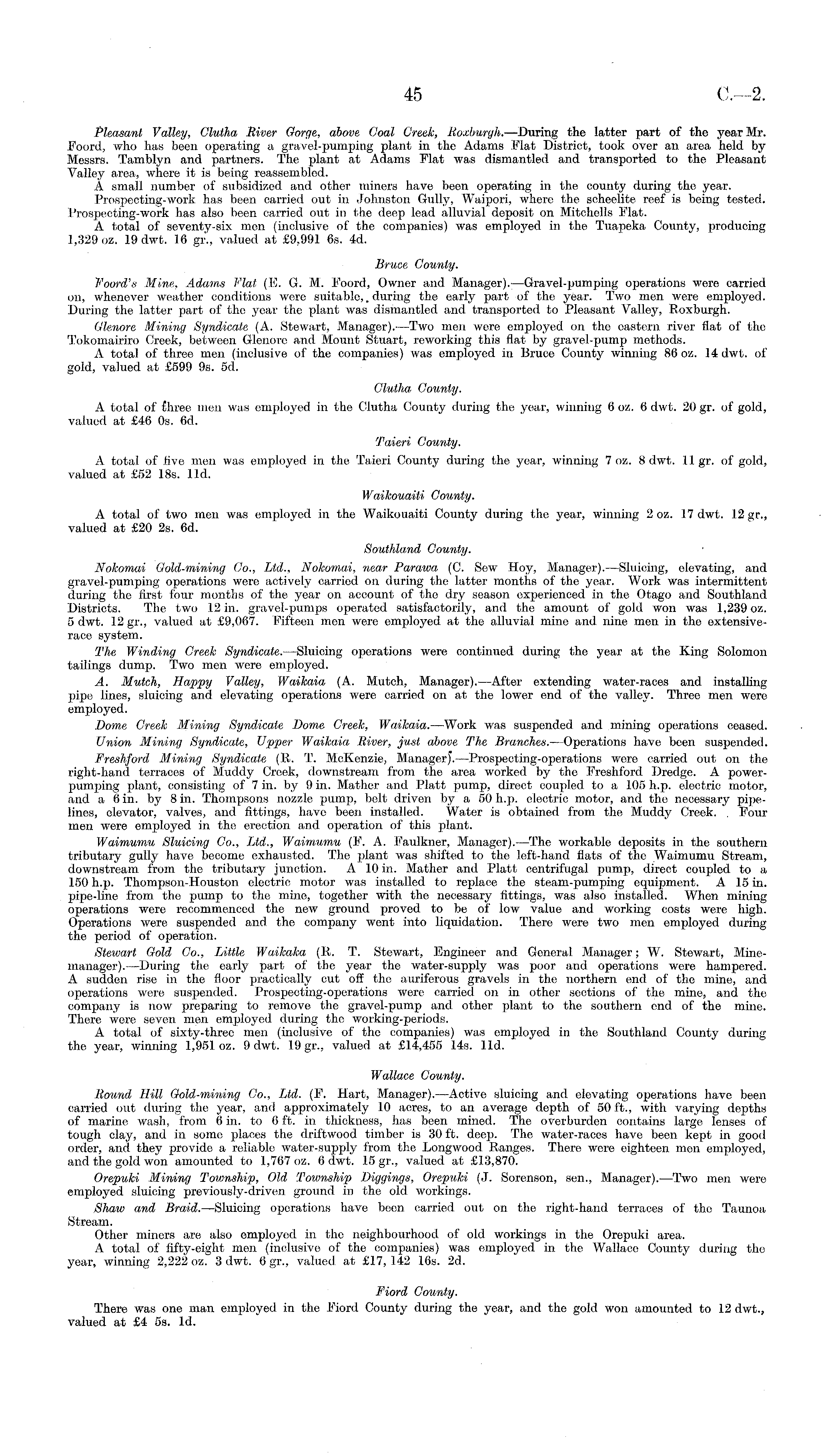 Pleasant Valley, Clutha River Gorge, above Goal Creek, Roxburgh.—During the latter part of the year Mr. Foord, who has been operating a gravel-pumping plant in the Adams Flat District, took over an area held by Messrs. Tamblyn and partners. The plant at Adams Flat was dismantled and transported to the Pleasant Valley area, where it is being reassembled. A small number of subsidized and other miners have been operating in the county during the year. Prospecting-work has been carried out in Johnston Gully, Waipori, where the scheelite reef is being tested. Prospecting-work has also been carried out in the deep lead alluvial deposit on Mitchells Flat. A total of seventy-six men (inclusive of the companies) was employed in the Tuapeka County, producing 1,329 oz. 19 dwt. 16 gr., valued at £9,991 6s. 4d. Bruce County. Voord's Mine, Adams Flat (E. G. M. Foord, Owner and Manager).;— Gravel-pumping operations were carried on, whenever weather conditions were suitable,. during the early part of the year. Two men were employed. During the latter part of the year the plant was dismantled and transported to Pleasant Valley, Roxburgh. Gle.nore Mining Syndicate (A. Stewart, Manager).—Two men wore employed on the eastern river flat of the Tokomairiro Creek, between Glenore and Mount Stuart, reworking this flat by gravel-pump methods. A total of three men (inclusive of the companies) was employed in Bruce County winning 86 oz. 14 dwt. of gold, valued at £599 9s. sd. Clutha. County. A total of fhree men was employed in the Clutha County during the year, winning 6 oz. 6 dwt. 20 gr. of gold, valued at £46 os. 6d. Taieri County. A total of Jive men was employed in the Taieri County during the year, winning 7 oz. 8 dwt. 11 gr. of gold, valued at £52 18s. lid. Wailcouaiti County. A total of two men was employed in the Waikouaiti County during the year, winning 2 oz. 17 dwt. 12 gr., valued at £20 2s. 6d. Southland County. Nokomai Gold-mining Co., Ltd., Nokomai, near Parawa (C. Sew Hoy, Manager).—Sluicing, elevating, and gravel-pumping operations were actively carried on during the latter months of the year. Work was intermittent during the first four months of the year on account of the dry season experienced in the Otago and Southland Districts. The two 12 in. gravel-pumps operated satisfactorily, and the amount of gold won was 1,239 oz. 5 dwt. 12 gr., valued at £9,067. Fifteen men were employed at the alluvial mine and nine men in the extensiverace system. The Winding Creek Syndicate.—Sluicing operations were continued during the year at the King Solomon tailings dump. Two men were employed. A. Mutch, Happy Valley, Waikaia (A. Mutch, Manager).—After extending water-races and installing pipe lines, sluicing and elevating operations were carried on at the lower ond of the valley. Three men were employed. Dome Creek Mining Syndicate Dome Creek, Waikaia.—Work was suspended and mining operations ceased. Union Mining Syndicate, Upper Waikaia River, just above The Branches.—Operations have been suspended. Freshford Mining Syndicate (R. T. McKenzie, Manager).—Prospecting-operations were carried out on the right-hand terraces of Muddy Creek, downstream from the area worked by the Freshford Dredge. A powerpumping plant, consisting of 7 in. by 9 in. Mather and Piatt pump, direct coupled to a 105 h.p. electric motor, and a 6 in. by 8 in. Thompsons nozzle pump, belt driven by a 50 h.p. electric motor, and the necessary pipelines, elevator, valves, and fittings, have been installed. Water is obtained from the Muddy Creek. Four men were employed in the erection and operation of this plant. Waimumu Sluicing Co., Ltd., Waimumu (F. A. Faulkner, Manager). —The workable deposits in the southern tributary gully have become exhausted. The plant was shifted to the left-hand flats of the Waimumu Stream, downstream from the tributary junction. A 10 in. Mather and Piatt centrifugal pump, direct coupled to a 150 h.p. Thompson-Houston electric motor was installed to replace the steam-pumping equipment. A 15 in. pipe-line from the pump to the mine, together with the necessary fittings, was also installed. When mining operations were recommenced the new ground proved to be of low value and working costs were high. Operations were suspended and the company went into liquidation. There were two men employed during the period of operation. Stewart Gold Co., Little Waikalca (R. T. Stewart, Engineer and General Manager; W. Stewart, Minemanager).—During the early part of the year the water-supply was poor and operations were hampered. A sudden rise in the floor practically cut off the auriferous gravels in the northern end of the mine, and operations were suspended. Prospecting-operations were carried on in other sections of the mine, and the company is now preparing to remove the gravel-pump and other plant to the southern end of the mine. There were seven men employed during the working-periods. A total of sixty-three men (inclusive of the companies) was employed in the Southland County during the year, winning 1,951 oz. 9 dwt. 19 gr., valued at £14,455 14s. lid. Wallace County. Round Hill Gold-mining Co., Ltd. (F. Hart, Manager).—Active sluicing and elevating operations have been carried out during the year, and approximately 10 acres, to an average depth of 50 ft., with varying depths of marine wash, from 6 in. to 6 ft. in thickness, has been mined. The overburden contains large lenses of tough clay, and in some places the driftwood timber is 30 ft. deep. The water-races have been kept in good order, and they provide a reliable water-supply from the Longwood Ranges. There were eighteen men employed, and the gold won amounted to 1,767 oz. 6 dwt. 15 gr., valued at £1.3,870. Orepuki Mining Township, Old Township Diggings, Orepuki (J. Sorenson, sen., Manager).-—Two men were employed sluicing previously-driven ground in the old workings. Shaw and Braid. —Sluicing operations have been carried out on the right-h