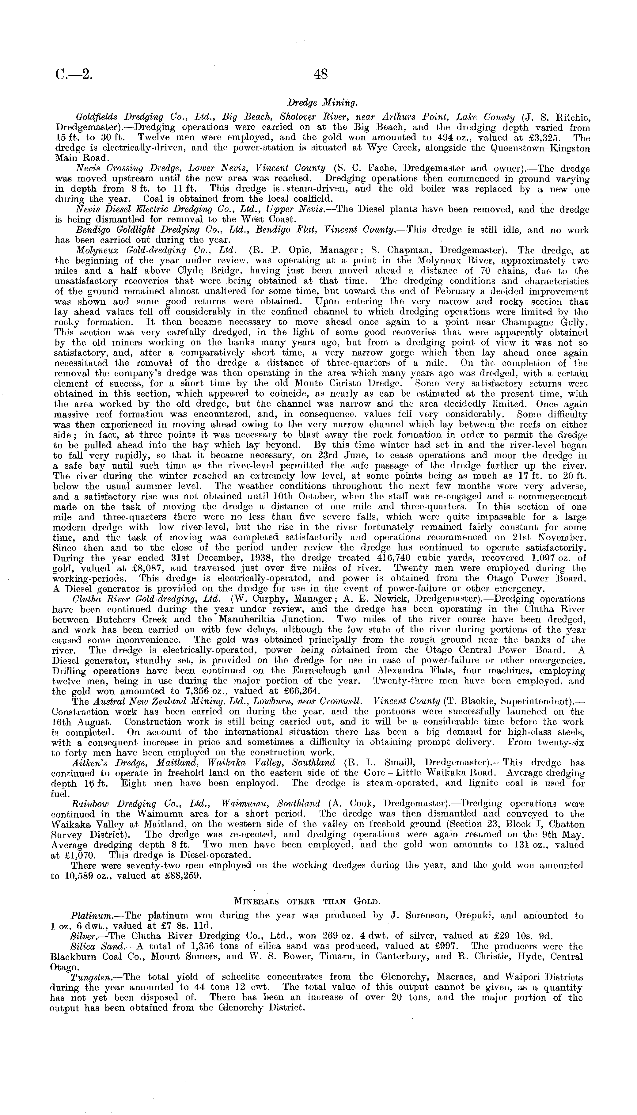 Dredge Mining. Ooldfields Dredging Co., Ltd., Big Beach, Shotover River, near Arthurs Point, Lake County (J. S. Ritchie, Dredgemaster).—Dredging operations wero carried on at the Big Beach, and the dredging depth varied from 15 ft. to 30 ft. Twelve men were employed, and the gold won amounted to 494 oz., valued at £3,325. The dredge is electrically-driven, and the power-station is situated at Wye Creek, alongside the Queenstown-Kingston Main Road. Nevis Crossing Dredge, Lower Nevis, Vincent County (S. C. Fache, Dredgemaster and owner).-—The dredge was moved upstream until the new area was reached. Dredging operations then commenced in ground varying in depth from 8 ft. to lift. This dredge is . steam-driven, and the old boiler was replaced by a new one during the year. Goal is obtained from the local coalfield. Nevis Diesel Electric Dredging Co., Ltd., XJpper Nevis. —The Diesel plants have been removed, and the dredge is being dismantled for removal to the West Coast. Bendigo Goldlight Dredging Co., Ltd., Bendigo Flat, Vincent County.—This dredge is still idle, and no work has been carried out during the year. Molyneux Gold-dredging Co., Ltd. (R. P. Opie, Manager; S. Chapman, Dredgemaster). The dredge, at the beginning of the year under review, was operating at a point in the Molyneux River, approximately two miles and a half above Clyde, Bridge, having just been moved ahead a distance of 70 chains, due to the unsatisfactory recoveries that were being obtained at that time. The dredging conditions and characteristics of the ground remained almost unaltered for some time, but toward the end of February a decided improvement was shown and some good returns were obtained. Upon entering the very narrow and rocky section that lay ahead values fell off considerably in the confined channel to which dredging operations were limited by the rocky formation. It then became necessary to move ahead once again to a point near Champagne Gully. This section was very carefully dredged, in the light of some good recoveries that were apparently obtained by the old miners working on the banks many years ago, but from a dredging point of view it was not so satisfactory, and, after a comparatively short time, a very narrow gorge which then lay ahead once again necessitated the removal of the dredge a distance of three-quarters of a mile. On the completion of the removal the company's dredge was then operating in the area which many years ago was dredged, with a certain element of success, for a short time by the old Monte Christo Dredge. Some very satisfactory returns were obtained in this section, which appeared to coincide, as nearly as can be estimated at the present time, with the area worked by the old dredge, but the channel was narrow and the area decidedly limited. Once again massive reef formation was encountered, and, in consequence, values fell very considerably. Some difficulty was then experienced in moving ahead owing to the very narrow channel which lay between the reefs on either side ; in fact, at three points it was necessary to blast away the rock formation in order to permit the dredge to be pulled ahead into the bay which lay beyond. By this time winter had set in and the river-level began to fall very rapidly, so that it became necessary, on 23rd June, to cease operations and moor the dredge in a safe bay until such time as the river-level permitted the safe passage of the dredge farther up the river. The river during the winter reached an extremely low level, at some points being as much as 17 ft. to 20 ft. below the usual summer level. The weather conditions throughout the next few months were very adverse, and a satisfactory rise was not obtained until 10th October, when the staff was re-engaged and a commencement made on the task of moving the dredge a distance of one mile and three-quarters. In this section of one mile and three-quarters there were no less than five severe falls, which were quite impassable for a large modern dredge with low river-level, but the rise in the river fortunately remained fairly constant for some time, and the task of moving was completed satisfactorily and operations recommenced on 21st November. Since then and to the close of the period under review the dredge has continued to operate satisfactorily. During the year ended 31st December, 1938, the dredge treated 416,740 cubic yards, recovered 1,097 oz. of gold, valued at £8,087, and traversed just over five miles of river. Twenty men were employed during the working-periods. This dredge is electrically-operated, and power is obtained from the Otago Power Board. A Diesel generator is provided on the dredge for use in the event of power-failure or other emergency. Clutha River Gold-dredging, Ltd. (W. Curphy, Manager ; A. E. Newick, Dredgemaster).—Dredging operations have been continued during the year under review, and the dredge has been operating in the Clutha River between Butchers Creek and the Manuherikia Junction. Two miles of the river course have been dredged, and work has been carried on with few delays, although the low state of the river during portions of the year caused some inconvenience. The gold was obtained principally from the rough ground near the banks of the river. The dredge is electrically-operated, power being obtained from the Otago Central Power Board. A Diesel generator, standby set, is provided on the dredge for use in case of power-failure or other emergencies. Drilling operations have been continued on the Earnseleugh and Alexandra Plats, four machines, employing twelve men, being in use during the major portion of the year. Twenty-three men have been employed, and the gold won amounted to 7,356 oz., valued at £66,264. The Austral New Zealand Mining, Ltd., Lowburn, near Cromwell. Vincent County (T. Blackie, Superintendent).— Construction work has been carried on during the year, and the pontoons were successfully launched on the 16th August. Construction work i