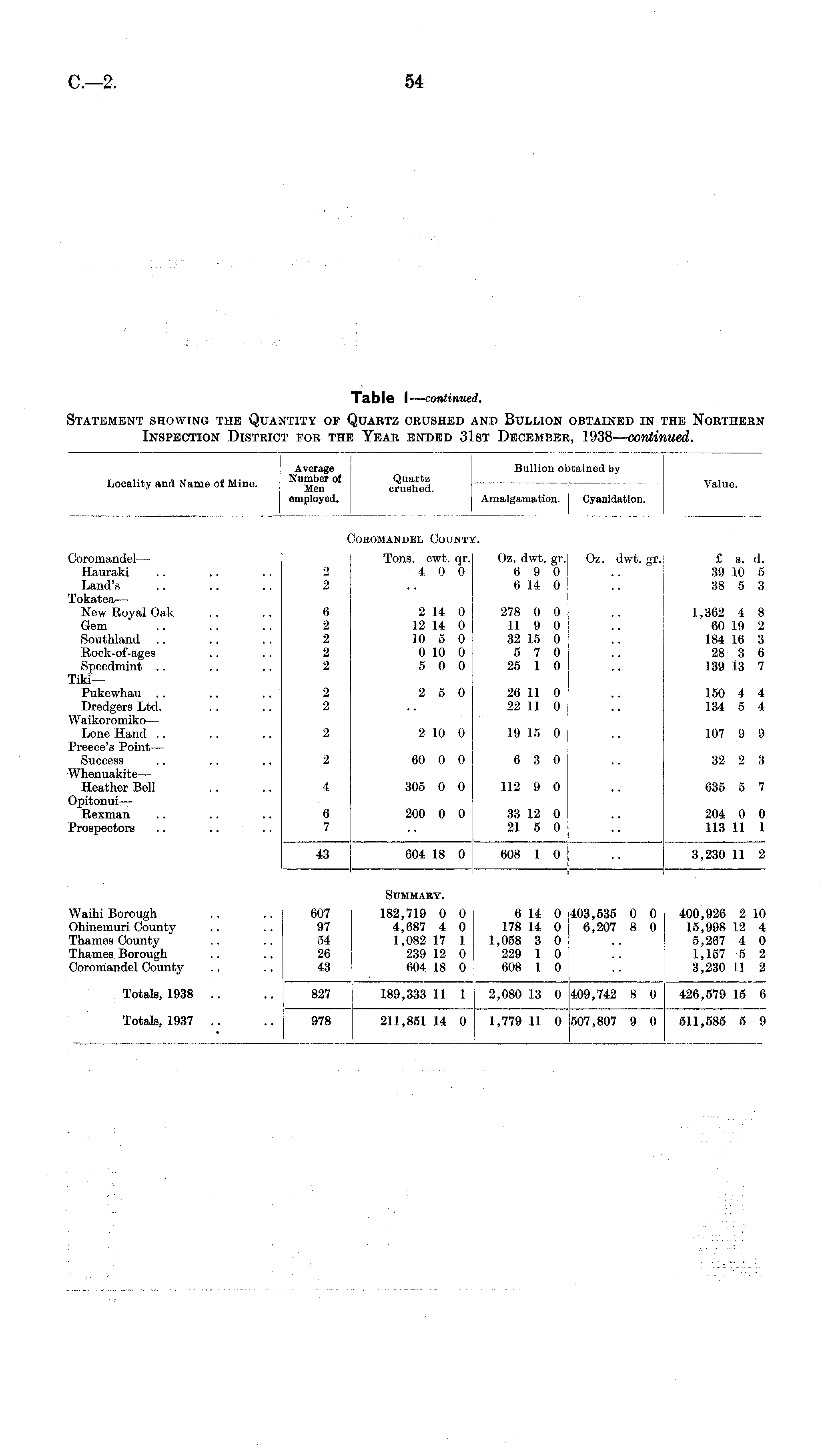 Table I —continued. Statement showing the Quantity of Quartz crushed and Bullion obtained in the Northern Inspection District for the Year ended 31st December, 1938—continued.