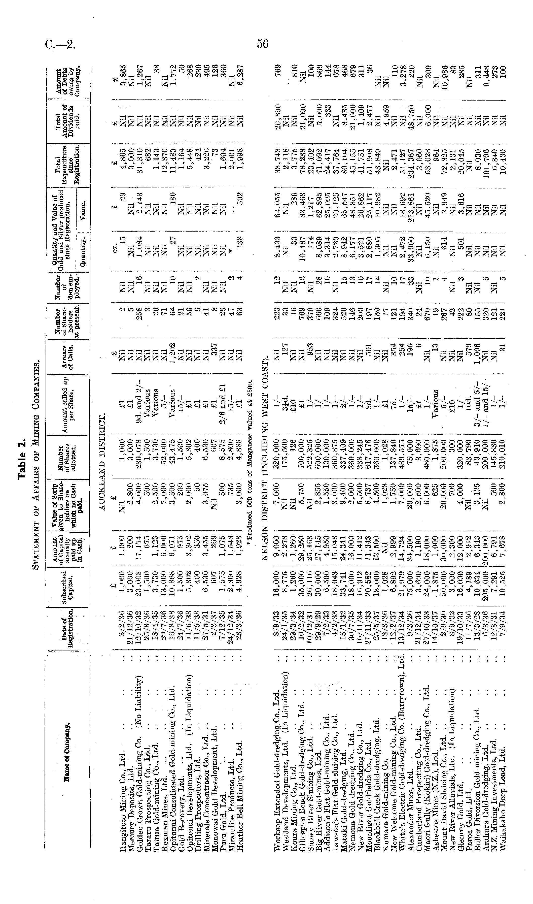 — Amount Value of Scrip w , imho) . xr„ m Quantity and Value of rp . , . Name of Company Dat<! ° f Subscribed oTsbS'es Amount caUed up Arrears of Share- * of » AmounUf tfTette Same of Company. Registration. Capital. Slotted. per Share. V of CaUs. holders Menem- since Reg.strat.on, since D j vi(ieDds owing by •n Cm h naid allotted. f at preseilt . ployed . Registration. paid. Company. .n oasn. paid. Quantity. Value. AUCKLAND DISTRICT. £ £ £ £ oz. £ £ £ £ Rangitoto Mining Co., Ltd. .. .. .. 3/2/36 1,000 1,000 Nil 1,000 £1 Nil 2 Nil 15 29 4,865 Nil 3,865 Mercury Deposits, Ltd. .. .. .. 21/12/36 3,000 200 2,800 3,000 £1 Nil 5 Nil Nil Nil 3,000 Nil Nil Golden Crown Gold-mining Co. (No Liability) .. 12/10/32 23,008 17,174 4,000 230,078 9d. and 2/- Nil 258 16 1,084 2,143 31,310 Nil 1,267 Tararu Prospecting Co., Ltd. .. .. .. 25/8/36 1,500 675 500 1,500 Various Nil 3 Nil Nil Nil 682 Nil Nil Tairua Gold-mining Co., Ltd. .. .. .. 18/4/35 3,730 1,123 2,500 3,730 Various Nil 26 Nil Nil Nil 1,143 Nil 38 Rexman Mines, Ltd. .. •• • • -- 29/7/36 13,000 6,000 7,000 52,000 5/- Nil 71 Nil Nil Nil 12,370 Nil Nil Opitonui Consolidated Gold-mining Co., Ltd. .. 16/8/38 10,868 6,071 3,500 43,475 Various 1,202 64 10 27 180 11,483 Nil 1,772 Gold Recovery, Ltd. .. -• •• 24/7/36 1,500 975 200 1,500 15/— Nil 21 Nil Nil Nil 1,164 Nil 50 Opitonni Developments, Ltd. (In Liquidation) .. 11/6/33 5,302 3,302 2,000 5,302 £1 Nil 59 Nil Nil Nil 5,448 Nil 268 Drilling Prospectors, Ltd. •• 11/5/38 400 350 50 400 £1 Nil 9 2 Nil Nil 424 Nil 239 Minerals Concentrator Co., Ltd. .. .. .. 27/5/31 6,530 3,455 3,075 6,530 £1 Nil 41 Nil Nil Nil 3,226 Nil 495 Monowai Gold Development, Ltd. .. . . 2/3/37 607 269 Nil 607 £1 337 8 Nil Nil Nil 73 Nil 126 Puru Gold, Ltd. .. •• •• 7/12/35 1,575 1,075 500 8,575 2/6 and £1 Nil 29 Nil Nil Nil 1,604 Nil 360 Mirandite Products, Ltd. .. .. .. 24/12/34 2,800 1,548 735 2,800 15/— Nil 47 2 * .. 2,001 Nil Nil Heather Bell Mining Co., Ltd. .. .. .. 23/3/36 4,928 1,928 3,000 4,888 £1 Nil 63 4 138 592 1,998 Nil 6,287 * Produced 500 tons of Manganese valued at £500. NELSON DISTRICT (INCLUDING WEST COAST). Worksop Extended Gold-dredging Co., Ltd. .. 8/9/33 16,000 9,000 7,000 320,000 1/- Nil 223 | 12 8,433 64,055 38,748 20,800! 769 Westland Developments, Ltd. (In Liquidation) .. 24/1/35 8,775 2,278 Nil 175,500 3Jd. 127 33 Nil Nil Nil 2,118 Nil Koura Mining Co., Ltd. .. .. .. 29/3/34 1,260 1,260 Nil 126 £10 Nil 16 Nil 33 289 3,775 Nil 810 GiUespies Beach Gold-dredging Co., Ltd. .. .. 10/2/32 35,000 29,250 5,750 700,000 £1 Nil 769 16 10,487 83,463 78,238 21,000 Nil Snowy River Sluicing Co., Ltd. .. .. .. 10/12/31 26,116 25,163 Nil 522,325 1/- 953 379 Nil 174 1,217 23,402 Nil 100 Big River Gold-mines, Ltd. .. .. .. 29/9/29 30,000 27,145 2,855 600,000 1/- Nil 660 28 8,089 62,895 71,092 5,000 869 Addison's Flat Gold-mining Co., Ltd. .. .. 7/2/33 6,500 4,950 1,550 130,000 1/- Nil 109 10 3,314 25,095 24,417 333 144 Lawson's Flat Gold-sluicing Co., Ltd. .. .. 4/2/33 18,043 15,043 3,000 360,875 1/- Nil 324 Nil 2,729 20,125 37,764 Nil 678 Mataki Gold-dredging, Ltd. .. .. .. 15/1/32 33,741 24,341 9,400 337,409 2/- Nil 520 15 8,942 65,547 80,104 8,435 468 Nemona Gold-dredging Co., Ltd. .. .. 30/7/35 18,000 16,000 2,000 360,000 1/- Nil 146 13 6,177 48,851 45,155 21,000 679 New River Gold-dredging Co., Ltd. .. .. 16/11/34 16,912 11,412 5,500 338,245 1/- Nil 200 10 3,521 26,862 41,751 1,409! 311 Moonlight Goldfields Co., Ltd. .. .. .. 21/11/33 20,582 11,343 8,737 617,476 8d. 501 197 17 2,880 25,117 51,008 2,477 36 Blackball Creek Gold-dredging, Ltd. .. .. 25/5/37 18,000 13,500 4,500 360,000 1/- Nil 159 14 1,305 10,982 43,849: Nil Nil Kumara Gold-mining Co. .. .. .. 13/3/36 1,028 Nil 1,028 1,028 £1 Nil 17 Nil Nil Nil Nil 4,959 Nil New Welcome Gold-mining Co., Ltd. .. .. 12/2/37 6,892 2,999 1.750 137,840 7d. 354 121 10 Nil Nil 2,471 Nil 110 White's Electric Gold-dredging Co. (Barrytown), Ltd. 13/12/34 21,979 14,724 7,000 439,575 1/- 254 194 17 2,472 18,692 51,127 Nil 3,278 Alexander Mines, Ltd. .. .. .. .. 9/3/26 75,000 34,500 29,000 75,000 15/- 190 340 33 33,900 213,861 234,367 48,750 220 Cumberland Prospecting Co., Ltd. .. .. 21/12/34 3,690 1,190 2,500 3,690 £1 6 24 Nil Nil Nil 3,060 Nil Nil Maori Gully (Kokiri) Gold-dredging Co., Ltd. .. 27/10/33 24,000 18,000 6,000 480,000 1/- Nil 670 10 6,150 45,520 53,028 6,000 309 Asbestos Mines (N.Z.), Ltd. .. .. .. 14/10/37 1,875 1,000 625 1,875 Various 13 19 1 Nil Nil 964 Nil Nil Mount David Sluicing Co., Ltd. .. .. .. 2/9/30 50,000 30.000 20,000 200,000 5/- Nil 267 4 614 3,949 72,825 Nil 10,986 New River Alluvials, Ltd. (In Liquidation) .. 8/9/32 3,000 2,300 700 300 £10 Nil 42 Nil Nil Nil 2,13] Nil 83 Glenroy Gold, Ltd. .. .. .. .. 19/10/33 16,000 12,000 4,000 320,000 1/- Nil 222 3 501 3,616 20,045 Nil 285 Paroa Gold, Ltd. .. .. .. .. 11/7/36 4.189 2,912 Nil 83,790 lOd. 579 80 Nil Nil Nil Nil Nil Nil Buller Diversion Gold-mining Co., Ltd. .. .. 13/3/28 10,634 6,343 3,125 49,910 3/-and 5/- 1,006 155 Nil Nil Nil 8,030! Nil 311 Arahura Gold-dredging, Ltd. .. .. .. 6/3/36 205,000 200,000 Nil 200,000 1/- and 15/— Nil 320 5 j Nil Nil 191,706 ! Nil 9,448 N.Z. Mining Investments, Ltd. .. .. .. 12/8/31 7,291 6,791 500 145,830 1/- Nil 121 Nil ; Nil Nil 6,840 Nil ' 273 Waikakaho Deep Lead, Ltd. .. .. .. 7/9/34 10,525 7,678 2,800 210,010 1/- 31 221 5 1 Nil Nil 10,430 ! Nil ! 100