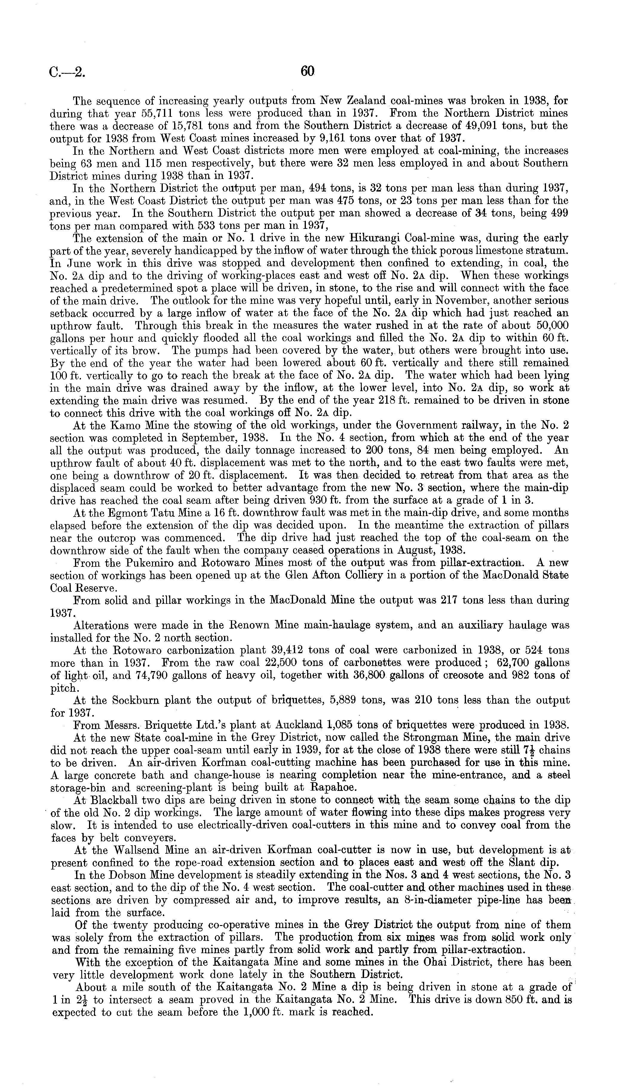 The sequence of increasing yearly outputs from New Zealand coal-mines was broken in 1938, for during that year 55,711 tons less were produced than in 1937. From the Northern District mines there was a decrease of 15,781 tons and from the Southern District a decrease of 49,091 tons, but the output for 1938 from West Coast mines increased by 9,161 tons over that of 1937. In the Northern and West Coast districts more men were employed at coal-mining, the increases being 63 men and 115 men respectively, but there were 32 men less employed in and about Southern District mines during 1938 than in 1937. In the Northern District the output per man, 494 tons, is 32 tons per man less than during 1937, and, in the West Coast District the output per man was 475 tons, or 23 tons per man less than for the previous year. In the Southern District the output per man showed a decrease of 34 tons, being 499 tons per man compared with 533 tons per man in 1937, The extension of the main or No. 1 drive in the new Hikurangi Coal-mine was, during the early part of the year, severely handicapped by the inflow of water through the thick porous limestone stratum. In June work in this drive was stopped and development then confined to extending, in coal, the No. 2a dip and to the driving of working-places east and west off No. 2a. dip. When these workings reached a predetermined spot a place will be driven, in stone, to the rise and will connect with the face of the main drive. The outlook for the mine was very hopeful until, early in November, another serious setback occurred by a large inflow of water at the face of the No. 2a dip which had just reached an upthrow fault. Through this break in the measures the water rushed in at the rate of about 50,000 gallons per hour and quickly flooded all the coal workings and filled the No. 2a dip to within 60 ft. vertically of its brow. The pumps had been covered by the water, but others were brought into use. By the end of the year the water had been lowered about 60 ft. vertically and there still remained 100 ft. vertically to go to reach the break at the face of No. 2a dip. The water which had been lying in the main drive was drained away by the inflow, at the lower level, into No. 2a dip, so work at extending the main drive was resumed. By the end of the year 218 ft. remained to be driven in stone to connect this drive with the coal workings off No. 2a dip. At the Kamo Mine the stowing of the old workings, under the Government railway, in the No. 2 section was completed in September, 1938. In the No. 4 section, from which at the end of the year all the output was produced, the daily tonnage increased to 200 tons, 84 men being employed. An upthrow fault of about 40 ft. displacement was met to the north, and to the east two faults were met, one being a downthrow of 20 ft. displacement. It was then decided to retreat from that area as the displaced seam could be worked to better advantage from the new No. 3 section, where the main-dip drive has reached the coal seam after being driven 930 ft. from the surface at a grade of 1 in 3. At the Egmont Tatu Mine a 16 ft. downthrow fault was met in the main-dip drive, and some months elapsed before the extension of the dip was decided upon. In the meantime the extraction of pillars near the outcrop was commenced. The dip drive had just reached the top of the coal-seam on the downthrow side of the fault when the company ceased operations in August, 1938. From the Pukemiro and Rotowaro Mines most of the output was from pillar-extraction. A new section of workings has been opened up at the Glen Afton Colliery in a portion of the Mac Donald State Coal Reserve. From solid and pillar workings in the Mac Donald Mine the output was 217 tons less than during 1937. Alterations were made in the Renown Mine main-haulage system, and an auxiliary haulage was installed for the No. 2 north section. At the Rotowaro carbonization plant 39,412 tons of coal were carbonized in 1938, or 524 tons more than in 1937. From the raw coal 22,500 tons of carbonettes were produced; 62,700 gallons of light oil, and 74,790 gallons of heavy oil, together with 36,800 gallons of creosote and 982 tons of pitch. At the Sockburn plant the output of briquettes, 5,889 tons, was 210 tons less than the output for 1937. From Messrs. Briquette Ltd.'s plant at Auckland 1,085 tons of briquettes were produced in 1938. At the new State coal-mine in the Grey District, now called the Strongman Mine, the main drive did not reach the upper coal-seam until early in 1939, for at the close of 1938 there were still 7f chains to be driven. An air-driven Korfman coal-cutting machine has been purchased for use in this mine. A large concrete bath and change-house is nearing completion near the mine-entrance, and a steel storage-bin and screening-plant is being built at Rapahoe. At Blackball two dips are being driven in stone to connect with the seam some chains to the dip of the old No. 2 dip workings. The large amount of water flowing into these dips makes progress very slow. It is intended to use electrically-driven coal-cutters in this mine and to convey coal from the faces by belt conveyers. At the Wallsend Mine an air-driven Korfman coal-cutter is now in use, but development is at present confined to the rope-road extension section and to places east and west off the Slant dip. In the Dobson Mine development is steadily extending in the Nos. 3 and 4 west sections, the No. 3 east section, and to the dip of the No. 4 west section. The coal-cutter and other machines used in these sections are driven by compressed air and, to improve results, an 8-in-diameter pipe-line has been laid from the surface. Of the twenty producing co-operative mines in the Grey District the output from nine of them was solely from the extraction of pillars. The production from six mines was from solid work only and from the remaining five mines partly from solid work and partly from pillar-extraction. With the exc