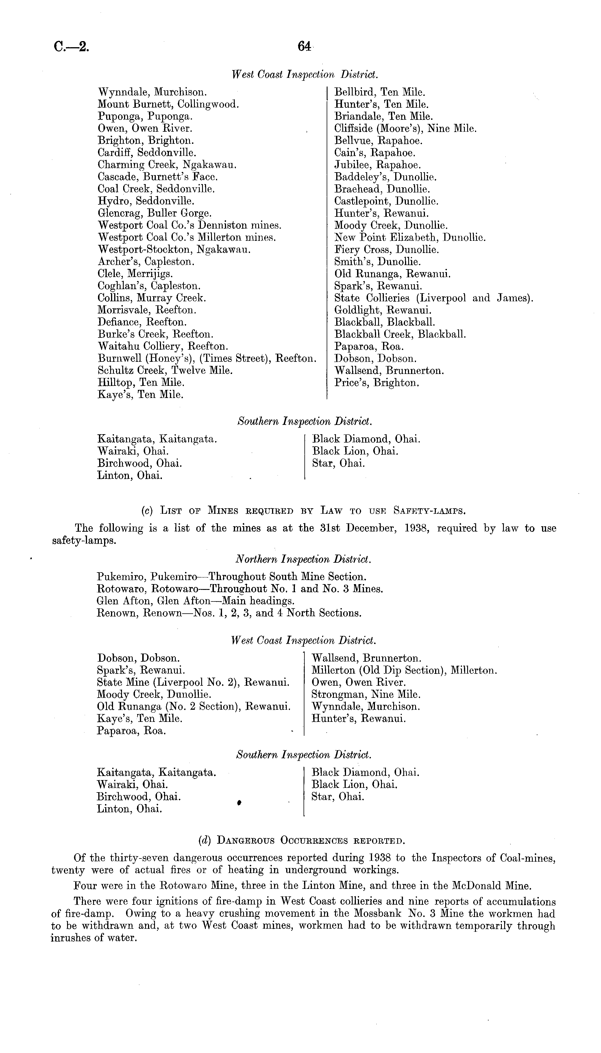 West Coast Inspection District. Wynndale, Murchison. Bellbird, Ten Mile. Mount Burnett, Collingwood. Hunter's, Ten Mile. Puponga, Puponga. Briandale, Ten Mile. Owen, Owen River. , ClifEside (Moore's), Nine Mile. Brighton, Brighton. Bellvue, Rapahoe. Cardiff, Seddonville. Cain's, Rapahoe. Charming Creek, Ngakawau. Jubilee, Rapahoe. Cascade, Burnett's Face. Baddeley's, Dunollie. Coal Creek, Seddonville. Braehead, Dunollie. Hydro, Seddonville. Castlepoint, Dunollie. Glencrag, Buller Gorge. Hunter's, Rewanui. Westport Coal Co.'s Denniston mines. Moody Creek, Dunollie. Westport Coal Co.'s Millerton mines. New Point Elizabeth, Dunollie. Westport-Stockton, Ngakawau. Fiery Cross, Dunollie. Archer's, Capleston. Smith's, Dunollie. Clele, Merrijigs. Old Runanga, Rewanui. Coghlan's, Capleston. Spark's, Rewanui. Collins, Murray Creek. State Collieries (Liverpool and James). Morrisvale, Reefton. Goldlight, Rewanui. Defiance, Reefton. Blackball, Blackball. Burke's Creek, Reefton. Blackball Creek, Blackball. Waitahu Colliery, Reefton. Paparoa, Roa. Burnwell (Honey's), (Times Street), Reefton. Dobson, Dobson. Schultz Creek, Twelve Mile. Wallsend, Brunnerton. Hilltop, Ten Mile. Price's, Brighton. Kaye's, Ten Mile. Southern Inspection District. Kaitangata, Kaitangata. Black Diamond, Ohai. Wairaki, Ohai. Black Lion, Ohai. Birchwood, Ohai. Star, Ohai. Linton, Ohai. (c) List op Mines required by Law to use Safety-lamps. The following is a list of the mines as at the 31st December, 1938, required by law to use safety-lamps. Northern Inspection District. Pukemiro, Pukemiro —Throughout South Mine Section. Rotowaro, Rotowaro —Throughout No. 1 and No. 3 Mines. Glen Afton, Glen Afton—Main headings. Renown, Renown —Nos. 1, 2, 3, and 4 North Sections. West Coast Inspection District. Dobson, Dobson. Wallsend, Brunnerton. Spark's, Rewanui. Millerton (Old Dip Section), Millerton. State Mine (Liverpool No. 2), Rewanui. Owen, Owen River. Moody Creek, Dunollie. Strongman, Nine Mile. Old Runanga (No. 2 Section), Rewanui. Wynndale, Murchison. Kaye's, Ten Mile. Hunter's, Rewanui. Paparoa, Roa. Southern Inspection District. Kaitangata, Kaitangata. Black Diamond, Ohai. Wairaki, Ohai. Black Lion, Ohai. Birchwood, Ohai. f Star, Ohai. Linton, Ohai. (d) Dangerous Occurrences reported. Of the thirty-seven dangerous occurrences reported during 1938 to the Inspectors of Coal-mines, twenty were of actual fires or of heating in underground workings. Four were in the Rotowaro Mine, three in the Linton Mine, and three in the McDonald Mine. There were four ignitions of fire-damp in West Coast collieries and nine reports of accumulations of fire-damp. Owing to a heavy crushing movement in the Mossbank No. 3 Mine the workmen had to be withdrawn and, at two West Coast mines, workmen had to be withdrawn temporarily through inrushes of water.
