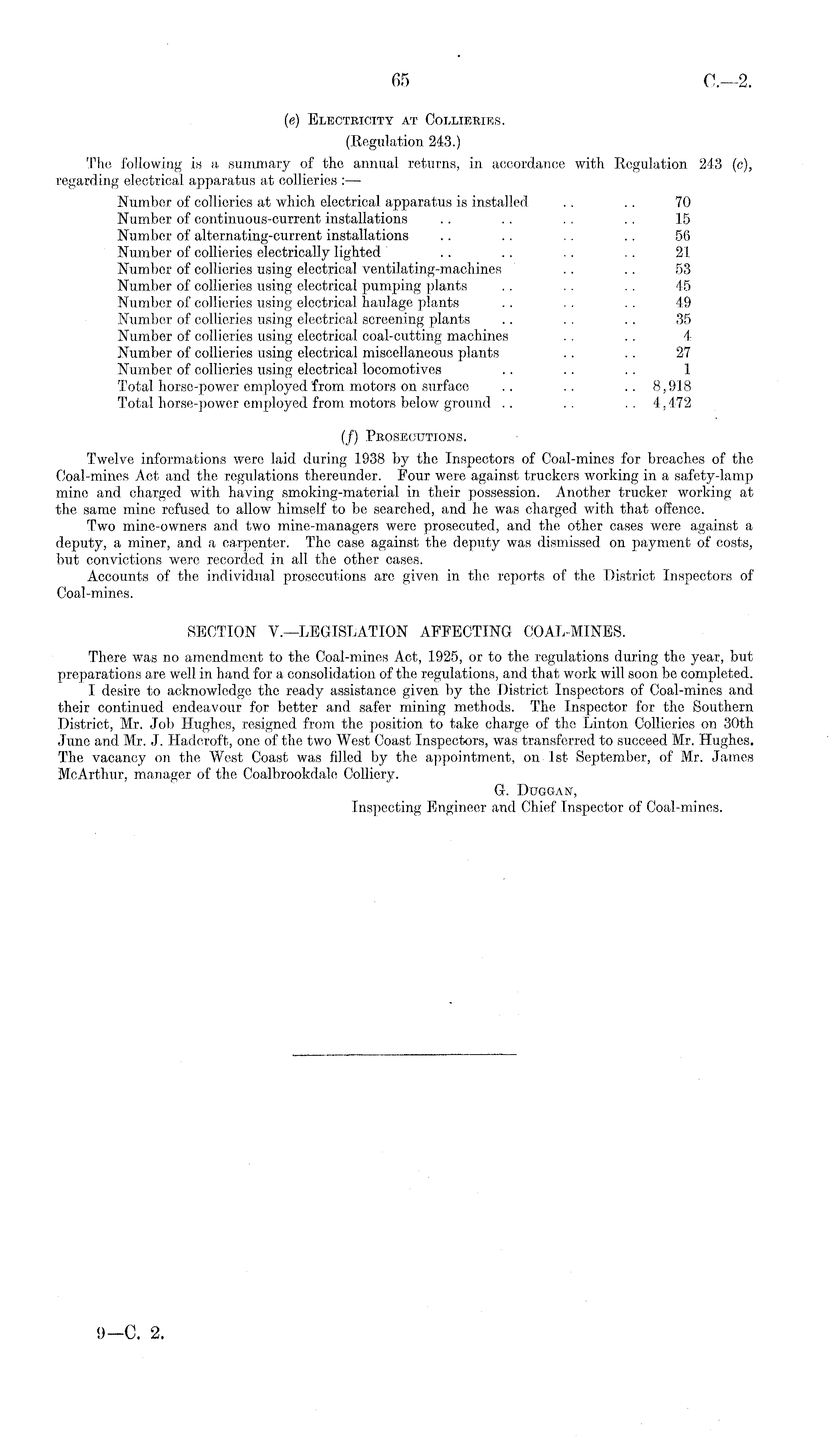 (e) Electricity at Collieries. (Regulation 243.) The following is a summary of the annual returns, in accordance with Regulation 243 (c), regarding electrical apparatus at collieries : — Number of collieries at which electrical apparatus is installed .. .. 70 Number of continuous-current installations .. .. . . .. 15 Number of alternating-current installations .. .. . . .. 56 Number of collieries electrically lighted .. .. .. .. 21 Number of collieries using electrical ventilating-machines .. .. 53 Number of collieries using electrical pumping plants .. .. .. 45 Number of collieries using electrical haulage plants . . .. .. 49 Number of collieries using electrical screening plants .. .. .. 35 Number of collieries using electrical coal-cutting machines .. .. 4 Number of collieries using electrical miscellaneous plants .. .. 27 Number of collieries using electrical locomotives .. .. .. 1 Total horse-power employed from motors on surface .. .. 8,918 Total horse-power employed from motors below ground .. .. .. 4,472 (/) Prosecutions. Twelve informations were laid during 1938 by the Inspectors of Coal-mines for breaches of the Coal-mines Act and the regulations thereunder. Four were against truckers working in a safety-lamp mine and charged with having smoking-material in their possession. Another trucker working at the same mine refused to allow himself to be searched, and he was charged with that offence. Two mine-owners and two mine-managers were prosecuted, and the other cases were against a deputy, a miner, and a carpenter. The case against the deputy was dismissed on payment of costs, but convictions were recorded in all the other cases. Accounts of the individual prosecutions are given in the reports of the District Inspectors of Coal-mines. SECTION V.—LEGISLATION AFFECTING COAL-MINES. There was no amendment to the Coal-mines Act, 1925, or to the regulations during the year, but preparations are well in hand for a consolidation of the regulations, and that work will soon be completed. I desire to acknowledge the ready assistance given by the District Inspectors of Coal-mines and their continued endeavour for better and safer mining methods. The Inspector for the Southern District, Mr. Job Hughes, resigned from the position to take charge of the Linton Collieries on 30th June and Mr. J. Hadcroft, one of the two West Coast Inspectors, was transferred to succeed Mr. Hughes. The vacancy on the West Coast was filled by the appointment, on Ist September, of Mr. James McArthur, manager of the Coalbrookdale Colliery. G. Duggan, Inspecting Engineer and Chief Inspector of Coal-mines.
