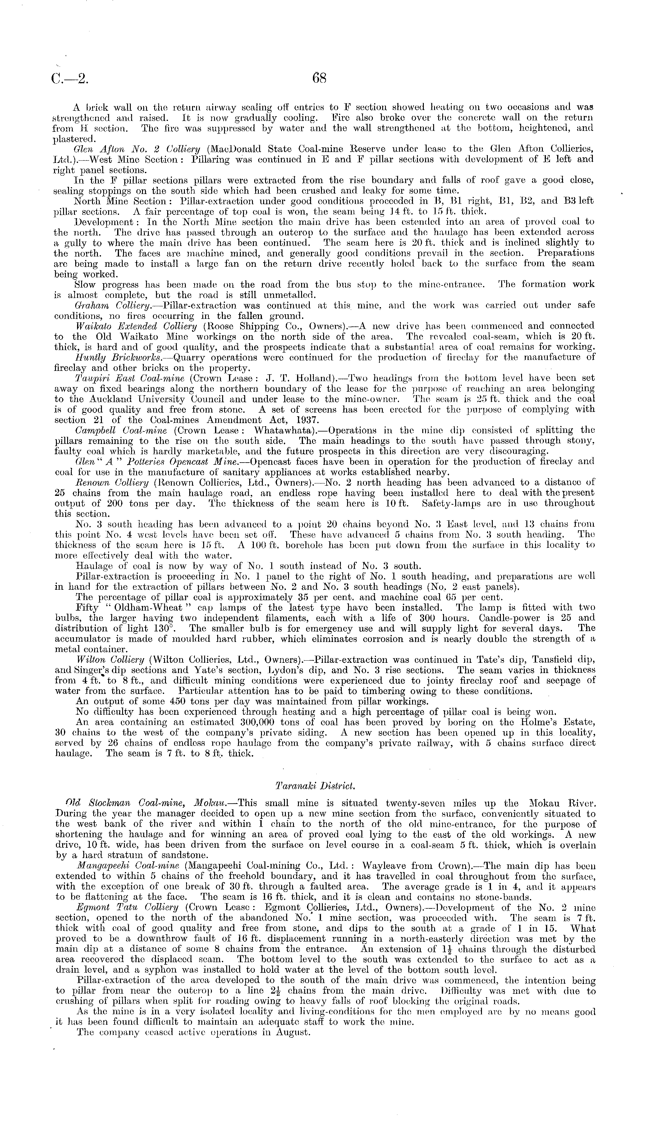 A brick wall on the return airway sealing off entries to F section showed heating on two occasions and was strengthened and raised. It is now gradually cooling. Fire also broke over the concrete wall on the return from H section. The fire was suppressed by water and the wall strengthened at the bottom, heightened, and plastered. Qlen Afton No. 2 Colliery (Mac Donald State Coal-mine Reserve under lease to the Glen Afton Collieries, Ltd.). —West Mine Section : Pillaring was continued in E and F pillar sections with development of E left and right panel sections. In the F pillar sections pillars were extracted from the rise boundary and falls of roof gave a good close, sealing stoppings on the south side which had been crushed and leaky for some time. North Mine Section: Pillar-extraction under good conditions proceeded in B, 151 right, 81, 82, and B3 left pillar sections. A fair percentage of top coal is won, the seam being 14 ft. to 15 ft. thick. Development: In the North Mine section the main drive has been estended into an area of proved coal to the north. The drive has passed through an outcrop to the surface and the haulage has been extended across a gully to where the main drive has been continued. The seam here is 20 ft. thick and is inclined slightly to the north. The faces are machine mined, and generally good conditions prevail in the section. Preparations are being made to install a large fan on the return drive recently holed back to the surface from the seam being worked. Slow progress has been made on the road from the bus stop to the mine-entrance. The formation work is almost complete, but the road is still unmetalled. Graham Colliery.—Pillar-extraction was continued at this mine, and the work was carried out under safe conditions, no fires occurring in the fallen ground. Waikato Extended Colliery (Roose Shipping Co., Owners). —A new drive has been commenced and connected to the Old Waikato Mine workings on the north side of the area. The revealed coal-seam, which is 20 ft. thick, is hard and of good quality, and the prospects indicate that a substantia! area of coal remains for working. tiuntly Brickworks.—Quarry operations were continued for the production of fireclay for the manufacture of fireclay and other bricks on the property. Taupiri East Coal-mine (Crown Lease : J. T. Holland). —Two headings from the bottom level have been set away on fixed bearings along the northern boundary of the lease for the purpose of reaching an area belonging to the Auckland University Council and under lease to the mine-owner. The seam is 25 ft. thick and the coal is of good quality and free from stone. A set of screens has been erected for the purpose of complying with section 21 of the Coal-mines Amendment Act, 1937. Campbell Coal-mine (Crown Lease: Whatawhata). —Operations in the mine dip consisted of splitting the pillars remaining to the rise on the south side. The main headings to the south have passed through stony, faulty coal which is hardly marketable, and the future prospects in this direction are very discouraging. Qlen" A " Potteries Opencast Mine.—Opencast faces have been in operation for the production of fireclay and coal for use in the manufacture of sanitary appliances at works established nearby. Renown Colliery (Renown Collieries, Ltd., Owners). —No. 2 north heading has been advanced to a distance of 25 chains from the main haulage road, an endless rope having been installed here to deal with the present output of 200 tons per day. The thickness of the seam here is 10 ft. Safety-lamps are in use throughout this section. No. 3 south heading has been advanced to a point 20 chains beyond No. 3 East level, and 13 chains from this point No. 4 west levels have been set off. These have advanced 5 chains from No. 3 south heading. The thickness of the seam here is 15 ft. A 100 ft. borehole has been put down from the surface in this locality to more effectively deal with the wator. Haulage of coal is now by way of No. 1 south instead of No. 3 south. Pillar-extraction is proceeding in No. 1 panel to the right of No. 1 south heading, and preparations are well in hand for the extraction of pillars between No. 2 and No. 3 south headings (No, 2 east panels). The percentage of pillar coal is approximately 35 per cent, and machine coal 65 per cent. Fifty " Oldham-Wheat " cap lamps of the latest type have been installed. The lamp is fitted with two bulbs, the larger having two independent filaments, each with a life of 300 hours. Candle-power is 25 and distribution of light 130°. The smaller bulb is for emergency use and will supply light for several days. The accumulator is made of moulded hard rubber, which eliminates corrosion and is nearly double the strength of a metal container. Wilton Colliery (Wilton Collieries, Ltd., Owners). —Pillar-extraction was continued in Tate's dip, Tansfield dip, and Singers dip sections and Yate's section, Lydon's dip, and No. 3 rise sections. The seam varies in thickness from 4 ft. to 8 ft., and difficult mining conditions were experienced due to jointy fireclay roof and seepage of water from the surface. Particular attention has to be paid to timbering owing to these conditions. An output of some 450 tons per day was maintained from pillar workings. No difficulty has been experienced through heating and a high percentage of pillar coal is being won. An area containing an estimated 300,000 tons of coal has been proved by boring on the Holme's Estate, 30 chains to the west of the company's private siding. A new section has been opened up in this locality, served by 26 chains of endless rope haulage from the company's private railway, with 5 chains surface direct haulage. The seam is 7 ft. to 8 ft. thick. Taranaki District. Old Stockman Coal-mine, Molcau.—This small mine is situated twenty-seven miles up the Mokau River. During the year the manager decided to open up a new mine section from the surface, conveniently situated to the