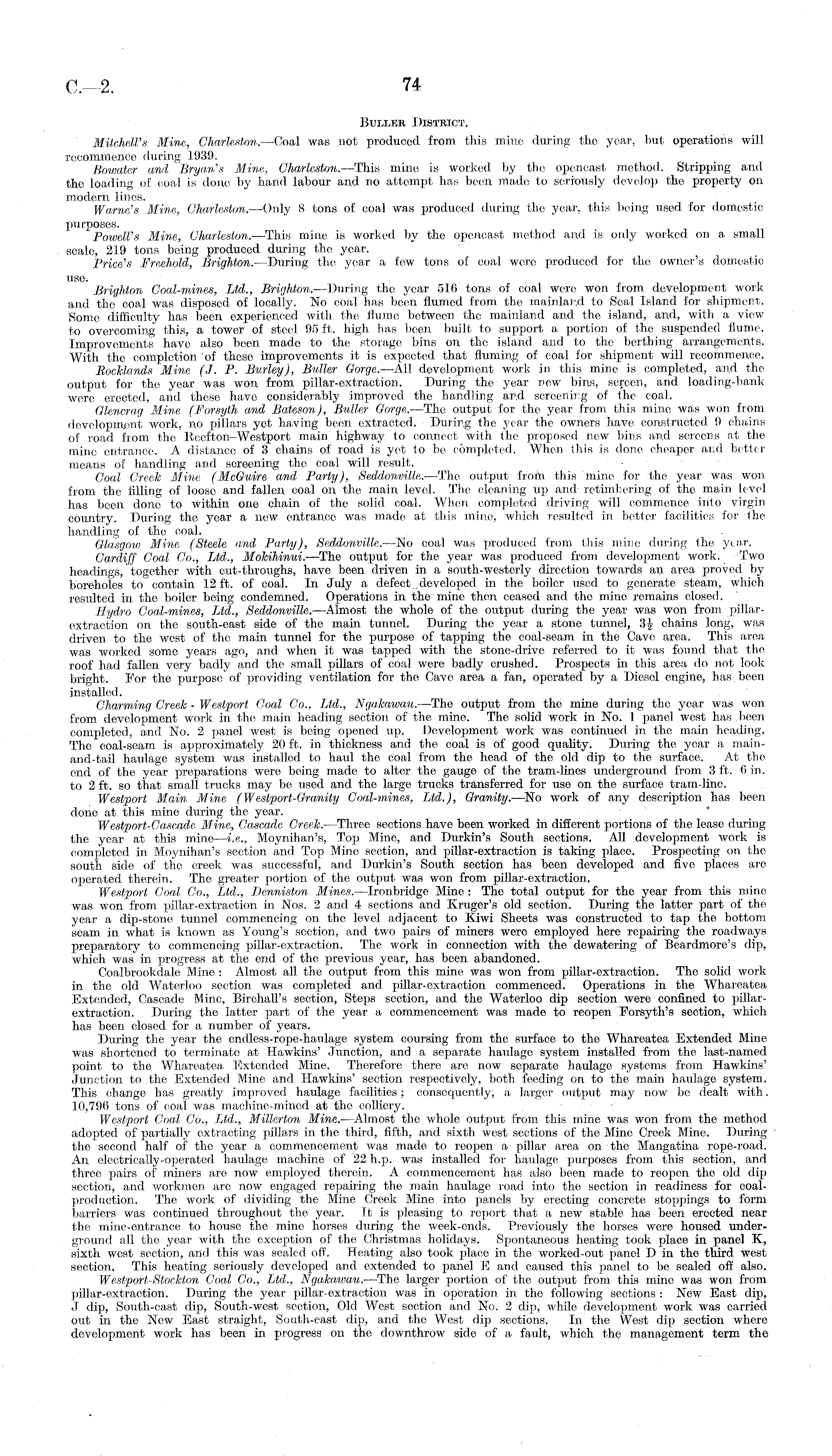 Bullee District. Mitchell's Mine, Charleston. —Coal was not produced from this mine during the year, but operations will recommence during 1939. Bowater and Bryan's Mine, Charleston.—This mine is worked by the opencast method. Stripping and the loading of coal is done by hand labour and no attempt has been made to seriously develop the property on modern linos. Warm's Mine, Charleston'. —Only 8 tons of coal was produced during the year, this being used for domestic purposes. Powell's Mine, Charleston. —This mine is worked by the opencast method and is only worked on a small scale, 219 tons being produced during the year. Price's Freehold, Brighton.—During the year a few tons of coal were produced for the owner's domestic use. Brighton Coal-mines, Ltd., Brighton.—During the year 616 tons of coal were won from development work and the coal was disposed of locally. No coal has been flumod from the mainland to Seal Island for shipment. Some difficulty has been experienced with the flume between the mainland and the island, and, with a view to overcoming this, a tower of steel 95 ft. high has been built to support a portion of the suspended flume. Improvements have also been made to the storage bins on the island and to the berthing arrangements. With the completion of these improvements it is expected that fluming of coal for shipment will recommence. Rocklands Mine (J. P. Burley), Butter Gorge.—All development work in this mine is completed, and the output for the year was won from pillar-extraction. During the year new bins, screen, and loading-bank were erected, and these have considerably improved the handling and screening of (he coal. Glenerag Mine (Forsyth and Bateson), Butter Gorge.—The output for the year from this mine was won from development work, no pillars yet having been extracted. During the year the owners have constructed 9 chains of road from the Reefton-Westport main highway to connect with the proposed new bins and screens at the mine entrance. A distance of 3 chains of road is yet to be completed. When this is done cheaper and better means of handling and screening the coal will result. Coal Creek Mine (McGuire and Party), Seddonville.—The output froin this mine for the year was won from the filling of loose and fallen coal on the main level. The cleaning up and retimbermg of the main level has been done to within one chain of the solid coal. When completed driving will commence into virgin country. During the year a new entrance was made at this mine, which resulted in better facilities for the handling of the coal. Glasgow Mine (Steele and Party), Seddonville. —No coal was produced from this mine during the year. Cardiff Coal Co., Ltd., Mokihinui. —The output for the year was produced from development work. Two headings, together with cut-throughs, have been driven in a south-westerly direction towards an area proved by boreholes to contain 12 ft. of coal. In July a defect developed in the boiler used to generate steam, which resulted in the boiler being condemned. Operations in the mine then ceased and the mine remains closed. Hydro Coal-mines, Ltd., Seddonville. —Almost the whole of the output during the year was won from pillarextraction on the south-east side of the main tunnel. During the year a stone tunnel, 3J chains long, was driven to the west of the main tunnel for the purpose of tapping the coal-seam in the Cave area. This area was worked some years ago, and when it was tapped with the stone-drive referred to it was found that the roof had fallen very badly and the small pillars of coal were badly crushed. Prospects in this area do not look bright. For the purpose of providing ventilation for the Cave area a fan, operated by a Diesel engine, has been installed. Charming Creelc - Westport Coal Co., Ltd., Ngakawau.—The output from the mine during the year was won from development work in the main heading section of the mine. The solid work in No. I panel west has been completed, and No. 2 panel west is being opened up. Development work was continued in the main heading. The coal-seam is approximately 20 ft. in thickness and the coal is of good quality. During the year a main-and-tail haulage system was installed to haul the coal from the head of the old dip to the surface. At the end of the year preparations were being made to alter the gauge of the tram-lines underground from 3ft. Gin. to 2 ft. so that small trucks may be used and the large trucks transferred for use on the surface tram-line. Westport Main Mine (Westport-Granity Coal-mines, Ltd.), Granity.—No work of any description has been done at this mine during the year. Westport-Cascade Mine, Cascade Creek.-—Three sections have been worked in different portions of the lease during the year at this mine—i.e., Moynihan's, Top Mine, and Durkin's South sections. All development work is completed in Moynihan's section and Top Mine section, and pillar-extraction is taking place. Prospecting on the south side of the creek was successful, and Durkin's South section has been developed and five places are operated therein. The greater portion of the output was won from pillar-extraction. Westport Coal Co., Ltd., Denniston Mines. —Ironbridge Mine : The total output for the year from this mine was won from pillar-extraction in Nos. 2 and 4 sections and Kruger's old section. During the latter part of the year a dip-stone tunnel commencing on the level adjacent to Kiwi Sheets was constructed to tap the bottom seam in what is known as Young's section, and two pairs of miners were employed here repairing the roadways preparatory to commencing pillar-extraction. The work in connection with the dewatering of Beardmore's dip, which was in progress at the end of the previous year, has been abandoned. Coalbrookdale Mine : Almost all the output from this mine was won from pillar-extraction. The solid work in the old Waterloo section was completed and pillar-extraction commenced. Operations 