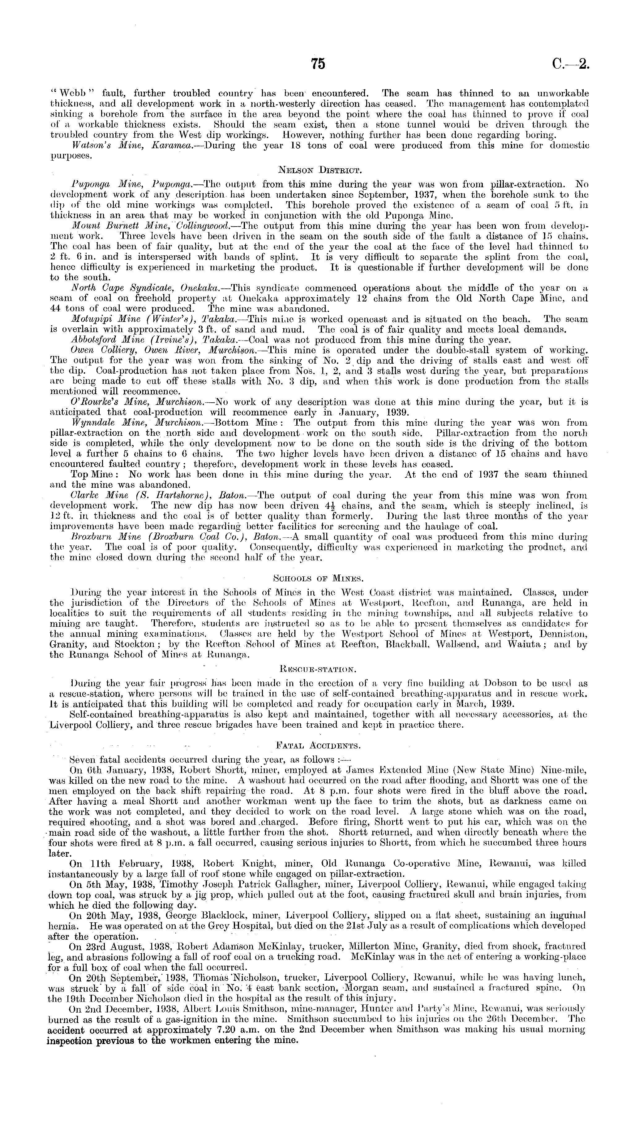 " Webb" fault, further troubled country has been encountered. The seam has thinned to an unworkable thickness, and all development work in a north-westerly direction has ceased. The management has contemplated sinking a borehole from the surface in the area beyond the point where the coal has thinned to prove if coal of a workable thickness exists. Should the seam exist, then a stone tunnel would be driven through the troubled country from the West dip workings. However, nothing further has been done regarding boring. Watson's Mine, Karwmea.—During the year 18 tons of coal were produced from this mine for domestic purposes. Nelson District. I'uponga Mine, Puponga.-—The output from this mine during the year was won from pillar-oxtraction. No development work of any description has been undertaken since September, 1937, when the borehole sunk to the dip of the old mine workings was completed. This borehole proved the existence of a seam of coal 5 ft. in thickness in an area that may bo worked in conjunction with the old Puponga Mine. Mount Burnett Mine., Collingwood.—The output from this mine during the year has been won from development work. Three levels have been driven in the seam on the south side of the fault a distance of 15 chains. The coal has been of fair quality, but at the end of the year the coal at the face of the level had thinned to 2 ft. 6 in. and is interspersed with bands of splint. It is very difficult to separate the splint from the coal, hence difficulty is experienced in marketing the product. It is questionable if further development will be done to the south. North Gape Syndicate, Onekaka.—This syndicate commenced operations about the middle of the year on a seam of coal on freehold property at Onekaka approximately 12 chains from the Old North Cape Mine, and 44 tons of coal were produced. The mine was abandoned. Motupipi Mine (Winter's), Takalca.—This mine is worked opencast and is situated on the beach. The seam is overlain with approximately 3 ft. of sand and mud. The coal is of fair quality and meets local demands. Abbotsford Mine (Irvine's), Takalca.—Coal was not produced from this mine during the year. Owen Colliery, Owen River, Murchison.—This mine is operated under the double-stall system of working. The output for the year was won from the sinking of No. 2 dip and the driving of stalls east and west off the dip. Coal-production has not taken place from No's. 1, 2, and 3 stalls wost during the year, but preparations are being made to cut otf these stalls with No. 3 dip, and when this work is done production from the stalls mentioned will recommence. O'Eourke's Mine, Murchison. —No work of any description was done at this mine during the year, but it is anticipated that coal-production will recommence early in January, 1939. Wynndale Mine, Murchison.—Bottom Mine : The output from this mine during the year was won from pillar-extraction on the north side and development work on the south side. Pillar-extraction from the north side is completed, while the only development now to be done on the south side is the driving of the bottom level a further 5 chains to 6 chains. The two higher levels have been driven a distance of 15 chains and have encountered faulted country; therefore, development work in these levels has ceased. Top Mine: No work has been done in this mine during the year. At the end of 1937 the seam thinned and the mine was abandoned. Clarke Mine (S. Ilartshorne), Baton.—The output of coal during the year from this mine was won from development work. The new dip has now been driven 4J chains, and the seam, which is steeply inclined, is 12 ft. in thickness and the coal is of better quality than formerly. During the last three months of the year improvements have been made regarding better facilities for screening and the haulage of coal. Broxburn Mine (Broxburn Coal Co.), Baton.—A. small quantity of coal was produced from this mine during the year. The coal is of poor quality. Consequently, difficulty was experienced in marketing the product, and the mine closed down during the second half of the year. Schools of Mines. During the year interest in the Schools of Mines in the Wost Coast district was maintained. Classes, under the jurisdiction of the Directors of the Schools of Mines at Westport, Reefton, and Runanga, are held in localities to suit the requirements of all students residing in the mining townships, and all subjects relative to mining are taught. Therefore, students are instructed so as to be able to present themselves as candidates for the annual mining examinations. Classes are held by the Westport School of Mines at Westport, Denniston, Granity, and Stockton ; by the Reefton School of Mines at Reefton, Blackball, Wallsend, and Waiuta ; and by the Runanga School of Mines at Runanga. Rescue-station. During the year fair progress has been made in the erection of a very fine building at Dobson to bo used as a rescue-station, where persons will bo trained in the use of self-contained breathing-apparatus and in rescue work. It is anticipated that this building will be completed and ready for occupation early in March, 1939. Self-contained breathing-apparatus is also kept and maintained, together with all necessary accessories, at the Liverpool Colliery, and three rescue brigades have been trained and kept in practioe there. Fatal Accidents. Seven fatal accidents occurred during the year, as follows On (ith January, 1938, Robert Shortt, miner, employed at James Extended Mine (New State Mine) Nine-mile, was killed on the new road to the mine. A washout had occurred on the road after flooding, and Shortt was one of the men employed on the back shift repairing the road. At 8 p.m. four shots were fired in the bluff above the road. After having a meal Shortt and another workman went up the face to trim the shots, but as darkness came on the work was not completed, and they decided to work on the road level. A large stone w