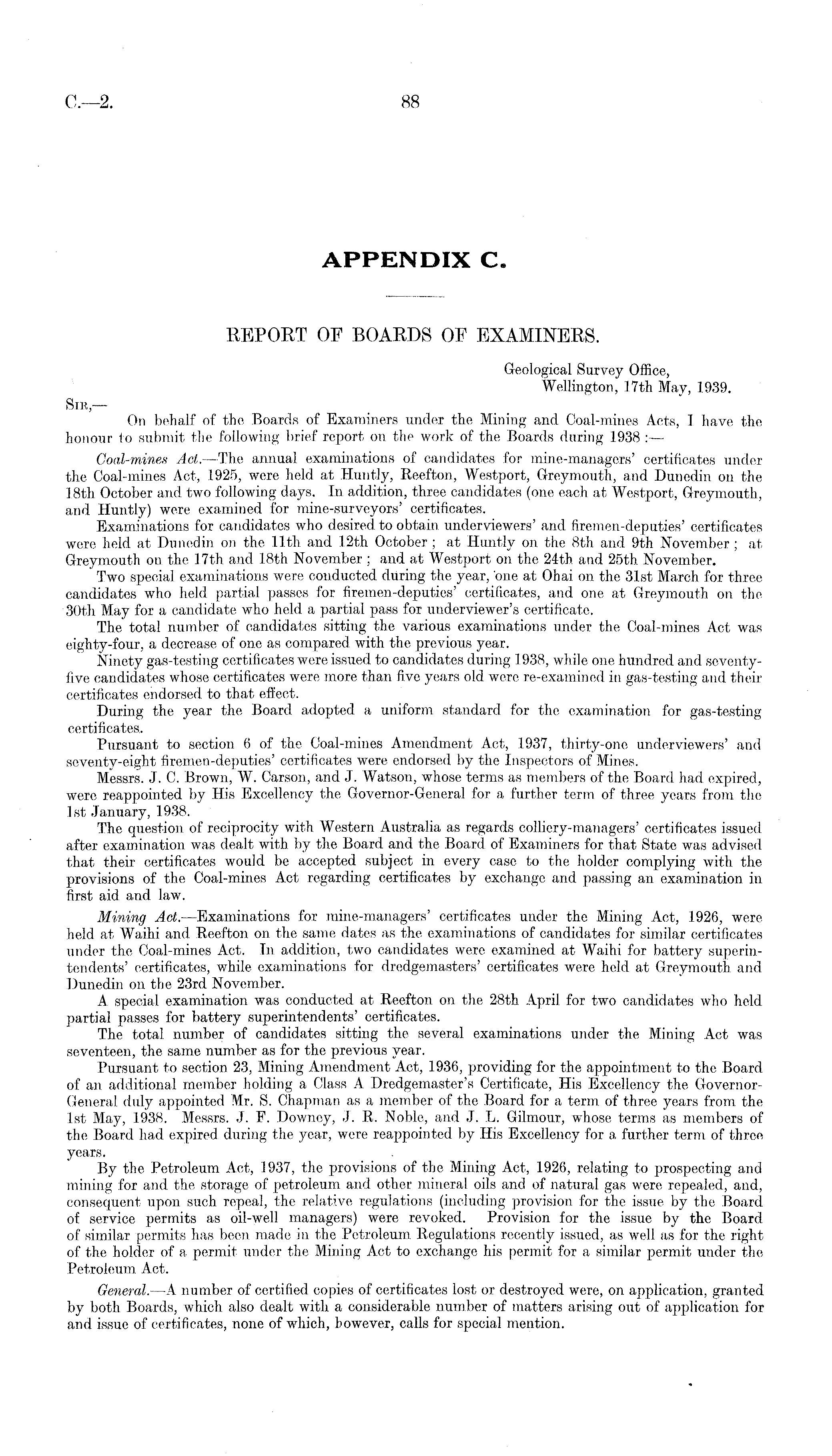 REPORT OF BOARDS OF EXAMINERS. Geological Survey Office, Wellington, 17th May, 1939. Sir, — On behalf of the Boards of Examiners under the Mining and Coal-mines Acts, 1 have the honour to submit the following brief report on the work of the Boards during 1938 : — Coal-mines Act.—The annual examinations of candidates for mine-managers' certificates under the Coal-mines Act, 1925, were held at Huntly, Reefton, Westport, Greymouth, and Dunedin on the 18th October and two following days. In addition, three candidates (one each at Westport, Greymouth, and Huntly) were examined for mine-surveyors' certificates. Examinations for candidates who desired to obtain underviewers' and firemen-deputies' certificates were held at Dunedin on the 11th and 12th October ; at Huntly on the Bth and 9th November ; at Greymouth on the 17th and 18th November ; and at Westport on the 24th and 25th November. Two special examinations were conducted during the year, one at Ohai on the 31st March for three candidates who held partial passes for firemen-deputies' certificates, and one at Greymouth on the 30th May for a candidate who held a partial pass for underviewer's certificate. The total number of candidates sitting the various examinations under the Coal-mines Act was eighty-four, a decrease of one as compared with the previous year. Ninety gas-testing certificates were issued to candidates during 1938, while one hundred and seventyfive candidates whose certificates were more than five years old were re-examined in gas-testing and their certificates endorsed to that effect. During the year the Board adopted a uniform standard for the examination for gas-testing certificates. Pursuant to section 6 of the Coal-mines Amendment Act, 1937, thirty-one underviewers' and seventy-eight firemen-deputies' certificates were endorsed by the Inspectors of Mines. Messrs. J. C. Brown, W. Carson, and J. Watson, whose terms as members of the Board had expired, were reappointed by His Excellency the Governor-General for a further term of three years from the Ist January, 1938. The question of reciprocity with Western Australia as regards colliery-managers' certificates issued after examination was dealt with by the Board and the Board of Examiners for that State was advised that their certificates would be accepted subject in every case to the holder complying with the provisions of the Coal-mines Act regarding certificates by exchange and passing an examination in first aid and law. Mining Act. —Examinations for mine-managers' certificates under the Mining Act, 1926, were held at Waihi and Reefton on the same dates as the examinations of candidates for similar certificates under the Coal-mines Act. In addition, two candidates were examined at Waihi for battery superintendents' certificates, while examinations for dredgemasters' certificates were held at Greymouth and Dunedin on the 23rd November. A special examination was conducted at Reefton on the 28th April for two candidates who held, partial passes for battery superintendents' certificates. The total number of candidates sitting the several examinations under the Mining Act was seventeen, the same number as for the previous year. Pursuant to section 23, Mining Amendment Act, 1936, providing for the appointment to the Board of an additional member holding a Class A Dredgemaster's Certificate, His Excellency the GovernorGeneral duly appointed Mr. S. Chapman as a member of the Board for a term of three years from the Ist May, 1938. Messrs. J. F. Downey, J. R. Noble, and J. L. Gilmour, whose terms as members of the Board had expired during the year, were reappointed by His Excellency for a further term of three years. By the Petroleum Act, 1937, the provisions of the Mining Act, 1926, relating to prospecting and mining for and the storage of petroleum and other mineral oils and of natural gas were repealed, and, consequent upon such repeal, the relative regulations (including provision for the issue by the Board of service permits as oil-well managers) were revoked. Provision for the issue by the Board of similar permits has been made in the Petroleum Regulations recently issued, as well as for the right of the holder of a permit under the Mining Act to exchange his permit for a similar permit under the Petroleum Act. General. —A number of certified copies of certificates lost or destroyed were, on application, granted by both Boards, which also dealt with a considerable number of matters arising out of application for and issue of certificates, none of which, however, calls for special mention.