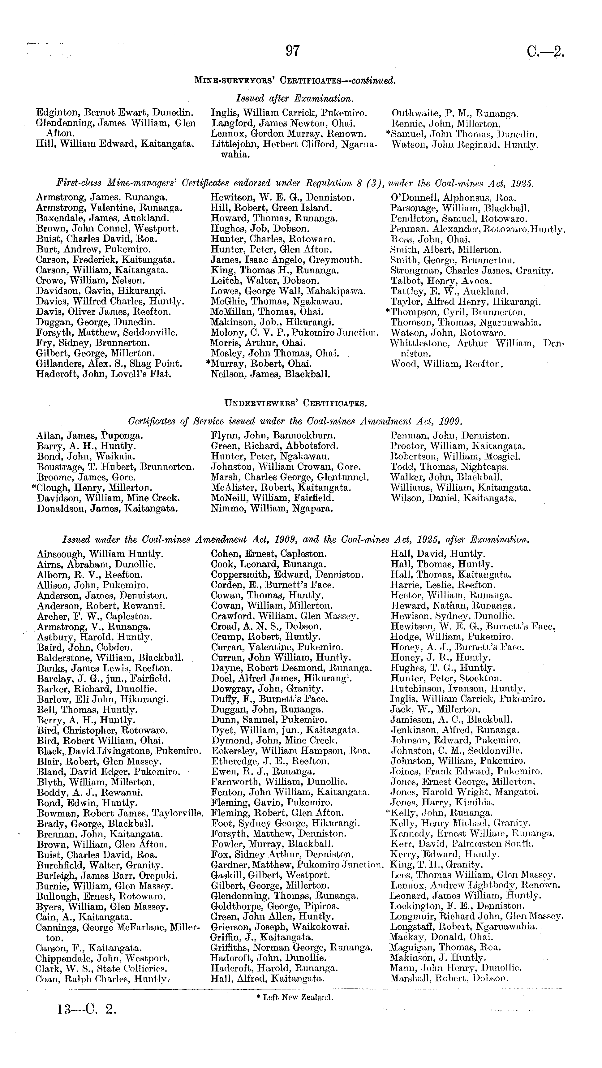 Mine-surveyors' Certifioates—continued. Issued after Examination. Edginton, Bernot Ewart, Dunedin. Inglis, William Carrick, Pukemiro. Outhwaito, P. M„ Runanga. Glendenning, .Tames William, Glen Langford, James Newton, Ohai. Rennie, John, Millerton. Alton. Lennox, Gordon Murray, Renown. *Samuel, John Thomas, Dunedin. Hill, William Edward, Kaitangata. Littlejohn, Herbert Clifford, Ngarua- Watson, John Reginald, Huntly. wahia. First-class Mine-managers'' Certificates endorsed under Regulation 8 (3), under the Coal-mines Act, 1925. Armstrong, James, Runanga. Hewitson, W. E. G., Denniston. O'Donnell, Alphonsus, Roa. Armstrong, Valentine, Runanga. Hill, Robert, Green Island. Parsonage, William, Blackball. Baxendale, James, Auckland. Howard, Thomas, Runanga. Pendleton, Samuel, Rotowaro. Brown, John Connel, Westport. Hughes, Job, Dobson. Penman, Alexander, Rotowaro,Huntly. Buist, Charles David, Roa. Hunter, Charles, Rotowaro. Ross, John, Ohai. Burt, Andrew, Pukemiro. Hunter, Peter, Glen Afton. Smith, Albert, Millerton. Carson, Frederick, Kaitangata. James, Isaac Angelo, Greymouth. Smith, George, Brunnerton. Carson, William, Kaitangata. King, Thomas H., Runanga. Strongman, Charles James, Granity. Crowe, William, Nelson. .Leitch, Walter, Dobson. Talbot, Henry, Avoca. Davidson, Gavin, Hikurangi. Lowes, George Wall, Mahakipawa. Tattley, E. W, Auckland. Davies, Wilfred Charles, Huntly. McGhie, Thomas, Ngakawau. Taylor, Alfred Henry, Hikurangi. Davis, Oliver James, Reefton. McMillan, Thomas, Ohai. "Thompson, Cyril, Brunnerton. Duggan, George, Dunedin. Makinson, Job., Hikurangi. Thomson, Thomas, Ngaruawahia. Forsyth, Matthew, Seddonville. Molony, C. V. P., Pukemiro Junction. Watson, John, Rotowaro. Fry, Sidney, Brunnerton. Morris, Arthur, Ohai. Whittlestone, Arthur William, DenGilbert, George, Millerton. Mosley, John Thomas, Ohai. niston. Gillanders, Alex. S., Shag Point. ""Murray, Robert, Ohai. Wood, William, Reefton. Iladcroft, John, Lovell's Flat. Neilson, James, Blackball. Underviewers' Certificates. Certificates of Service issued under the Coal-mines Amendment Act, 1900. Allan, James, Puponga. Flynn, John, Bannockburn. Penman, John, Denniston. Barry, A. H., Huntly. Green, Richard, Abbotsford. Proctor, William, Kaitangata. Bond, John, Waikaia. Hunter, Peter, Ngakawau. Robertson, William, Mosgiel. Boustrage, T. Hubert, Brunnerton. Johnston, William Crowan, Gore. Todd, Thomas, Nightcaps. Broome, James, Gore. Marsh, Charles George, Glentunnel. Walker, John, Blackball. •Clough, Henry, Millerton. McAlistcr, Robert, Kaitangata. Williams, William, Kaitangata. Davidson, William, Mine Creek. McNeill, William, Fairfield. Wilson, Daniel, Kaitangata. Donaldson, James, Kaitangata. Nimmo, William, Ngapara. Issued under the Coal-mines Amendment Act, 1909, and the Coal-mines Act, 1925, after Examination. Ainscough, William Huntly. Cohen, Ernest, Capleston. Hall, David, Huntly. Aims, Abraham, Dunollie. Cook, Leonard, Runanga. Hall, Thomas, Huntly. Alborn, R. V., Reefton. Coppersmith, Edward, Denniston. Hall, Thomas, Kaitangata. Allison, John, Pukemiro. Corden, E., Burnett's Face. Harrie, Leslie, Reefton. Anderson, James, Denniston. Cowan, Thomas, Huntly. Hector, William, Runanga. Anderson, Robert, Rewanui. Cowan, William, Millerton. Heward, Nathan, Runanga. Archer, F. W., Capleston. Crawford, William, Glen Massey. Hewison, Sydney, Dunollie. Armstrong, V., Runanga. Croad, A. N. S„ Dobson. Hewitson, W. E. G., Burnett's Face. Astbury, Harold, Huntly. Crump, Robert, Huntly. Hodge, William, Pukemiro. Baird, John, Cobden. Curran, Valentine, Pukemiro. Honey, A. J., Burnett's Face. Balderstone, William, Blackball. Curran, John William, Huntly. Honey, J. R., Huntly. Banks, James Lewis, Reefton. Dayne, Robert Desmond, Runanga. Hughes, T. G., Huntly. Barclay, J. G., jun,, Fairfield. Doel, Alfred James, Hikurangi. Hunter, Peter, Stockton. Barker, Richard, Dunollie. Dowgray, John, Granity. Hutchinson, Ivanson, Huntly. Barlow, Eli John, Hikurangi. Duffy, F., Burnett's Face. Inglis, William Carrick, Pukemiro. Bell, Thomas, Huntly. Duggan, John, Runanga. Jack, W., Millerton. Berry, A. 11., Huntly. Dunn, Samuel, Pukemiro. Jamieson, A. C., Blackball. Bird, Christopher, Rotowaro. Dyet, William, jun., Kaitangata. Jenkinson, Alfred, Runanga. Bird, Robert William, Ohai. Dymond, John, Mine Creek. Johnson, Edward, Pukemiro. Black, David Livingstone, Pukemiro. Eckersley, William Hampson, Roa. Johnston, C. M., Seddonville. Blair, Robort, Glen Massey. Etheredge, J. E., Reefton. Johnston, William, Pukemiro. Bland, David Edger, Pukemiro. Ewen, R. J., Runanga. Joines, Frank Edward, Pukemiro. Blyth, William, Millerton. Farnwortb, William, Dunollie. .Tones, Ernest George, Millerton. Boddy, A. J., Rewanui. Fenton, John William, Kaitangata. Jones, Harold Wright, Mangatoi. Bond, Edwin, Huntly. Fleming, Gavin, Pukemiro. Jones, Harry, Kimihia. Bowman, Robert James, Taylorville. Fleming, Robert, Glen Afton. *Kelly, John, Runanga. Brady, George, Blackball. Foot, Sydney George, Hikurangi. Kelly, Henry Michael, Granity. Brennan, John, Kaitangata. Forsyth, Matthew, Denniston. Kennedy, Ernest William, Runanga. Brown, William, Glen Afton. Fowler, Murray, Blackball. Kerr, David, Palmerston South. Buist, Charles David, Roa. Fox, Sidney Arthur, Denniston. Kerry, Edward, Huntly. Burclifield, Walter, Granity. Gardner, Matthew, Pukemiro Junction. King, T. H., Granity. Burleigh, James Barr, Orepuki. Gaskill, Gilbert, Westport. Lees, Thomas William, Glen Massey. Burnie, William, Glen Massey. Gilbert, George, Millerton. Lennox, Andrew Lightbody, Renown. Bullough, Ernest, Rotowaro. Glendenning, Thomas, Runanga. Leonard, James William, Huntly. Byers, William, Glen Massey. Goldthorpe, George, Pipiroa. Lockington, F. E., Denniston. Cain, A., Kaitangata. Green, John Allen, Huntly. Longmuir, Richard John, Glen Massey. Cannings, George McFarlane, Miller- Grierson, Joseph, Waikokowai. Longstaff, Robert, Ngaruawahia. ton. Griffin, J., Kaitangata. Mackay, Donald, Ohai.