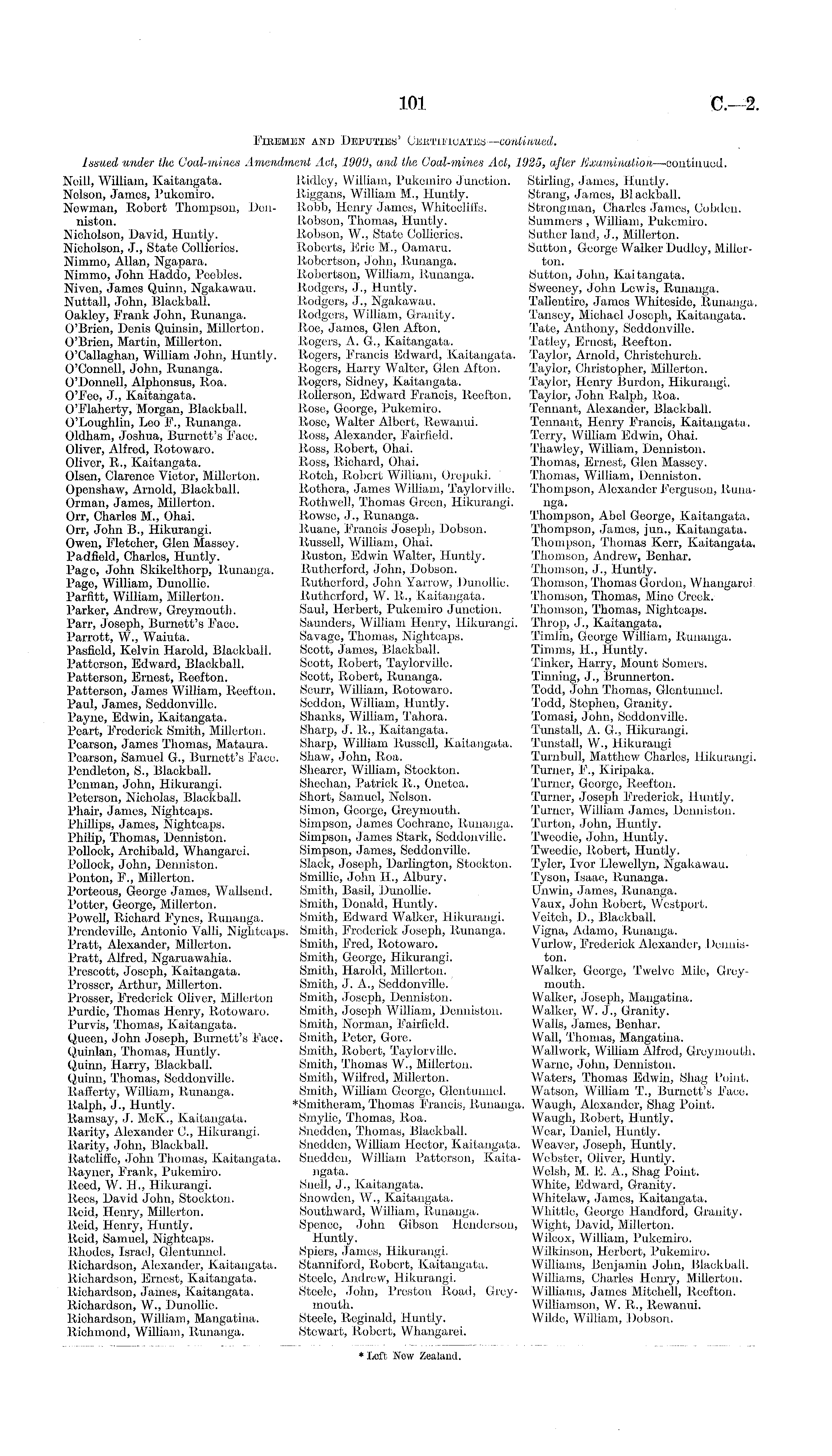 Firemen and Deputies' CjsnTmoATJis— continued. Issued under the Coal-mines Amendment Act, 1000, mid the Coal-mines Act, 1025, after Examination—continued. Neill, William, Kaitangata. Hidloy, William, Pukemiro Junction. Stirling, James, Huntly. Nolson, James, l'ukemiro. Riggans, William M., Huntly. Strang, James, Blackball. Newman, Robert Thompson, Den- Robb, Henry James, Whitocliffs. Strongman, Charles James, Cobdon. niston. llobson, Thomas, Huntly. Summers, William, Pukemiro. Nicholson, David, Huntly. llobson, W., State Collieries. Suther land, J., Millerton. Nicholson, J., State Collieries. Roberts, Eric M., Oamaru. Sutton, George Walker Dudley, MillerNimmo, Allan, Ngapara. Robertson, John, Runanga. ton. Nimmo, John Haddo, Peebles. Robertson, William, Runanga. Sutton, John, Kaitangata. Niven, James Quinn, Ngakawau. Rodgers, J., Huntly. Sweeney, John Lewis, Runanga. Nuttall, John, Blackball. Rodgers, J., Ngakawau. Tallentiro, James Whiteside, Runanga. Oakley, Frank John, Runanga. Rodgers, William, Granity. Tansey, Michael Joseph, Kaitangata. O'Brien, Denis Quinsin, Millerton. Roe, James, Glen Afton. Tate, Anthony, Seddonville. O'Brien, Martin, Millerton. Rogers, A. G., Kaitangata. Tatley, Ernest, Reefton. O'Callaghan, William John, Huntly. Rogers, Francis Edward, Kaitangata. Taylor, Arnold, Christcliurch. O'Connell, John, Runanga. Rogers, Harry Walter, Glen Afton. Taylor, Christopher, Millerton. O'Donnell, Alphonsus, Roa. Rogers, Sidney, Kaitangata. Taylor, Henry Burdon, Hikurangi. O'Fee, J., Kaitangata. Rolierson, Edward Francis, Reefton. Taylor, John Ralph, Roa. O'Flaherty, Morgan, Blackball. Rose, George, Pukemiro. Tennant, Alexander, Blackball. O'Loughlin, Leo F., Runanga. Rose, Walter Albert, Rewanui. Tennant, Henry Francis, Kaitangata. Oldham, Joshua, Burnett's Face. Ross, Alexander, Fairfield. Terry, William Edwin, Ohai. Oliver, Alfred, Rotowaro. Ross, Robert, Ohai. Thawley, William, Denniston. Oliver, R., Kaitangata. Ross, Richard, Ohai. Thomas, Ernest, Glen Massey. Olsen, Clarence Yiotor, Millerton. Rotch, Robert William, Orepuki. Thomas, William, Denniston. Openshaw, Arnold, Blackball. Rothera, James William, Taylorville. Thompson, Alexander Ferguson, RunaOrman, James, Millerton. Rothwell, Thomas Green, Hikurangi. nga. Orr, Charles M., Ohai. Rowse, J ~ Runanga. Thompson, Abel George, Kaitangata. Orr, John 8., Hikurangi. Ruane, Francis Joseph, Dobson. Thompson, James, jun., Kaitangata. Owen, Fletcher, Glen Massey. Russell, William, Ohai. Thompson, Thomas Kerr, Kaitangata. Padfield, Charles, Huntly. Ruston, Edwin Walter, Huntly. Thomson, Andrew, Benhar. Page, John Skikelthorp, Runanga. Rutherford, John, Dobson. Thomson, J., Huntly. Page, William, Dunollie. Rutherford, John Yarrow, Dunollie. Thomson, Thomas Gordon, Whangarei Parfitt, William, Millerton. Rutherford, W. R., Kaitangata. Thomson, Thomas, Mino Creek. Parker, Andrew, Greymouth. Saul, Herbert, Pukemiro Junction. Thomson, Thomas, Nightcaps. Parr, Joseph, Burnett's Faeo. Saunders, William Henry, Hikurangi. Tlirop, J., Kaitangata. Parrott, W., Waiuta. Savage, Thomas, Nightcaps. Timlin, George William, Runanga. Pasficld, Kelvin Harold, Blackball. Scott, James, Blackball. Timms, H., Huntly. Pattorson, Edward, Blackball. Scott, Robert, Taylorville. Tinker, Harry, Mount Somers. Patterson, Ernest, Reefton. Scott, Robert, Runanga. Tinning, J., Brunnerton. Patterson, James William, Reefton. Scurr, William, Rotowaro. Todd, John Thomas, Glentunnel. Paul, James, Seddonville. Seddon, William, Huntly. Todd, Stephen, Granity. Payne, Edwin, Kaitangata. Shanks, William, Tahora. Tomasi, John, Seddonville. Peart, Frederick Smith, Millerton. Sharp, J. R., Kaitangata. Tunstall, A. G., Hikurangi. Pearson, James Thomas, Mataura. Sharp, William Russell, Kaitangata. Tunstall, W., Hikurangi Pearson, Samuel G., Burnett's Face. Shaw, John, Roa. Turnbull, Matthow Charles, Hikurangi. Pendleton, S., Blackball. Shearer, William, Stockton. Turner, F., Kiripaka. Penman, John, Hikurangi. Sheehan, Patrick R., Onetea. Turner, George, Reefton. Peterson, Nicholas, Blackball. Short, Samuel, Nolson. Turner, Joseph Frederick, Huntly. Pliair, James, Nightcaps. Simon, George, Greymouth. Turner, William James, Denniston. Phillips, James, Nightcaps. Simpson, James Cochrane, Runanga. Turton, John, Huntly. Philip, Thomas, Denniston. Simpson, James Stark, Seddonville. Tweedie, John, Huntly. Pollock, Archibald, Whangarei. Simpson, James, Seddonville. Tweedie, Robert, Huntly. Pollock, John, Denniston. Slack, Joseph, Darlington, Stockton. Tyler, Ivor Llewellyn, Ngakawau. Ponton, F., Millerton. Smillie, John 11., Albury. Tyson, Isaac, Runanga. Porteous, George James, Wallsend. Smith, Basil, Dunollie. Unwin, James, Runanga. Potter, George, Millerton. Smith, Donald, Huntly. Vaux, John Robert, Westport. Powell, Richard Fynes, Runanga. Smith, Edward Walker, Hikurangi. Veitch, D., Blackball. Prcndeville, Antonio Yalli, Nightcaps. Smith, Frederick Joseph, Runanga. Vigna, Adamo, Runanga. Pratt, Alexander, Millerton. Smith, Fred, Rotowaro. Vurlow, Frederick Alexander, DennisPratt, Alfred, Ngaruawahia. Smith, George, Hikurangi. ton. Prescott, Joseph, Kaitangata. Smith, Harold, Millerton. Walker, George, Twelve Mile, Groy--I'rosser, Arthur, Millerton. Smith, J. A., Seddonville. mouth. Prosser, Frederick Oliver, Millerton Smith, Joseph, Denniston. Walker, Joseph, Mangatina. Purdie, Thomas Henry, Rotowaro. Smith, Joseph William, Denniston. Walker, W. J., Granity. Purvis, Thomas, Kaitangata. Smith, Norman, Fairfield. Walls, James, Benhar. Queen, John Joseph, Burnett's Face. Smith, Peter, Gore. Wall, Thomas, Mangatina. Quinlan, Thomas, Huntly. Smith, Robert, Taylorville. Wallwork, William Alfred, Greymouth. Quinn, Harry, Blackball. Smith, Thomas W., Millerton. Warnc, John, Denniston. Quinn, Thomas, Seddonville. Smith, Wilfred, Millerton. Waters, Thomas Edwin, Shag Point. Rafferty, William, Runanga. Smith, William George, Glentunnel. Watson, William T., Burnett's Face. Ralph, J., Hun