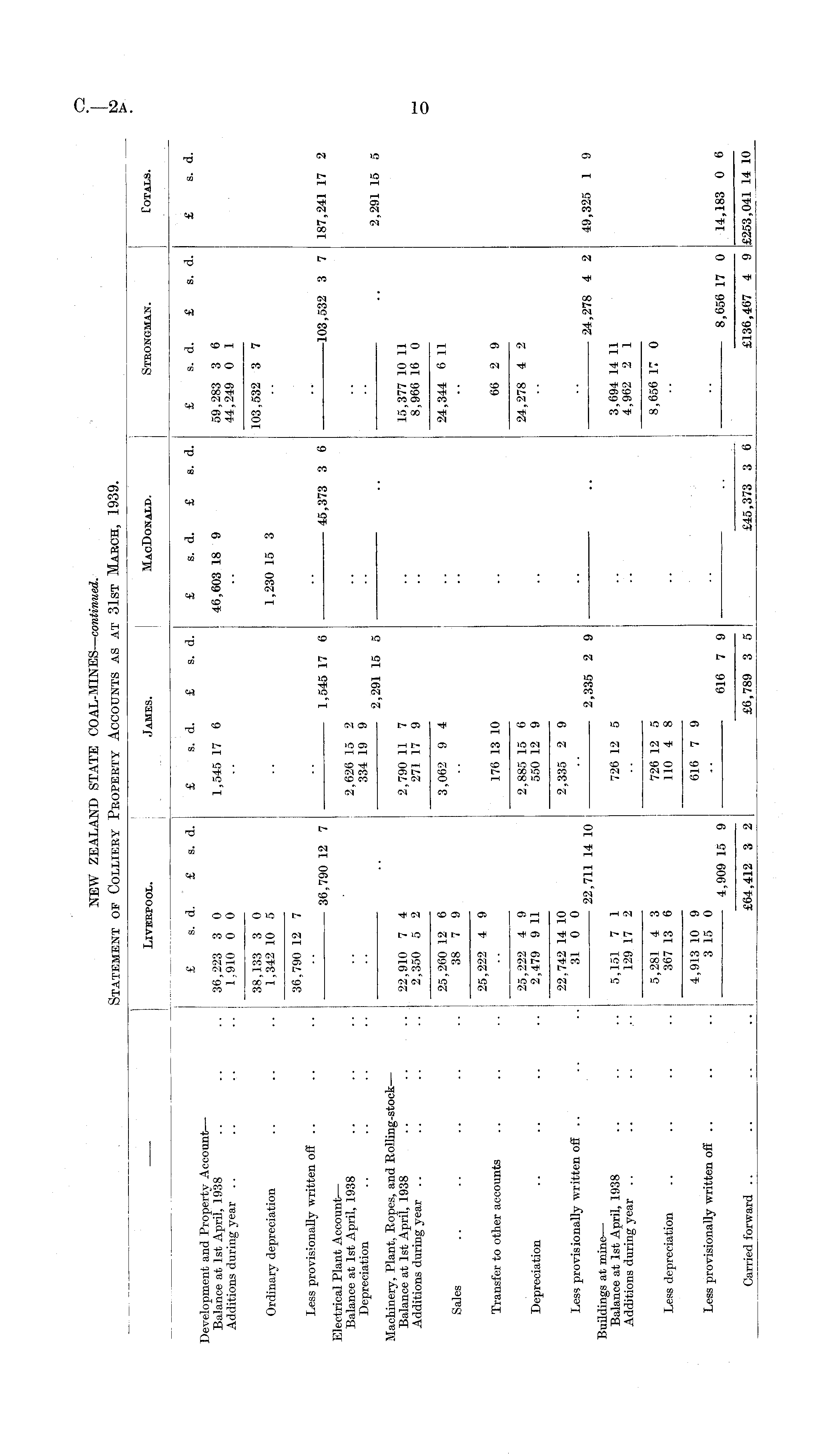 Liverpool. James. MacDonald. Strongman. ITotals. £ s. d. £ s. d. £ s. d. £ s. d. £ s. d. £ s. d. £ s. d. £ s. d. £ s. d. Development and Propertv Account —- Balance at 1st April, 1938 .. .. .. 36,223 3 0 1,545 17 6 46,603 18 9 59,283 3 6 Additions during year .. .. .. .. j 1,910 0 0 .. .. 44,249 0 1 38,133 3 0 103,532 3 7 Ordinary depreciation .. .. .. 1,342 10 5 .. 1,230 15 3 36,790 12 7 Less provisionally written off ...... 36,790 12 7 1,545 17 6 — — 45,373 3 6 103,532 3 7 187,241 17 2 Electrical Plant Account — Balance at 1st April, 1938 .. .. .. .. 2,626 15 2 Depreciation .. .. .. .. . ■ ! 334 19 9 .. .. .. 2,291 15 5 — .. — — .. 2,291 15 5 Machinery, Plant, Hopes, and Rolling-stock — Balance at 1st April, 1938 .. .. 22,910 7 4 2,790 11 7 .. 15,377 10 11 Additions during year .. .. .. 2,350 5 2 271 17 9 .. 8,966 16 0 j 25,260 12 6 3,062 9 4 .. 24,344 6 11 Sales .. .. .. .. .. | 38 7 9 25,222 4 9 Transfer to other accounts .. .. .. .. 176 13 10 .. 66 2 9 25,222 4 9 2,885 15 6 24,278 4 2 Depreciation .. .. .. .. 2,479 9 11 550 12 9 22,742 14 10 2,335 2 9 Less provisionally written off ...... 31 0 0 22,711 14 10 2,335 2 9 .. 24,278 4 2 49,325 1 9 Buildings at mine — Balance at 1st April, 1938 .. .. 5,151 7 1 726 12 5 .. 3,694 14 11 Additions during year .. .. .. •• 129 17 2 .. .. 4,962 2 1 ; 5,281 4 3 726 12 5 8,656 17 0 Less depreciation .. .. .. .. 367 13 6 110 4 8 .. J 4,913 10 9 616 7 9 Less provisionally written off ; 3 15 0 ; 4,909 15 9 616 7 9 .. 8,656 17 0 14,183 0 6 Carried forward ■■ .. -■ .. j £64,412 3 2 £6,789 3 5 £45,373 3 6 i £136,467 4 9 £253,041 14 10