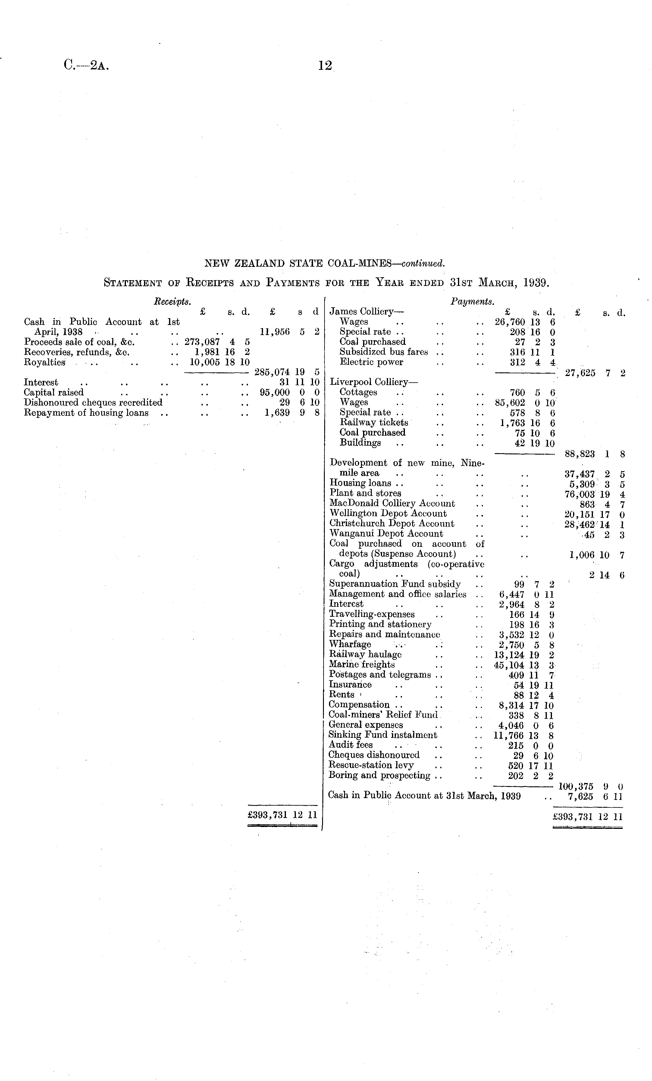 NEW ZEALAND STATE COAL-MlNES—continued. Statement of Receipts and Payments for the Year ended 31st March, 1939. Receipts. Payments. £ s. d. £ s (1 Jainea Colliery— £ s. d. £ s. d. Cash in Public Account at Ist Wages .. .. .. 26,700 13 6 April, 1938 .. .. .. 11,956 5 2 Special rate .. .. .. 208 16 0 Proceeds sale of coal, &c. .. 273,087 4 5 Coal purchased .. .. 27 2 3 Recoveries, refunds, &o. .. 1,981 16 2 Subsidized bus fares .. .. 316 11 1 Royalties .. .. .. 10,005 18 10 Electric power .. .. 312 4 4 285,074 19 5 27,625 7 2 Interest .. .. .. .. .. 31 11 10 Liverpool Colliery— Capital raised .. .. .. .. 95,000 0 0 Cottages .. .. .. 760 5 6 Dishonoured cheques recredited .. .. 29 6 10 Wages .. .. .. 85,602 0 10 Repayment of housing loans .. .. .. 1,639 9 8 Special rate .. .. .. 578 8 6 Railway tickets .. .. 1,763 16 6 Coal purchased .. .. 75 10 6 Buildings .. .. .. 42 19 10 88,823 1 8 Development of new mine, Ninemile area .. .. .. .. 37,437 2 5 Housing loans .. .. .. .. 5,309 3 5 Plant and stores . . . . .. 76,003 19 4 Mac Donald Colliery Account .. .. 863 4 7 Wellington Depot Account .. .. 20,151 17 0 Christchurch Depot Account .. .. 28,462 14 1 Wanganui Depot Account .. .. 45 2 3 Coal purchased on account of depots (Suspense Account) .. .. 1,006 10 7 Cargo adjustments (co-operative coal) .. .. .. .. 2 14 6 Superannuation Fund subsidy .. 99 7 2 Management and office salaries . . 6,447 011 Interest .. .. .. 2,964 8 2 Travelling-expenses .. . . 166 14 9 Printing and stationery . . 198 16 3 Repairs and maintenance .. 3,532 12 0 Wharfage .. . . . . 2,750 5 8 Railway haulage .. .. 13,124 19 2 Marine freights .. .. 45,104 13 3 Postages and telegrams .. 409 11 7 Insurance .. .. 54 19 11 Rents ' .. .. 88 12 4 Compensation .. .. . . 8,314 17 10 Coal-miners' Relief Fund ... 338 8 11 General expenses .. .. 4,046 0 6 Sinking Eurid instalment .. 11,766 13 8 Audit fees .. .. . . 215 0 0 Cheques dishonoured .. .. 29 610 Rescue-station levy .. .. 520 17 11 Boring and prospecting .. .. 202 22 100,375 9 0 Cash in Public Account at 31st March, 1939 .. 7,625 6 1] £393,731 12 11 £393/731 12 11