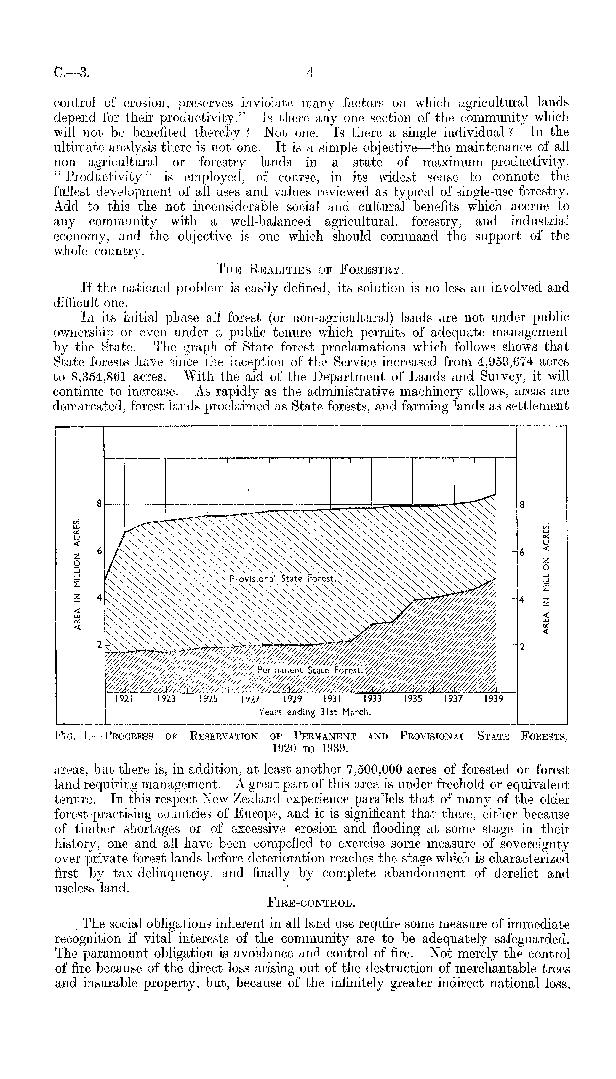 control of erosion, preserves inviolate many factors on which agricultural lands depend for their productivity." Is there any one section of the community which will not be benefited thereby ? Not one. Is there a single individual ? In the ultimate analysis there is not one. It is a simple objective —the maintenance of all non - agricultural or forestry lands in a state of maximum productivity. " Productivity" is employed, of course, in its widest sense to connote the fullest development of all uses arid values reviewed as typical of single-use forestry. Add to this the not inconsiderable social and cultural benefits which accrue to any community with a well-balanced agricultural, forestry, and industrial economy, and the objective is one which should command the support of the whole country. The Realities of Forestry. If the national problem is easily defined, its solution is no less an involved and difficult one. In its initial phase all forest (or non-agricultural) lands are not under public ownership or even under a public tenure which permits of adequate management by the State. The graph of State forest proclamations which follows shows that State forests have since the inception of the Service increased from 4,959,674 acres to 8,354,861 acres. With the aid of the Department of Lands and Survey, it will continue to increase. As rapidly as the administrative machinery allows, areas are demarcated, forest lands proclaimed as State forests, and farming lands as settlement