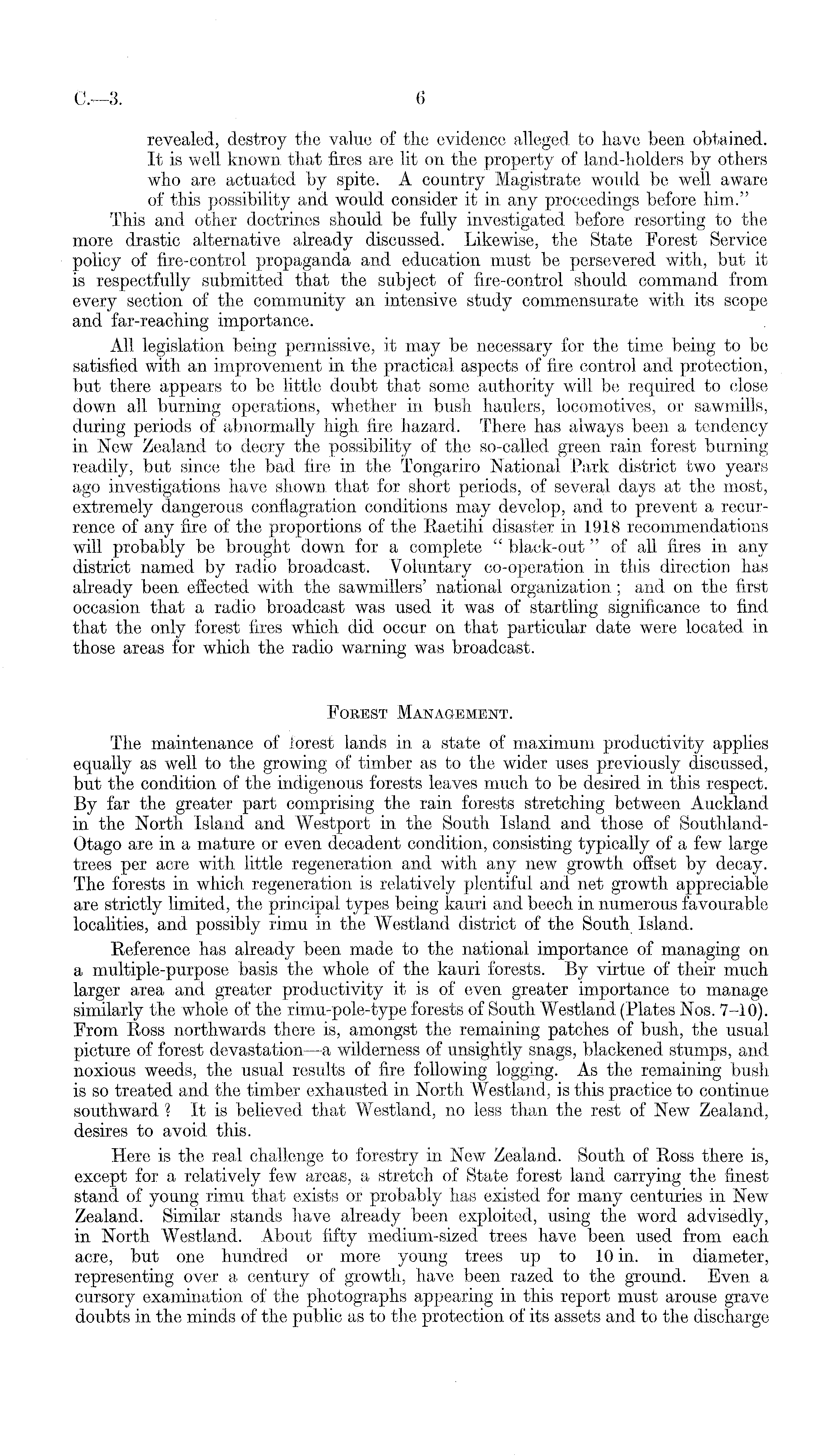 revealed, destroy the value of the evidence alleged to have been obtained. It is well known, that fires are lit on the property of land-holders by others who are actuated by spite. A country Magistrate would be well aware of this possibility and would consider it in any proceedings before him." This and other doctrines should be fully investigated before resorting to the more drastic alternative already discussed. Likewise, the State Forest Service policy of fire-control propaganda and education must be persevered with, but it is respectfully submitted that the subject of fire-control should command from every section of the community an intensive study commensurate with its scope and far-reaching importance. All legislation being permissive, it may be necessary for the time being to be satisfied with an improvement in the practical aspects of fire control and protection, but there appears to be little doubt that some authority will be required to close down all burning operations, whether in bush haulers, locomotives, or sawmills, during periods of abnormally high fire hazard. There has always been a tendency in New Zealand to decry the possibility of the so-called green rain forest burning readily, but since the bad fire in the Tongariro National Park district two years ago investigations have shown that for short periods, of several days at the most, extremely dangerous conflagration conditions may develop, and to prevent a recurrence of any fire of the proportions of the Raetihi disaster in 1918 recommendations will probably be brought down for a complete " black-out" of all fires in any district named by radio broadcast. Voluntary co-operation in this direction has already been effected with the sawmillers' national organization; and on the first occasion that a radio broadcast was used it was of startling significance to find that the only forest fires which did occur on that particular date were located in those areas for which the radio warning was broadcast. Forest Management. The maintenance of forest lands in a state of maximum productivity applies equally as well to the growing of timber as to the wider uses previously discussed, but the condition of the indigenous forests leaves much to be desired in this respect. By far the greater part comprising the rain forests stretching between Auckland in the North Island and Westport in the South Island and those of SouthlandOtago are in a mature or even decadent condition, consisting typically of a few large trees per acre with little regeneration and with any new growth offset by decay. The forests in which regeneration is relatively plentiful and net growth appreciable are strictly limited, the principal types being kauri and beech in numerous favourable localities, and possibly rimu in the Westland district of the South Island. Reference has already been made to the national importance of managing on a multiple-purpose basis the whole of the kauri forests. By virtue of their much larger area and greater productivity it is of even greater importance to manage similarly the whole of the rimu-pole-type forests of South Westland (Plates Nos. 7-10). From Ross northwards there is, amongst the remaining patches of bush, the usual picture of forest devastation —a wilderness of unsightly snags, blackened stumps, and noxious weeds, the usual results of fire following logging. As the remaining bush is so treated and the timber exhausted in North Westland, is this practice to continue southward ? It is believed that Westland, no less than the rest of New Zealand, desires to avoid this. Here is the real challenge to forestry in New Zealand. South of Ross there is, except for a relatively few areas, a stretch of State forest land carrying the finest stand of young rimu that exists or probably has existed for many centuries in New Zealand. Similar stands have already been exploited, using the word advisedly, in North Westland. About fifty medium-sized trees have been used from each acre, but one hundred or more young trees up to 10 in. in diameter, representing over a century of growth, have been razed to the ground. Even a cursory examination of the photographs appearing in this report must arouse grave doubts in the minds of the public as to the protection of its assets and to the discharge