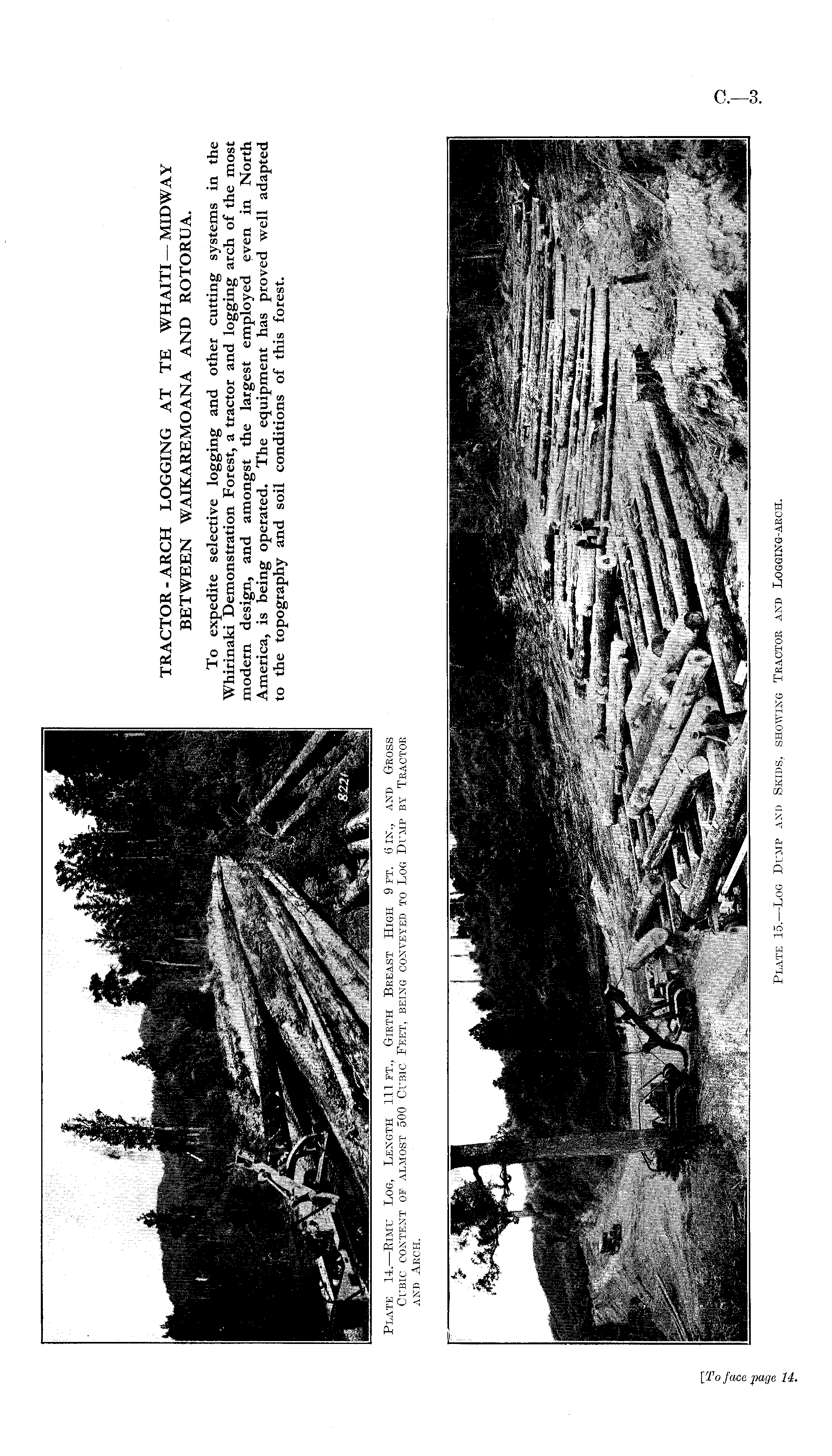 Plate 14.—Rimu Log, Length 111ft., Girth Breast High 9ft. 6in., and Gross Cubic content of almost 500 Cubic Feet, being conveyed to Log Dump by Tractor and Arch.