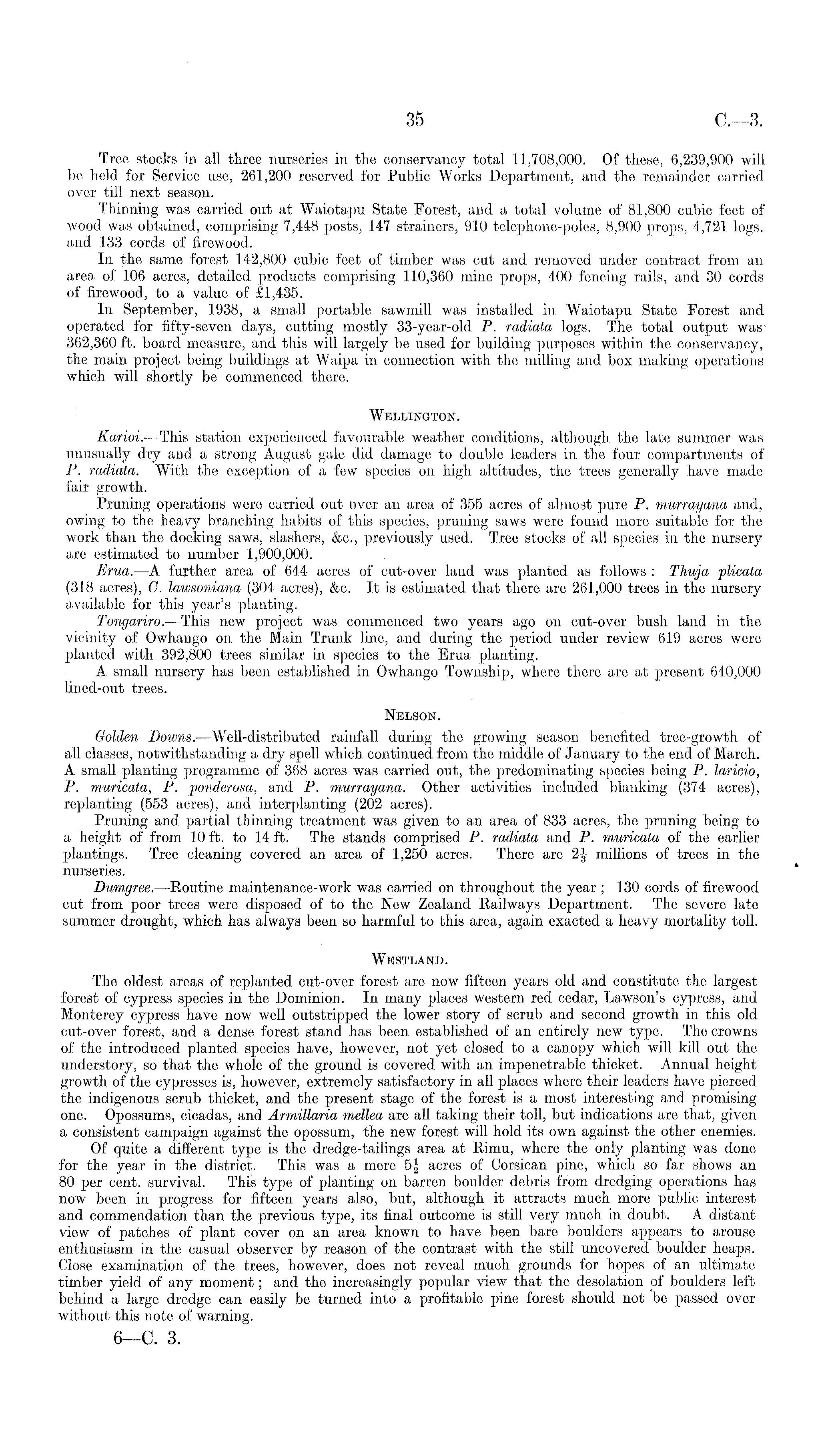 Tree stocks in all three nurseries in the conservancy total 11,708,000. Of these, 6,239,900 will bo held for Service use, 261,200 reserved for Public Works Department, and the remainder carried over till next season. Thinning was carried out at Waiotapu State Forest, and a total volume of 81,800 cubic feet of wood was obtained, comprising 7,448 posts, 147 strainers, 910 telephone-poles, 8,900 props, 4,721 logs, and 133 cords of firewood. In the same forest 142,800 cubic feet of timber was cut and removed under contract from an area of 106 acres, detailed products comprising 110,360 mine props, 400 fencing rails, and 30 cords of firewood, to a value of £1,435. In September, 1938, a small portable sawmill was installed in Waiotapu State Forest and operated for fifty-seven days, cutting mostly 33-year-old P. radiata logs. The total output was--362,360 ft. board measure, and this will largely be used for building purposes within the conservancy, the main project being buildings at Waipa in connection with the milling and box making operations which will shortly be commenced there. Wellington. Ka/rioi.—This station experienced favourable weather conditions, although the late summer was unusually dry and a strong August gale did damage to double leaders in the four compartments of P. radiata. With the exception of a few species on high altitudes, the trees generally have made fair growth. Pruning operations were carried out over an area of 355 acres of almost pure P. murrayana and, owing to the heavy branching habits of this species, pruning saws were found more suitable for the work than the docking saws, slashers, &c., previously used. Tree stocks of all species in the nursery are estimated to number 1,900,000. Erua.—A further area of 644 acres of cut-over land was planted as follows : Thuja plicata (318 acres), C. lawsoniana (304 acres), &c. It is estimated that there are 261,000 trees in the nursery available for this year's planting. Tongariro. —This new project was commenced two years ago on cut-over bush land in the vicinity of Owhango on the Main Trunk line, and during the period under review 619 acres were planted with 392,800 trees similar ill species to the Erua planting. A small nursery has been established in Owhango Township, where there are at present 640,000 lined-out trees. Nelson. Golden Downs.—Well-distributed rainfall during the growing season benefited tree-growth of all classes, notwithstanding a dry spell which continued from the middle of January to the end of March. A small planting programme of 368 acres was carried out, the predominating species being P. laricio, P. muricata, P. ponderosa, and P. murrayana. Other activities included blanking (374 acres), replanting (553 acres), and interplanting (202 acres). Pruning and partial thinning treatment was given to an area of 833 acres, the pruning being to a height of from 10 ft. to 14 ft. The stands comprised P. radiata and P. muricata of the earlier plantings. Tree cleaning covered an area of 1,250 acres. There are 2J millions of trees in the nurseries. Dumgree. —Routine maintenance-work was carried on throughout the year ; 130 cords of firewood cut from poor trees were disposed of to the New Zealand Railways Department. The severe late summer drought, which has always been so harmful to this area, again exacted a heavy mortality toll. Westland. The oldest areas of replanted cut-over forest are now fifteen years old and constitute the largest forest of cypress species in the Dominion. In many places western red cedar, Lawson's cypress, and Monterey cypress have now well outstripped the lower story of scrub and second growth in this old cut-over forest, and a dense forest stand has been established of an entirely new type. The crowns of the introduced planted species have, however, not yet closed to a canopy which will kill out the understory, so that the whole of the ground is covered with an impenetrable thicket. Annual height growth of the cypresses is, however, extremely satisfactory in all places where their leaders have pierced the indigenous scrub thicket, and the present stage of the forest is a most interesting and promising one. Opossums, cicadas, and Armillaria mellea are all taking their toll, but indications are that, given a consistent campaign against the opossum, the new forest will hold its own against the other enemies. Of quite a different type is the dredge-tailings area at Rimu, where the only planting was done for the year in the district. This was a mere 5| acres of Corsican pine, which so far shows an 80 per cent, survival. This type of planting on barren boulder debris from dredging operations has now been in progress for fifteen years also, but, although it attracts much more public interest and commendation than the previous type, its final outcome is still very much in doubt. A distant view of patches of plant cover on an area known to have been bare boulders appears to arouse enthusiasm in the casual observer by reason of the contrast with the still uncovered boulder heaps. Close examination of the trees, however, does not reveal much grounds for hopes of an ultimate timber yield of any moment; and the increasingly popular view that the desolation of boulders left behind a large dredge can easily be turned into a profitable pine forest should not be passed over without this note of warning.