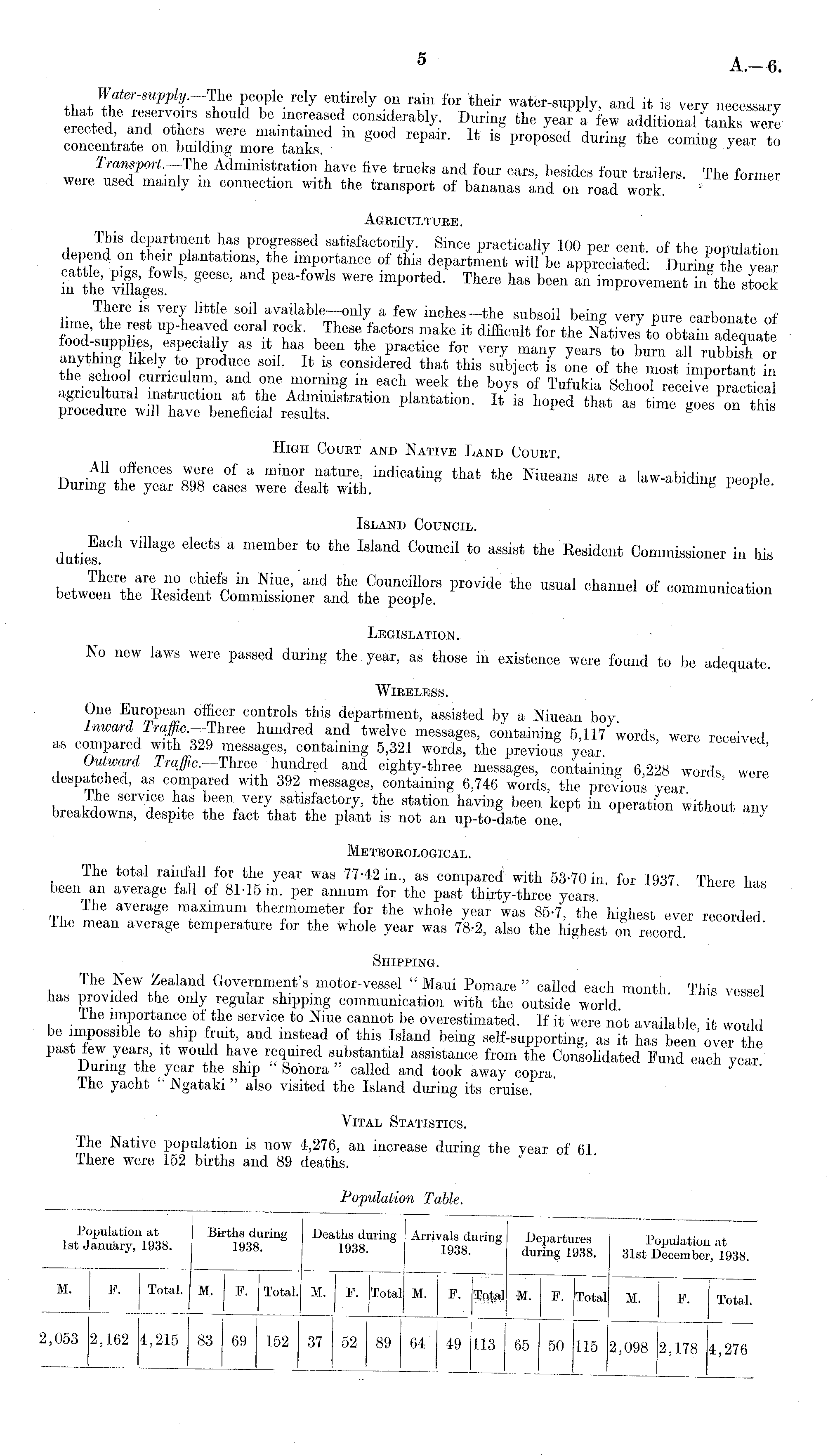 +1, ,t V® uT 7 eI1 J tlrel}r 011 ram for thelr water-supply, and it is very necessary that the reservoirs should be increased considerably. During the year a few additional tanks were erected and others were maintained m good repair. It is proposed during the coming year to concentrate on building more tanks. s By Tramport.-The Administration have five trucks and four cars, besides four trailers. The former were used mainly in connection with the transport of bananas and on road work. Agriculture. I his department has progressed satisfactorily. Since practically 100 per cent, of the population depend on their plantations the importance of this department will be appreciated. During the year in the viflages pea " fowls were lm P ortod - Ther e has been an improvement in the stock There is very little soil available—only a few inches—the subsoil being very pure carbonate of lime, the rest up-heaved coral rock. These factors make it difficult for the Natives to obtain adequate food-supplies, especially as it has been the practice for very many years to burn all rubbish or tTe scSol curriculum 0 * C ° nsider f tha * this sub J ect is 01le of th « most important in the school curriculum, and one morning m each week the boys of Tufukia School receive uracticd agricultural instruction at the Administration plantation. It is hoped that as time »oes on this procedure will have beneficial results. ° High Court and Native Land Court. .AH offences were of a minor nature, indicating that the Niueans are a law-abiding people During the year 898 cases were dealt with. people. Island Council. Villag6 eI6CtS a member t0 the Islalld Comicil t0 assist Resident Commissioner in his ■ , There are iio chiefs m Niue, and the Councillors provide the usual channel of communication between the Resident Commissioner and the people. Legislation. No new laws were passed during the year, as those in existence were found to be adequate. Wireless. One European officer controls this department, assisted by a Niuean boy. Inward Traffic.—Three hundred and twelve messages, containing 5,117 words were receiver! as compared with 329 messages, containing 5,321 words, the previous year. ' Outward Traffic. Three hundred and eighty-three messages, containing 6,228 words, were despatched, as compared with 392 messages, containing 6,746 words, the previous year. lie service has been very satisfactory, the station having been kept in operation without any breakdowns, despite the fact that the plant is not an up-to-date one. Meteorological. Ihe total rainfall for the year was 77-42 in., as compared with 53-70 in. for 1937 Thero been an average fall of 81-15 in. per annum for the past thirty-three years. The average maximum thermometer for the whole year was 85-7, the highest ever recorded Ihe mean average temperature for the whole year was 78-2, also the highest on record. Shipping. i The -?T i ealan , d Government's motor-vessel " Maui Pomare " called each month. This vessel has provided the only regular shipping communication with the outside world Ihe importance of the service to Niue cannot be overestimated. If it were not available, it would bt impossible to ship fruit, and instead of this Island being self-supporting, as it has been over the past few years, it would have required substantial assistance from the Consolidated Fund each year During the year the ship Sonora called and took away copra. Ihe yacht Ngataki " also visited the Island during its cruise. Vital Statistics. The Native population is now 4,276, an increase during the year of 61 There were 152 births and 89 deaths.