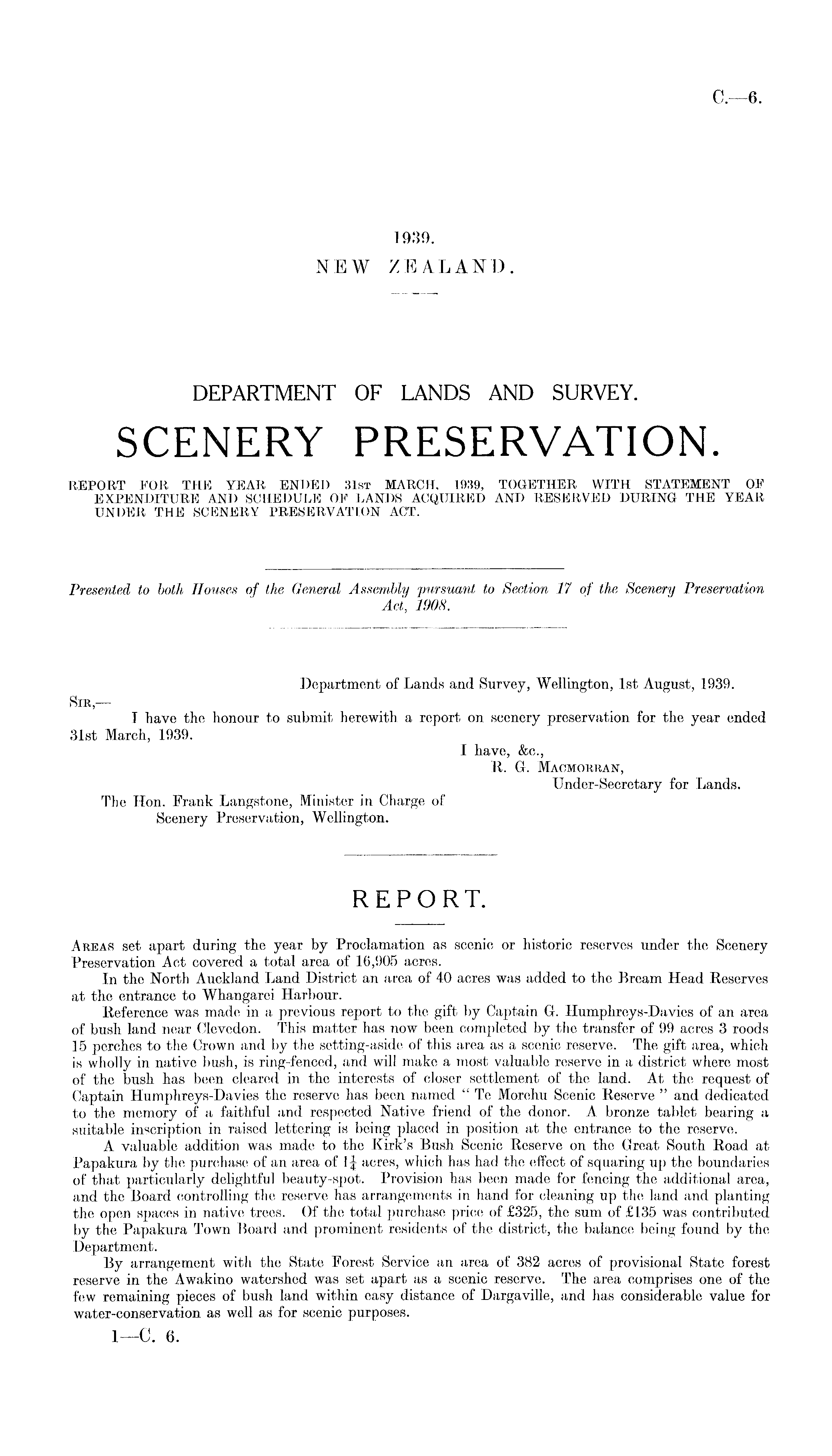 Department of Lands and Survey, Wellington, Ist August, 1939. Sir, — I have the honour to submit herewith a report on scenery preservation for the year ended 31st March, 1939. I have, &c., R. G. Macmorran, Under-Secretary for Lands. The Hon. Frank Langstone, Minister in Charge of Scenery Preservation, Wellington.