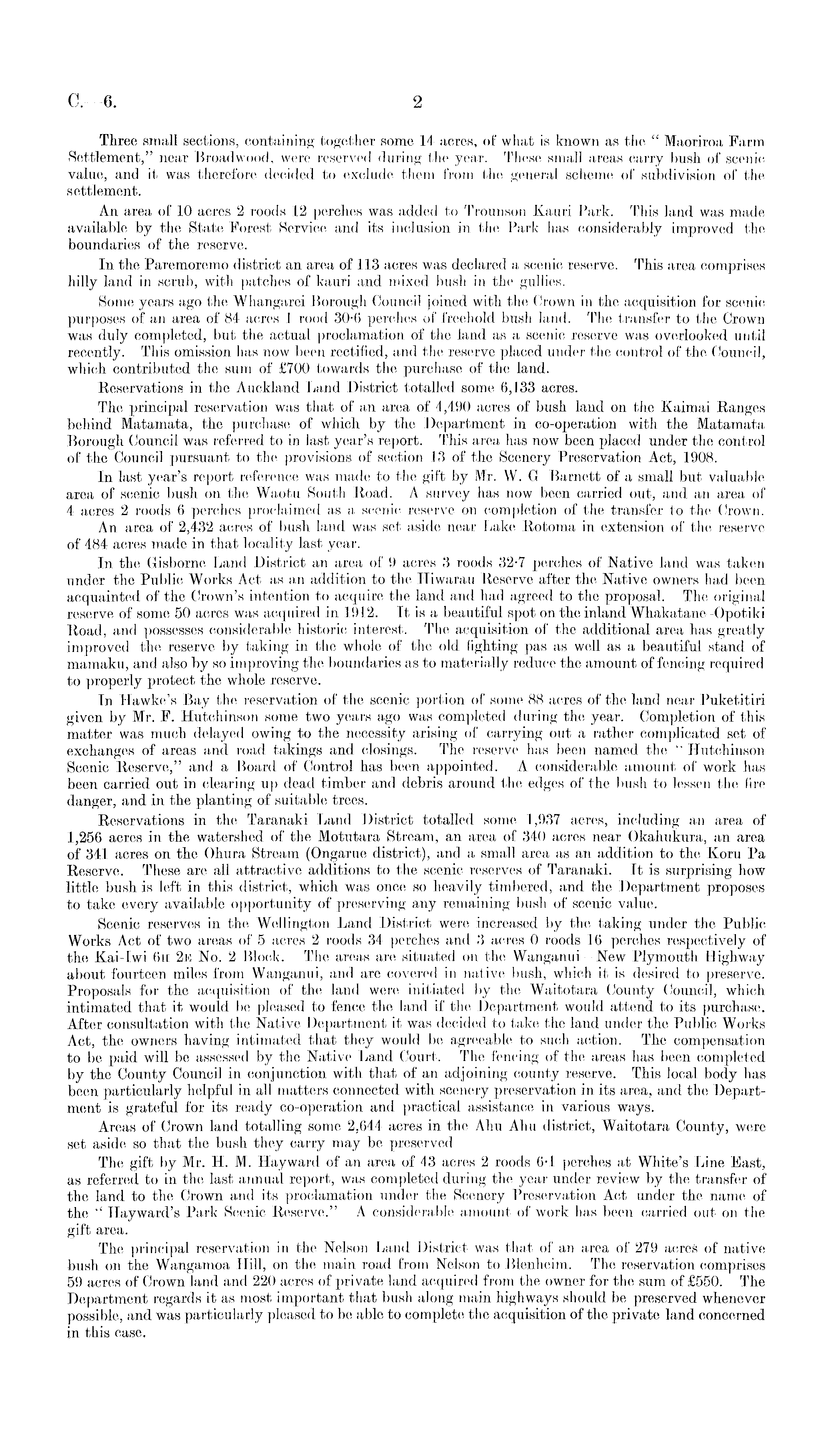 Three small sections, containing together some 14 acres, of what is known as the " Maoriroa Farm Settlement," near Broadwood, were reserved during the year. These small areas carry bush of scenic value, and it was therefore decided to exclude them from the general scheme of subdivision of the settlement. An area of 10 acres 2 roods 12 perches was added to Trounson Kauri Park. This land was made available by the State Forest Service and its inclusion in the Park has considerably improved the boundaries of the reserve. In the Paremoremo district an area of 113 acres was declared a scenic reserve. This area comprises hilly land in scrub, with patches of kauri and mixed bush in the gullies. Some years ago the Whangarei Borough Council joined with the Crown in the acquisition for scenic purposes of an area of 84 acres 1 rood 30-6 perches of freehold bush land. The transfer to the Crown was duly completed, but the actual proclamation of the land as a scenic reserve was overlooked until recently. This omission has now been rectified, and the reserve placed under the control of the Council, which contributed the sum of £700 towards the purchase of the land. Reservations in the Auckland Land District totalled some 6,133 acres. The principal reservation was that of an area of 4,490 acres of bush land on the Kaimai Ranges behind Matamata, the purchase of which by the Department in co-operation with the Matamata Borough Council was referred to in last year's report. This area has now been placed under the control of the Council pursuant to the provisions of section 13 of the Scenery Preservation Act, 1908. In last year's report reference was made to the gift by Mr. W. G Barnett of a small but valuable area of scenic bush on the Waotu South Road. A survey has now been carried out, and an area of 4 acres 2 roods 6 perches proclaimed as a scenic reserve on completion of the transfer to the Crown. An area of 2,432 acres of bush land was set aside near Lake Rotoma in extension of the reserve of 484 acres made in that locality last year. In the Gisborne Land District an area of 9 acres 3 roods 32-7 perches of Native land was taken under the Public Works Act as an addition to the Hiwarau Reserve after the Native owners had been acquainted of the Crown's intention to acquire the land and had agreed to the proposal. The original reserve of some 50 acres was acquired in 1912. It is a beautiful spot on the inland Whakatane-Opotiki Road, and possesses considerable historic interest. The acquisition of the additional area has greatly improved the reserve by taking in the whole of the old fighting pas as well as a beautiful stand of mamaku, and also by so improving the boundaries as to materially reduce the amount of fencing required to properly protect the whole reserve. In Hawke's Bay the reservation of the scenic portion of some 88 acres of the land near Puketitiri given by Mr. F. Hutchinson some two years ago was completed during the year. Completion of this matter was much delayed owing to the necessity arising of carrying out a rather complicated set of exchanges of areas and road takings and closings. The reserve has been named the " Hutchinson Scenic Reserve," and a Board of Control has been appointed. A considerable amount of work has been carried out in clearing up dead timber and debris around the edges of the bush to lessen the fire danger, and in the planting of suitable trees. Reservations in the Taranaki Land District totalled some 1,937 acres, including an area of 1,256 acres in the watershed of the Motutara Stream, an area of 340 acres near Okahukura, an area of 341 acres on the Ohura Stream (Ongarue district), and a small area as an addition to the Koru Pa Reserve. These are all attractive additions to the scenic reserves of Taranaki. It is surprising how little bush is left in this district, which was once so heavily timbered, and the Department proposes to take every available opportunity of preserving any remaining bush of scenic value. Scenic reserves in the Wellington Land District were increased by the taking under the Public Works Act of two areas of 5 acres 2 roods 34 perches and 3 acres 0 roods 16 perches respectively of the Kai-Iwi 6h 2e No. 2 Block. The areas are situated on the Wanganui - New Plymouth Highway about fourteen miles from Wanganui, and are covered in native bush, which it is desired to preserve. Proposals for the acquisition of the land were initiated by the Waitotara County Council, which intimated that it would be pleased to fence the land if the Department would attend to its purchase. After consultation with the Native Department it was decided to take the land under the Public Works Act, the owners having intimated that they would be agreeable to such action. The compensation to be paid will be assessed by the Native Land Court. The fencing of the areas has been completed by the County Council in conjunction with that of an adjoining county reserve. This local body has been particularly helpful in all matters connected with scenery preservation in its area, and the Department is grateful for its ready co-operation and practical assistance in various ways. Areas of Crown land totalling some 2,644 acres in the Ahu Ahu district, Waitotara County, were set aside so that the bush they carry may be preserved The gift by Mr. H. M. Hayward of an area of 43 acres 2 roods 6-1 perches at White's Line East, as referred to in the last annual report, was completed during the year under review by the transfer of the land to the Crown and its proclamation under the Scenery Preservation Act under the name of the " Hayward's Park Scenic Reserve." A considerable amount of work has been carried out on the gift area. The principal reservation in the Nelson Land District was that of an area of 279 acres of native bush on the Wangamoa Hill, on. the main road from Nelson to Blenheim. The reservation comprises 59 acres of Crown land and 220 acres of private land acquired from the owner for