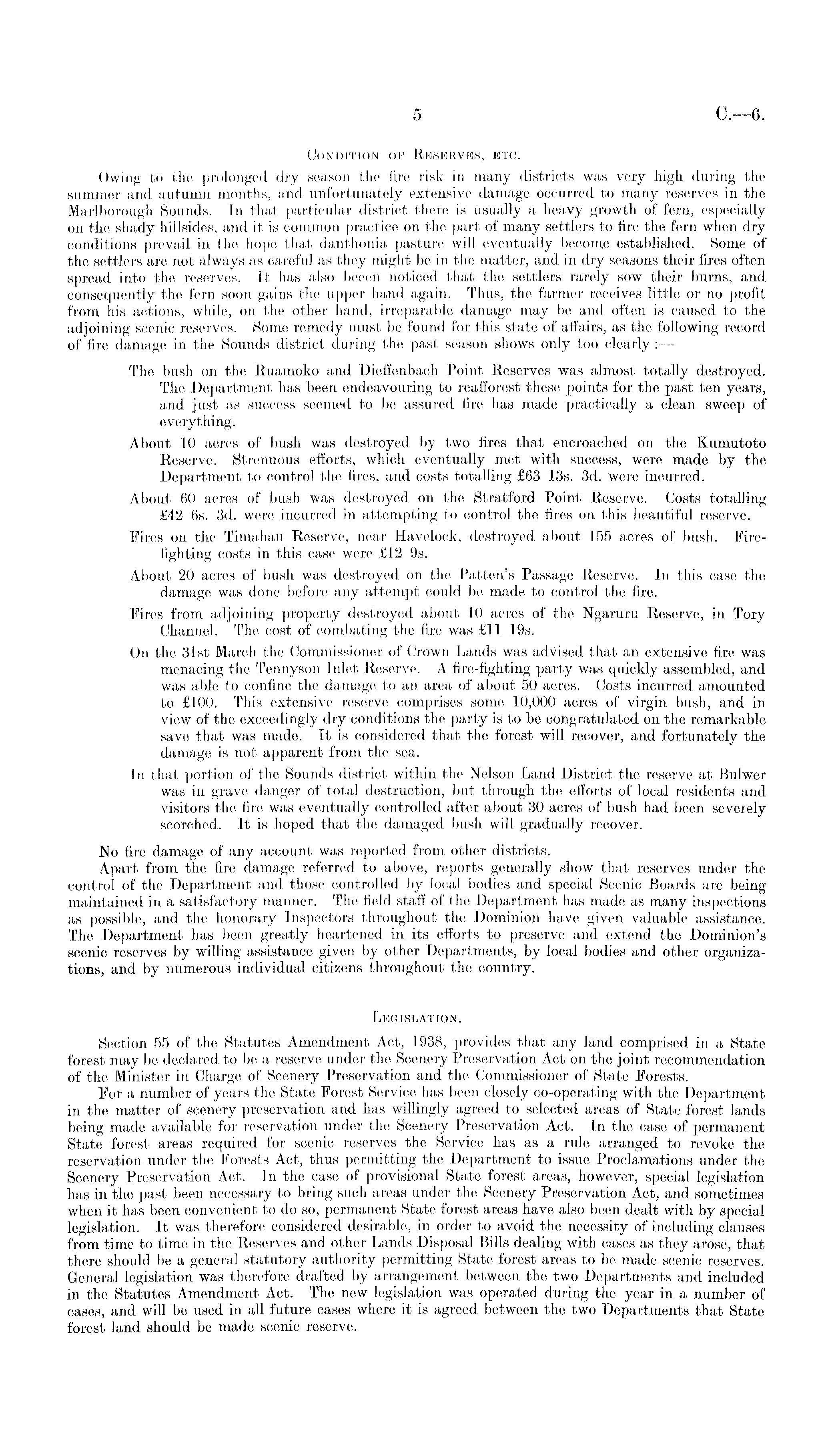 Condition op Reserves, etc. Owing to the prolonged dry season the fire risk in many districts was very high during the summer and autumn months, and unfortunately extensive damage occurred to many reserves in the Marlborough Sounds. In that particular district there is usually a heavy growth of fern, especially on the shady hillsides, and it is common practice on the part of many settlers to fire the fern when dry conditions prevail in the hope that danthonia pasture will eventually become established. Some of the settlers are not always as careful as they might be in the matter, and in dry seasons their fires often spread into the reserves. It has also beeen noticed that the settlers rarely sow their burns, and consequently the fern soon gains the upper hand again. Thus, the farmer receives little or no profit from his actions, while, on the other hand, irreparable damage may be and often is caused to the adjoining scenic reserves. Some remedy must be found for this state of affairs, as the following record of fire damage in the Sounds district during the past season shows only too clearly : — The bush on the Ruamoko and Dieffenbach Point Reserves was almost totally destroyed. The Department has been endeavouring to reafforest these points for the past ten years, and just as success seemed to be assured fire has made practically a clean sweep of everything. About 10 acres of bush was destroyed by two fires that encroached on the Kumutoto Reserve. Strenuous efforts, which eventually met with success, were made by the Department to control the fires, and costs totalling £63 13s. 3d. were incurred. About 60 acres of bush was destroyed on the Stratford Point Reserve. Costs totalling £42 6s. 3d. were incurred in attempting to control the fires on this beautiful reserve. Fires on the Tiinahau Reserve, near Havelock, destroyed about 155 acres of bush. Firefighting costs in this case were £12 9s. About 20 acres of bush was destroyed on the Patten's Passage Reserve. In this case the damage was done before any attempt could be made to control the fire. Fires from adjoining property destroyed about 10 acres of the Ngaruru Reserve, in Tory Channel. The Cost of combating the fire was £11 19s. On the 31st March the Commissioner of Crown Lands was advised that an extensive fire was menacing the Tennyson Inlet Reserve. A fire-fighting party was quickly assembled, and was able to confine the damage to an area of about 50 acres. Costs incurred amounted to £100. This extensive reserve comprises some 10,000 acres of virgin bush, and in view of the exceedingly dry conditions the party is to be congratulated on the remarkable save that was made. It is considered that the forest will recover, and fortunately the damage is not apparent from the sea. In that portion of the Sounds district within the Nelson Land District the reserve at Bulwer was in grave danger of total destruction, but through the efforts of local residents and visitors the' fire was eventually controlled after about 30 acres of bush had been severely scorched. It is hoped that the damaged bush will gradually recover. No fire damage of any account was reported from other districts. Apart from the fire damage referred to above, reports generally show that reserves under the control of the Department and those controlled by local bodies and special Scenic Boards are being maintained in a satisfactory manner. The field staff of the Department has made as many inspections as possible, and the honorary Inspectors throughout the Dominion have given valuable assistance. The Department has been greatly heartened in its efforts to preserve and extend the Dominion's scenic reserves by willing assistance given by other Departments, by local bodies and other organizations, and by numerous individual citizens throughout the country. Legislation. Section 55 of the Statutes Amendment Act, 1938, provides that any land comprised in a State forest may be declared to be a reserve under the Scenery Preservation Act on the joint recommendation of the Minister in Charge of Scenery Preservation and the Commissioner of State Forests. For a number of years the State Forest Service has been closely co-operating with the Department in the matter of scenery preservation and has willingly agreed to selected areas of State forest lands being made available for reservation under the Scenery Preservation Act. In the case of permanent State forest areas required for scenic reserves the Service has as a rule arranged to revoke the reservation under the Forests Act, thus permitting the Department to issue Proclamations under the Scenery Preservation Act. In the case of provisional State forest areas, however, special legislation has in the past been necessary to bring such areas under the Scenery Preservation Act, and sometimes when it has been convenient to do so, permanent State forest areas have also been dealt with by special legislation. It was therefore considered desirable, in order to avoid the necessity of including clauses from time to time in the Reserves and other Lands Disposal Bills dealing with cases as they arose, that there should be a general statutory authority permitting State forest areas to be made scenic reserves. General legislation was therefore drafted by arrangement between the two Departments and included in the Statutes Amendment Act. The new legislation was operated during the year in a number of cases, and will be used in all future eases where it is agreed between the two Departments that State forest land should be made scenic reserve.