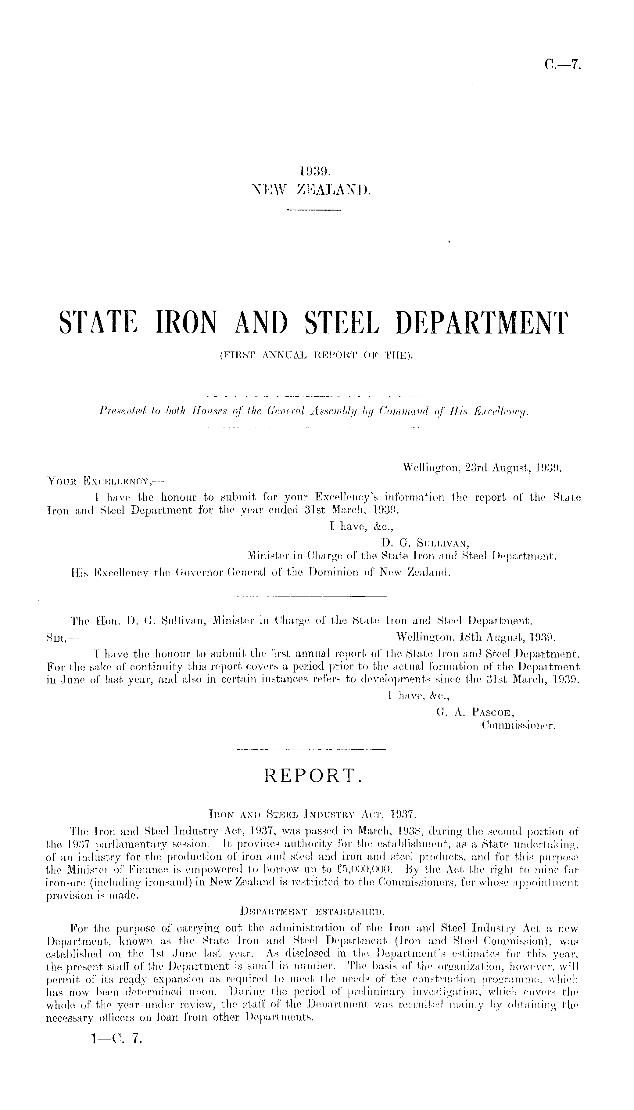 The Hon. D. G. Sullivan, Minister in Charge of the State Iron and Steel Department. Sir,-- Wellington, 18th August, 1939. I have the honour to submit the first annual report of the State Iron and Steel Department. For the sake of continuity this report covers a period prior to the actual formation of the Department in June of last year, and also in certain instances refers to developments since the 31st March, 1939. I have, &c., G. A. Pascoe, Commissioner.