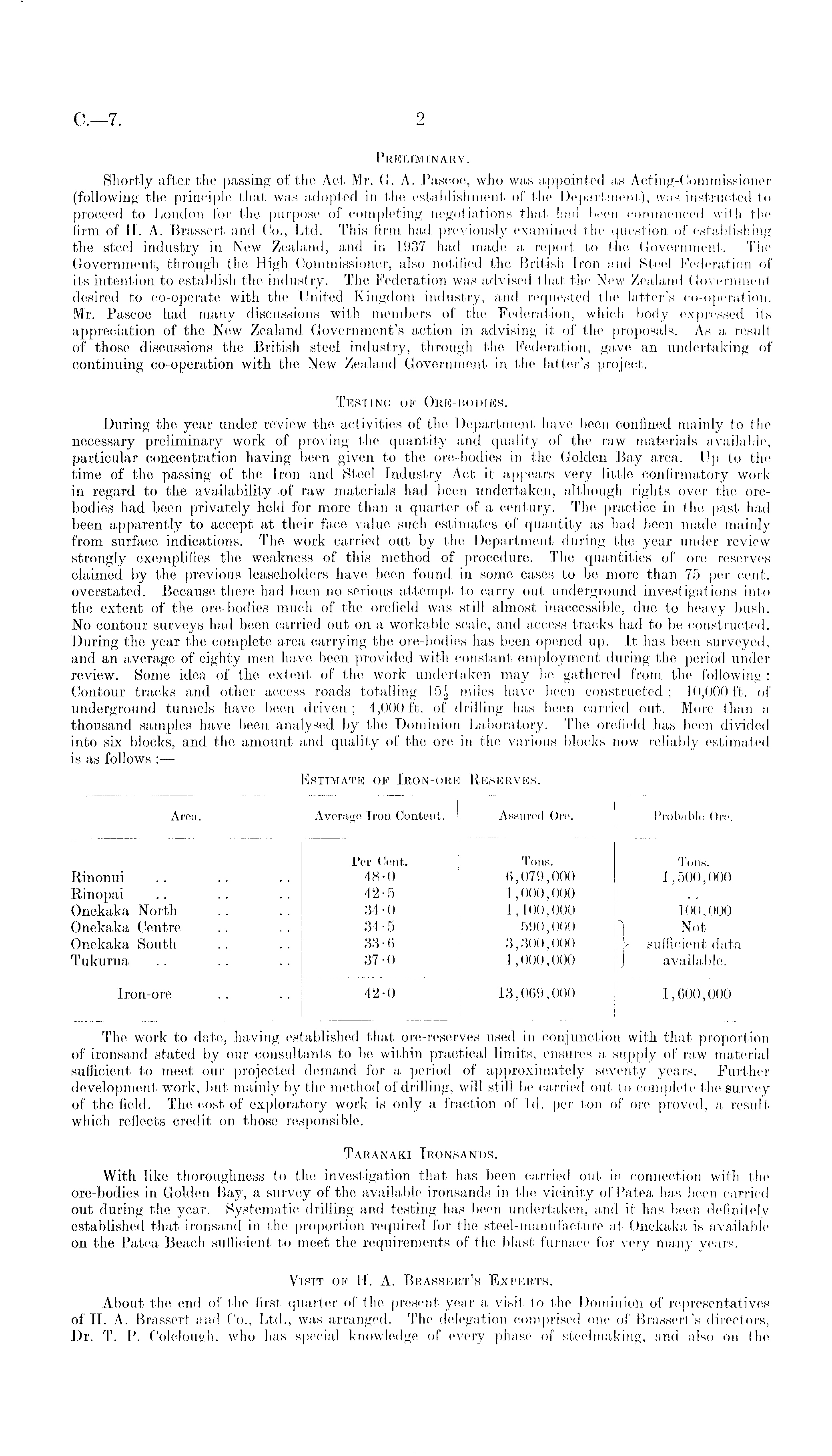 The work to date, having established that ore-reserves used in conjunction with that proportion of ironsand stated by our consultants to be within practical limits, ensures a supply of raw material sufficient to meet our projected demand for a period of approximately seventy years. Further development work, but mainly by the method of drilling, will still be carried out to complete the survey of the field. The cost of exploratory work is only a fraction of Id. per ton of ore proved, a result which reflects credit on those responsible. Taranaki Ironsands. With like thoroughness to the investigation that has been carried out in connection with the ore-bodies in Golden Bay, a survey of the available ironsands in the vicinity of Patea has been carried out during the year. Systematic drilling and testing has been undertaken, and it has been definitely established that ironsand in the proportion required for the steel-manufacture at Onekaka is available on the Patea Beach sufficient to meet the requirements of the blast furnace for very many years. Visit of H. A. Brassert's Experts. About the end of the first quarter of the present year a visit to the Dominion of representatives of H. A. Brassert and Co., Ltd., was arranged. The delegation comprised one of Brassert's directors, Dr. T. P. Colclough, who has special knowledge of every phase of steelmaking, and also on the