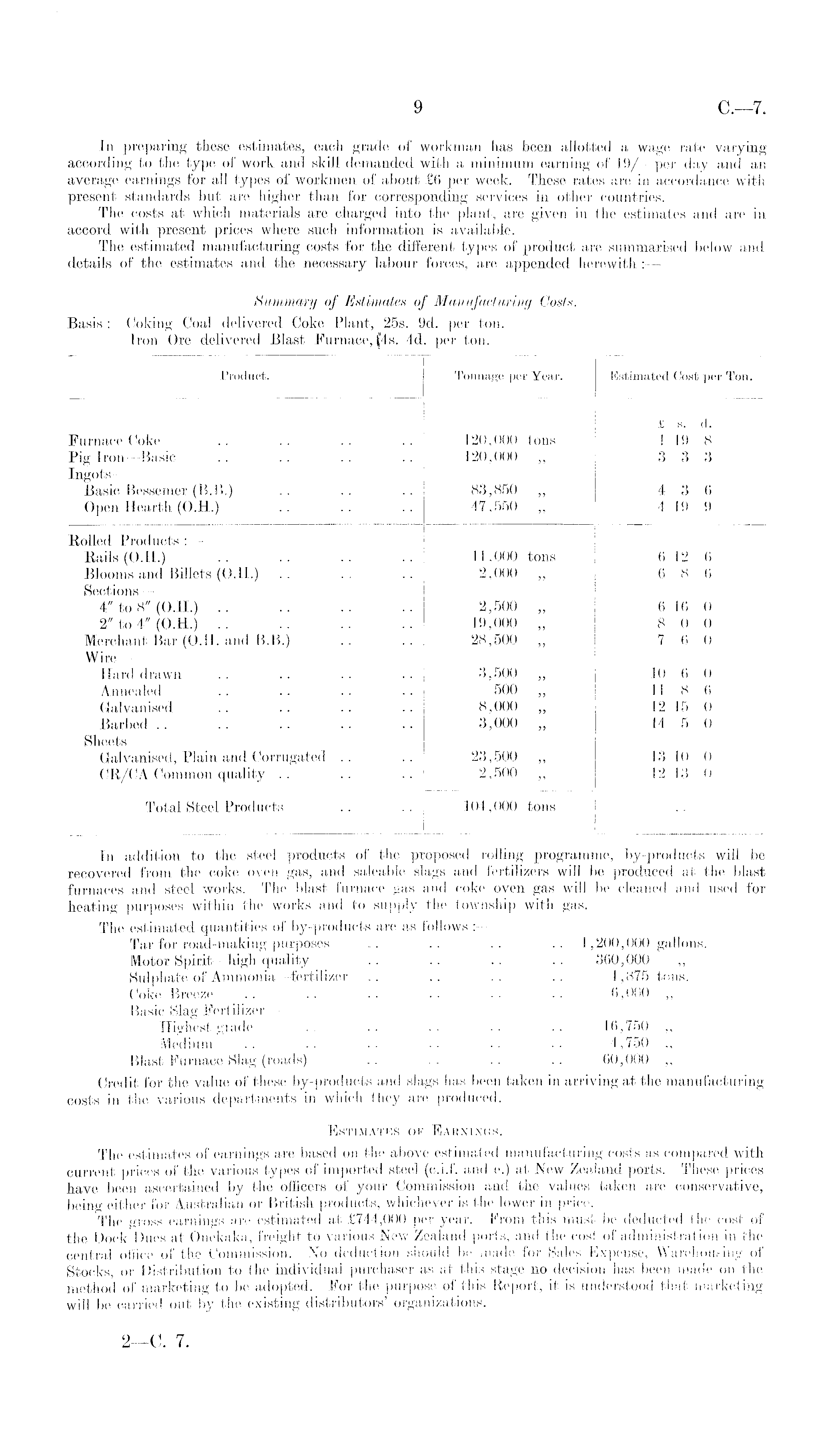 In addition to the steel products of the proposed rolling programme, by-products will be recovered from the coke oven gas, and saleable slags and fertilizers will be produced at the blast furnaces and steel works. The blast furnace gas and coke oven gas will be cleaned and used for heating purposes within the works and to supply the township with gas. The estimated quantities of by-products are as follows : — Tar for road-making purposes .. .. .. .. 1,200,000 gallons. Motor Spirit —high quality .. .. .. .. ,360,000 „ Sulphate of Ammonia —fertilizer .. .. .. .. 1,875 tons. Coke Breeze .. .. .. •• •• .. 6,000 ~ Basic Slag Fertilizer — Highest grade .. .. .. .. .. 16,750 ~ Medium .. .. .. .. .. .. 4,750 ~ Blast Furnace Slag (roads) .. .. .. .. 60,000 „ Credit for the value of these by-products and slags has been taken in arriving at the manufacturing costs in the various departments in which they are produced. Estimates op Earnings. The estimates of earnings are based on the above estimated manufacturing costs as compared with current prices of the various types of imported steel (c.i.f. and e.) at New Zealand ports. These prices have been ascertained by the officers of your Commission and the values taken are conservative, being either for Australian or British products, whichever is the lower in price. The gross earnings are estimated at £744,000 per year. From this must be deducted the cost of the Dock Dues at Onekaka, freight to various Now Zealand ports, and the cost of administration in the central office of the Commission. No deduction should be made for Sales Expense, Warehousing of Stocks, or Distribution to the individual purchaser as at this stage no decision has been made on the method of marketing to be adopted. For the purpose of this Report, it is understood that marketing, will be carried out by the existing distributors' organizations.