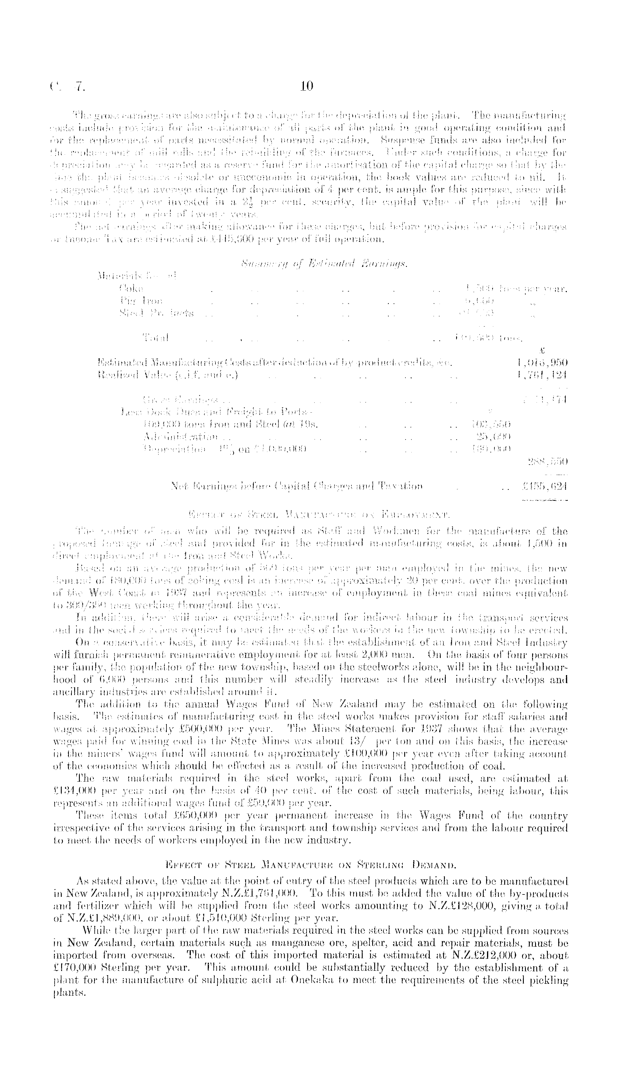 The gross earnings are also subject to a charge for the depreciation of the plant. The manufacturing costs include provision for the maintenance of all parts of the plant in good operating condition and for the replacement of parts necessitated by normal operation. Suspense funds are also included for the replacement of mill rolls and the rebuilding of the furnaces. Under such conditions, a charge for depreciation may be regarded as a reserve fund for the amortisation of the capital charge so that by the time the plant becomes obsolete or uneconomic in operation, the book values are reduced to nil. It is suggested that an average charge for depreciation of 4 per cent, is ample for this purpose, since with this amount per year invested in a 2| per cent, security, the capital value of the plant will be accumulated in a period of twenty years. The net earnings after making allowance for these charges, but before provision for capital charges or Income Tax are estimated at £445,600 per year of full operation. Summary of Estimated Earnings. Materials for sale — Coke . . . . . . .. . . .. .. 1, -500 tons per year. Pig Iron .. .. .. .. .. .. 5,000 Steel Products .. .. .. .. .. .. 104,000 ~ Total .. ... .. .. .. .. 110,500 tons. £ Estimated Manufacturing Costs after deduction of by-product credits, &c. 1,016,950 Realized Value (c.i.f. and e.) .. .. .. .. .. 1,761,124 Gross Earnings .. .. .. .. .. .. £744,174 Less Dock Dues and Freight to Ports — £ 109,000 tons Iron and Steel @ 19s. .. .. .. 103,550 Administration .. .. .. .. .. 25,000 Depreciation—4% on £4,000,000 .. .. .. 160,000 288,550 Net Earnings before Capital Charges and Taxation .. .. £455,624 Effect of Steel Manufacture on Employment. The number of men who will be required as Staff and Workmen for the manufacture of the proposed tonnage of steel and provided for in the estimated manufacturing costs, is about 1,500 in direct employment at the Iron and Steel Works. Based on an average production of 500 tons per year per man employed in the mines, the new demand of 180,000 tons of coking coal is an increase of approximately 20 per cent, over the production of the West Coast in 1937 and represents an increase of employment in these coal mines equivalent to 300/350 men working throughout the year. In addition, there will arise a considerable demand for indirect labour in the transport services and in the social services required to meet the needs of the workers in the new township to be erected. On a conservative basis, it may be estimated that the establishment of an Iron and Steel Industry will furnish permanent remunerative employment for at least 2,000 men. On the basis of four persons per family, the population of the new township, based on the steelworks alone, will be in the neighbourhood of 6,000 persons and this number will steadily increase as the steel industry develops and ancillary industries are established around it. The addition to the annual Wages Fund of New Zealand may be estimated on the following basis. The estimates of manufacturing cost in the steel works makes provision for staff:' salaries and wages at approximately £500,000 per year. The Mines Statement for 1937 shows that the average wages paid for winning coal in the State Mines was about 13/- per ton and on this basis, the increase in the miners' wages fund will amount to approximately £100,000 per year even after taking account of the economies which should be effected as a result of the increased production of coal. The raw materials required in the steel works, apart from the coal used, are estimated at £134,000 per year and on the basis of 40 per cent, of the cost of such materials, being labour, this represents an additional wages fund of £50,000 per year. These items total £650,000 per year permanent increase in the Wages Fund of the country irrespective of the services arising in the transport and township services and from the labour required to meet the needs of workers employed in the new industry. Effect of Steel Manufacture on Sterling Demand. As stated above, the value at the point of entry of the steel products which are to be manufactured in New Zealand, is approximately N.Z.£1,761,000. To this must be added the value of the by-products and fertilizer which will be supplied from the steel works amounting to N.Z.£128,000, giving a total of N.Z.£1,889,000, or about £1,510,000 Sterling per year. While the larger part of the raw materials required in the steel works can be supplied from sources in New Zealand, certain materials such as manganese ore, spelter, acid and repair materials, must be imported from overseas. The cost of this imported material is estimated at N.Z.£212,000 or, about £170,000 Sterling per year. This amount could be substantially reduced by the establishment of a jtlant for the manufacture of sulphuric acid at Onekaka to meet the requirements of the steel pickling plants.