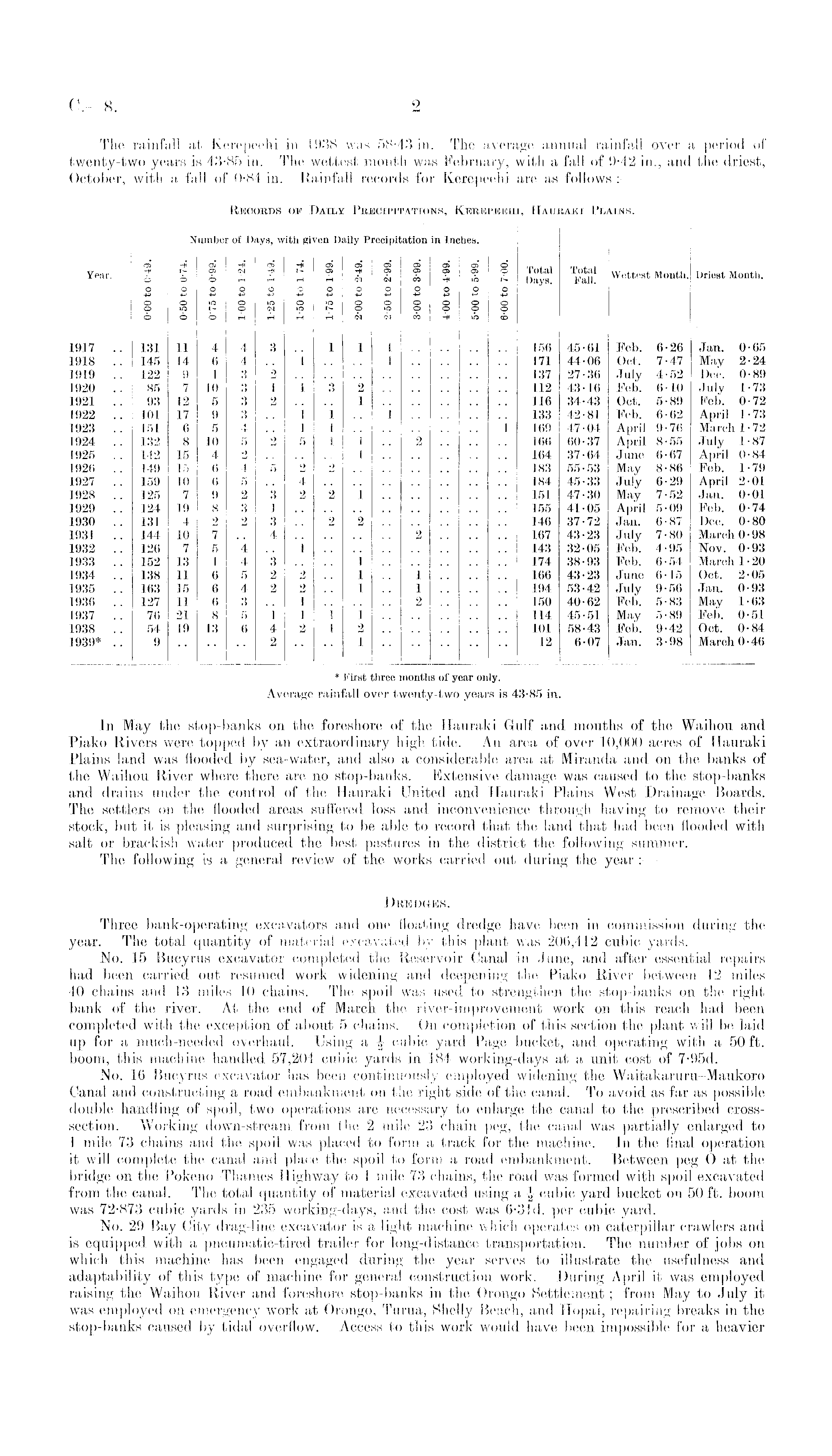 The rainfall at Kerepeehi in 1938 was 58-43 in. The average annual rainfall over a period of twenty-two years is 43-85 in. The wettest montli was February, with a fall of 9-42 in., and the driest, October, with a fall of 0-84 in. Rainfall records for Kerepeehi are as follows :—