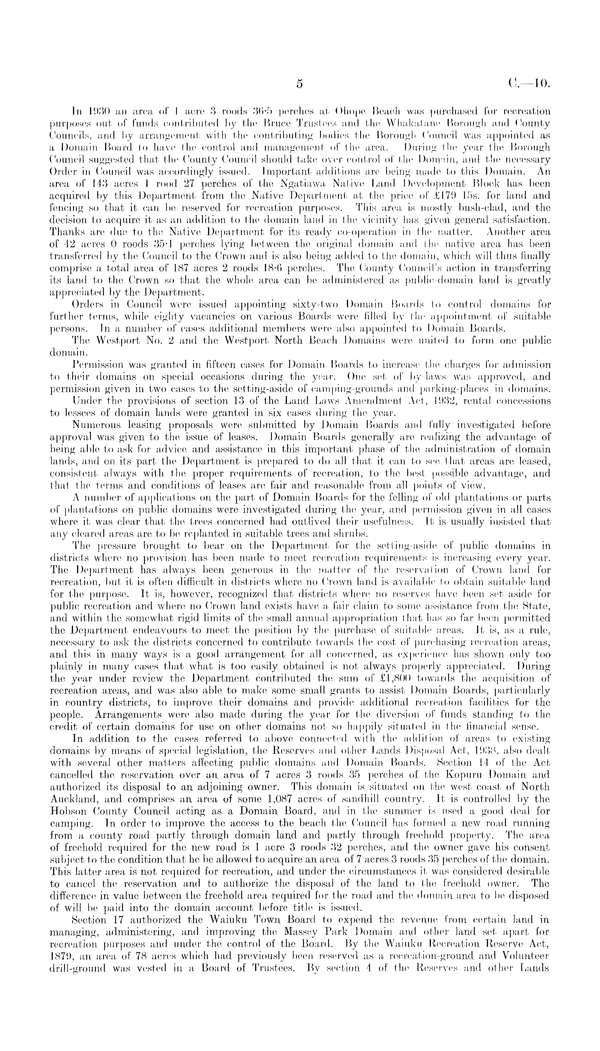 In 1930 an area of 1 acre 3 roods 36-5 perches at Ohope Beach was purchased for recreation purposes out of funds contributed by the Bruce Trustees and the Whakatane Borough and County Councils, and by arrangement with the contributing bodies the Borough Council was appointed as a Domain Board to have the control and management of the area. During the year the Borough Council suggested that the County Council should take over control of the Domain, and the necessary Order in Council was accordingly issued. Important additions are being made to this Domain. An area of 143 acres 1 rood 27 perches of the Ngatiawa Native Land Development Block has been acquired by this Department from the Native Department at the price of £179 15s. for land and fencing so that it can be reserved for recreation purposes. This area is mostly bush-clad, and the decision to acquire it as an addition to the domain land in the vicinity has given general satisfaction. Thanks are due to the Native Department for its ready co-operation in the matter. Another area of 42 acres 0 roods 35-1 perches lying between the original domain and the native area has been transferred by the Council to the Crown and is also being added to the domain, which will thus finally comprise a total area of 187 acres 2 roods 18-6 perches. The County Council's action in transferring its land to the Crown so that the whole area can be administered as public-domain land is greatly appreciated by the Department. Orders in Council were issued appointing sixty-two Domain Boards to control domains for further terms, while eighty vacancies on various Boards were filled by the appointment of suitable persons. In a number of cases additional members were also appointed to Domain Boards. The Westport No. 2 and the Westport North Beach Domains were united to form one public domain. Permission was granted in fifteen cases for Domain Boards to increase the charges for admission to their domains on special occasions during the year. One set of by-laws was approved, and permission given in two cases to the setting-aside of camping-grounds and parking-places in domains. Under the provisions of section 13 of the Land Laws Amendment Act, 1932, rental concessions to lessees of domain lands were granted in six cases during the year. Numerous leasing proposals were submitted by Domain Boards and fully investigated before approval was given to the issue of leases. Domain Boards generally are realizing the advantage of being able to ask for advice and assistance in this important phase of the administration of domain lands, and on its part the Department is prepared to do all that it can to see that areas are leased, consistent always with the proper requirements of recreation, to the best possible advantage, and that the terms and conditions of leases are fair and reasonable from all points of view. A number of applications on the part of Domain Boards for the felling of old plantations or parts of plantations on public domains were investigated during the year, and permission given in all cases where it was clear that the trees concerned had outlived their usefulness. It is usually insisted that any cleared areas are to be replanted in suitable trees and shrubs. The pressure brought to bear on the Department for the setting-aside of public domains in districts where no provision has been made to meet recreation requirements is increasing every year. The Department has always been generous in the matter of the reservation of Crown land for recreation, but it is often difficult in districts where no Crown land is available to obtain suitable land for the purpose. It is, however, recognized that districts where no reserves have been set aside for public recreation and where no Crown land exists have a fair claim to some assistance from the State, and within the somewhat rigid limits of the small annual appropriation that has so far been permitted the Department endeavours to meet the position by the purchase of suitable areas. It is, as a rule, necessary to ask the districts concerned to contribute towards the cost of purchasing recreation areas, and this in many ways is a good arrangement for all concerned, as experience has shown only too plainly in many cases that what is too easily obtained is not always properly appreciated. During the year under review the Department contributed the sum of £1,800 towards the acquisition of recreation areas, and was also able to make some small grants to assist Domain Boards, particularly in country districts, to improve their domains and provide additional recreation facilities for the people. Arrangements were also made during the year for the diversion of funds standing to the credit of certain domains for use on other domains not so happily situated in the financial sense. In addition to the cases referred to above connected with the addition of areas to existing domains by means of special legislation, the Reserves and other Lands Disposal Act, 1938, also dealt with several other matters affecting public domains and Domain Boards. Section 14 of the Act cancelled the reservation over an area of 7 acres 3 roods 35 perches of the Kopuru Domain and authorized its disposal to an adjoining owner. This domain is situated on the west coast of North Auckland, and comprises an area of some 1,087 acres of sandhill country. It is controlled by the Hobson County Council acting as a Domain Board, and in the summer is used a good deal for camping. In order to improve the access to the beach the Council has formed a new road running from a county road partly through domain land and partly through freehold property. The area of freehold required for the new road is 1 acre 3 roods 32 perches, and the owner gave his consent subject to the condition that he be allowed to acquire an area of 7 acres 3 roods 35 perches of the domain. This latter area is not required for recreation, and under the circumstances it was considered desirable to canc