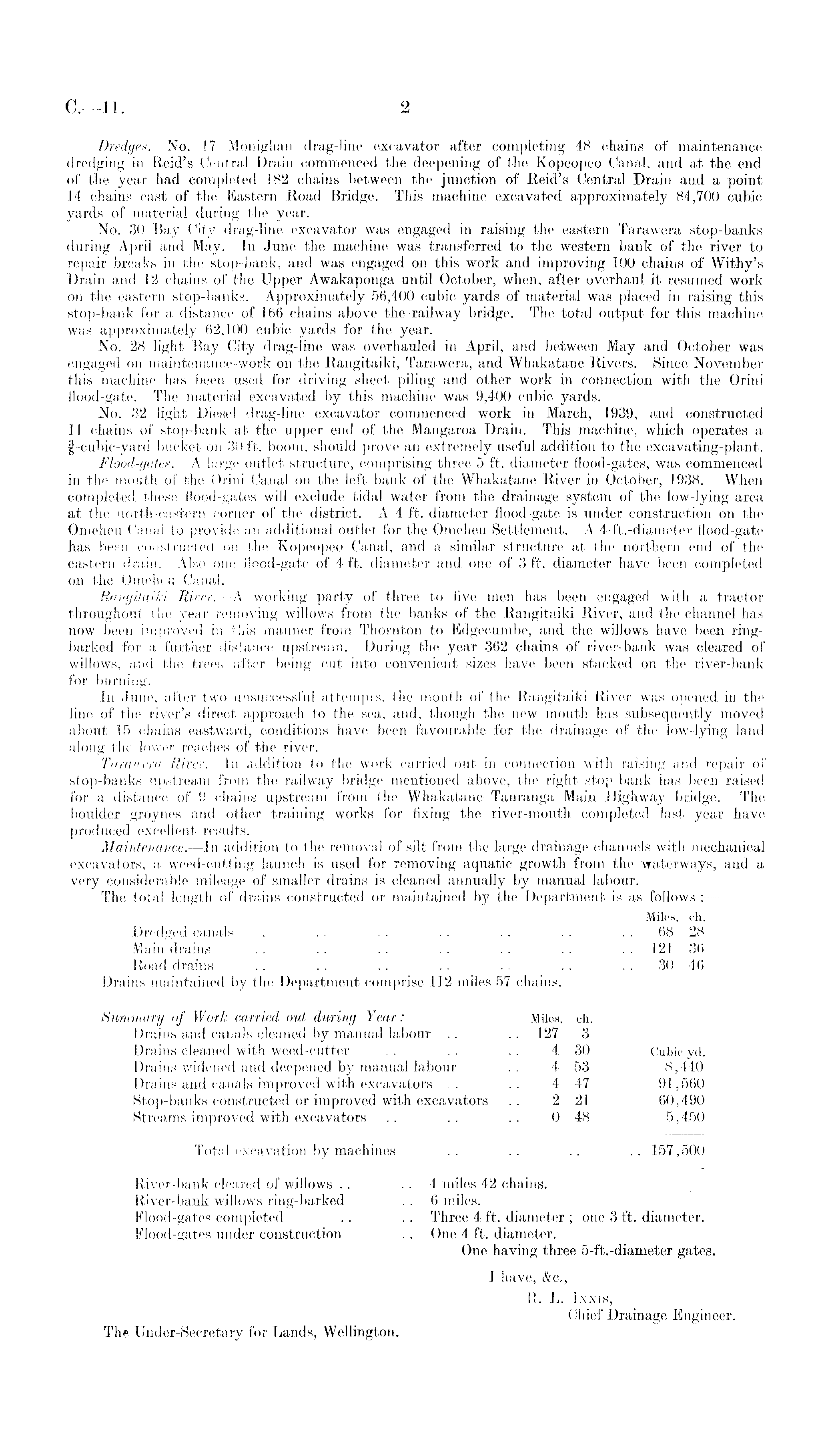 Dredges. —-No. 17 Monighan drag-line, excavator after completing 48 chains of maintenance dredging in Reid's Central Drain commenced the deepening of the Kopeopeo Canal, and at the end of the year had completed 182 chains between the junction of Reid's Central Drain and a point 14 chains east of the Eastern Road Bridge. This machine excavated approximately 84,700 cubic yards of material during the year. No. 30 Bay City drag-line excavator was engaged in raising the eastern Tarawera stop-banks during April and May. In June the machine was transferred to the western bank of the river to repair breaks in the stop-bank, and was engaged on this work and improving 100 chains of Withy's Drain and 12 chains of the Upper Awakaponga until October, when, after overhaul it resumed work on the eastern stop-banks. Approximately 56,400 cubic yards of material was placed in raising this stop-bank for a distance of 166 chains above the railway bridge. The total output for this machine was approximately 62,100 cubic yards for the year. No. 28 light Bay City drag-line was overhauled in April, and between May and October was engaged on maintenance-work on the Rangitaiki, Tarawera, and Whakatane Rivers. Since November this machine has been used for driving sheet piling and other work in connection with the Orini flood-gate. The material excavated by this machine was 9,400 cubic yards. No. 32 light Diesel drag-line excavator commenced work in March, 1939, and constructed 11 chains of stop-bank at the upper end of the Mangaroa Drain. This machine, which operates a f-cubic-yard bucket on 30 ft. boom, should prove an extremely useful addition to the excavating-plant. Flood-gates. —A large outlet structure, comprising three 5-ft.-diameter flood-gates, was commenced in the mouth of the Orini Canal on the left bank of the Whakatane River in October, 1938. When completed these flood-gates will exclude tidal water from the drainage system of the low-lying area at the north-eastern corner of the district. A 4-ft.-diameter flood-gate is under construction on the Omeheu Canal to provide an additional outlet for the Oineheu Settlement. A 4-ft.-diameter flood-gate has been constructed on the Kopeopeo Canal, and a similar structure at the northern end of the eastern drain, Also one flood-gate of 4 ft. diameter and one of 3 ft. diameter have been completed on the Omeheu Canal. Rangitaiki River.—A working party of three to five men has been engaged with a tractor throughout the year removing willows from the banks of the Rangitaiki River, and the channel has now been improved in this manner from Thornton to Edgecumbe, and the willows have been ringbarked for a further distance upstream. During the year 362 chains of river-bank was cleared of willows, and the trees after being cut into convenient sizes have been stacked on the river-bank for burning. In June, after two unsuccessful attempts, the mouth of the Rangitaiki River was opened in the line of the river's direct approach to the sea, and, though the new mouth has subsequently moved about 15 chains eastward, conditions have been favourable for the drainage of the low-lying land along the lower reaches of the river. Tarawera River. —In addition to the work carried out in connection with raising and repair of stop-banks upstream from the railway bridge mentioned above, the right stop-bank has been raised for a distance of 9 chains upstream from the Whakatane-Tauranga Main Highway bridge. The boulder groynes and other training works for fixing the river-mouth completed last year have produced excellent results. Maintenance. —In addition to the removal of silt from the large drainage channels with mechanical excavators, a weed-cutting launch is used for removing aquatic growth from the waterways, and a very considerable mileage of smaller drains is cleaned annually by manual labour. The total length of drains constructed or maintained by the Department is as follows : — Miles, ell. Dredged canals .. .. .. .. .. .. 68 28 Main drains .. .. .. .. .. .. .. 121 36 Road drains .. .. .. .. .. .. 30 46 Drains maintained by the Department comprise 112 miles 57 chains. Summary of Work carried out during Year:— Miles, oh. Drains and canals cleaned by manual labour .. 127 3 Drains cleaned with weed-cutter .. .. .. 4 30 Cubic yd. Drains widened and deepened by manual labour . . 4 53 8,440 Drains and canals improved with excavators .. .. 4 47 91,560 Stop-banks constructed or improved with excavators .. 2 21 60,490 Streams improved with excavators .. .. .. 0 48 5,450 Total excavation by machines .. .. .. .. 157,500 River-bank cleared of willows .. 4 miles 42 chains. River-bank willows ring-barked . . 6 miles. Flood-gates completed .. .. Three 4 ft. diameter ; one 3 ft. diameter. Flood-gates under construction .. One 4 ft. diameter. One having three 5-ft.-diameter gates. I have, &c., R. L. Innis, Chief Drainage Engineer. The Under-Secretary for Lands, Wellington.