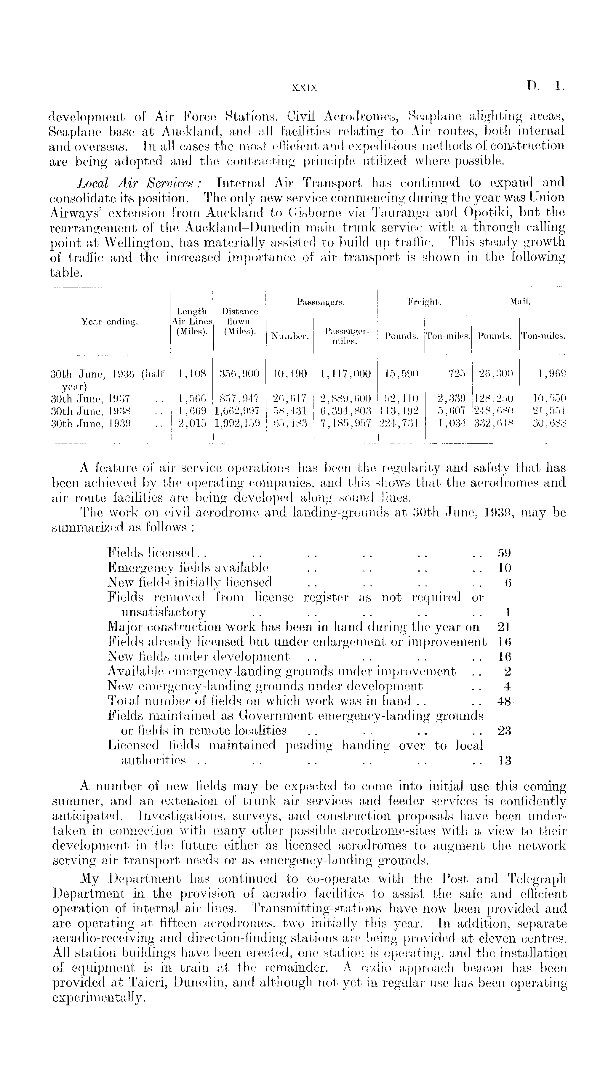 A feature of air service operations has been the regularity and safety that has been achieved by the operating companies, and this shows that the aerodromes and air route facilities are being developed along sound lines. The work on civil aerodrome and landing-grounds at 30th June, 1939, may be summarized as follows : — Fields licensed. . . . .. .. .. .. 59 Emergency fields available .. . . .. 10 New fields initially licensed . . .. .. 6 Fields removed from license register as not required or unsatisfactory . . . . . . . . 1 Major construction work has been in hand during the year on 21 Fields already licensed but under enlargement or improvement 16 New fields under development . . .. . . 16 Available emergency-landing grounds under improvement .. 2 New emergency-landing grounds under development .. 4 Total number of fields on which work was in hand . . 48 Fields maintained as Government emergency-landing grounds or fields in remote localities . . . . .. . . 23 Licensed fields maintained pending banding over to local authorities .. . . . . .. .. 13 A number of new fields may be expected to come into initial use this coming summer, and an extension of trunk air services and feeder services is confidently anticipated. Investigations, surveys, and construction proposals have been undertaken in connection with many other possible aerodrome-sites with a view to their development in the future either as licensed aerodromes to augment the network serving air transport needs or as emergency-landing grounds. My Department has continued to co-operate with the Post and Telegraph Department in the provision of aeradio facilities to assist the safe and efficient operation of internal air lines. Transmitting-stations have now been provided and are operating at fifteen aerodromes, two initially this year. In addition, separate aeradio-receiving and direction-finding stations are being provided at eleven centres. All station buildings have been erected, one station is operating, and the installation of equipment is in train at the remainder. A radio approach beacon has been provided at Taieri, Dunedin, and although not yet in regular use has been operating experimentally.
