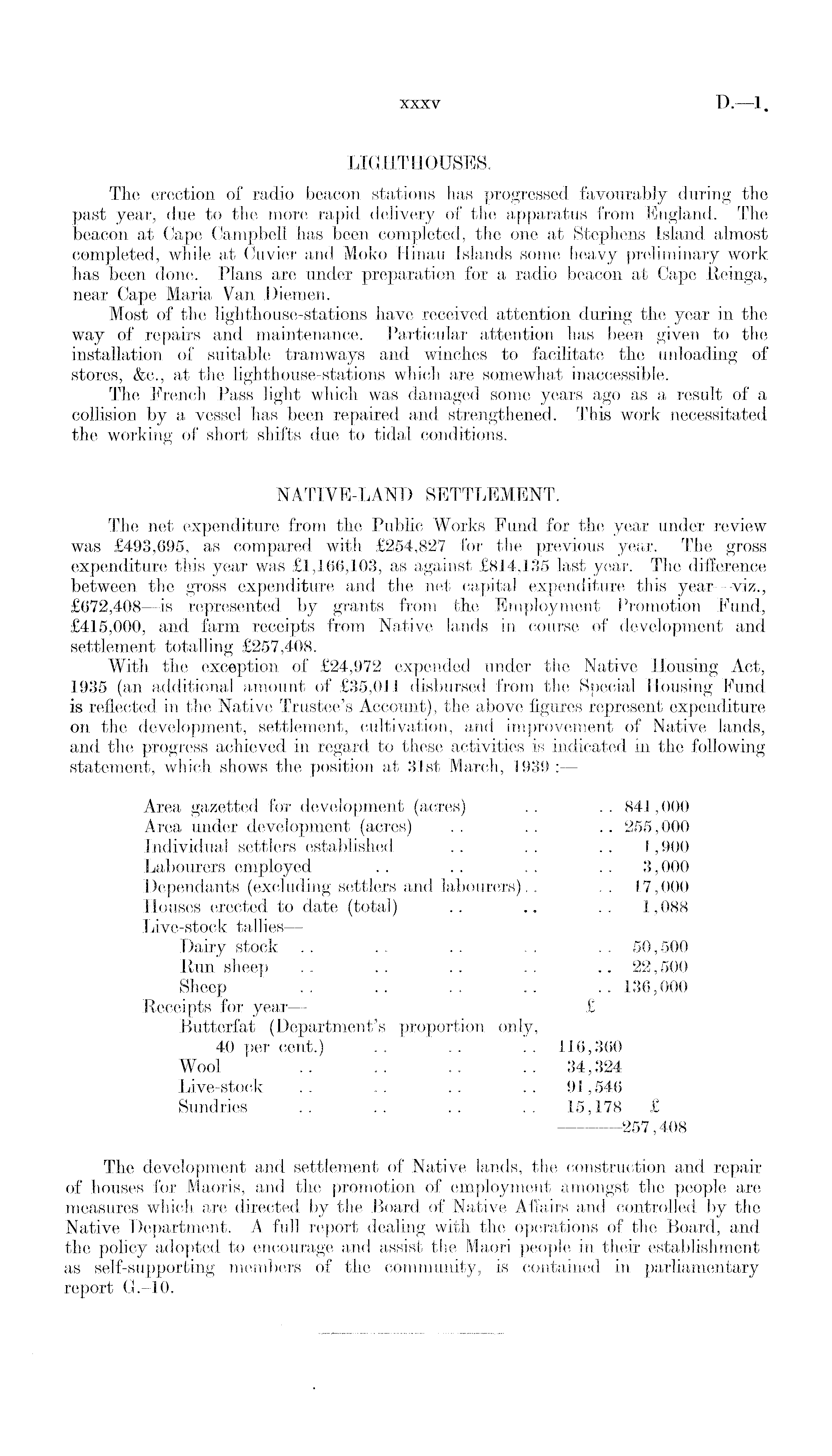 LIGHTHOUSES. The erection of radio beacon stations has progressed favourably during the past year, due to the more rapid delivery of the apparatus from England. The beacon at Cape Campbell has been completed, the one at Stephens Island almost completed, while at Cuvier and Moko Hinau Islands some heavy preliminary work has been done. Plans are under preparation for a radio beacon at Cape Reinga, near Cape Maria Van Diemen. Most of the lighthouse-stations have received attention during the year in the way of repairs and maintenance. Particular attention has been given to the installation of suitable tramways and winches to facilitate the unloading of stores, &c., at the lighthouse-stations which are somewhat inaccessible. The French Pass light which was damaged some years ago as a result of a collision by a vessel has been repaired and strengthened. This work necessitated the working of short shifts due to tidal conditions. NATIVE-LAND SETTLEMENT. The net expenditure from the Public Works Fund for the year under review was £493,695, as compared with £'254,827 for the previous year. The gross expenditure this year was £1,166,103, as against £814,135 last year. The difference between the gross expenditure and the net capital expenditure this year —viz., £672,408 —is represented by grants from the Employment Promotion Fund, £415,000, and farm receipts from Native lands in course of development and settlement totalling £257,408. With the exception of £24,972 expended under the Native Housing Act, 1935 (an additional amount of £35,011 disbursed from the Special Housing Fund is reflected in the Native Trustee's Account), the above figures represent expenditure on the development, settlement, cultivation, and improvement of Native lands, and the progress achieved in regard to these activities is indicated in the following statement, which shows the position at 31st March, 1939 : — Area gazetted for development (acres) . . . . 841,000 Area under development (acres) . . . . .. 255,000 Individual settlers established .. .. .. 1,900 Labourers employed . . . . . . . . 3,000 Dependants (excluding settlers and labourers). . . . 17,000 Houses erected to date (total) . . .. . . 1,088 Live-stock tallies — Dairy stock . . . . . . . . . . 50,500 Run sheep . . . . . . . . .. 22,500 Sheep .. .. .. .. .. 136,000 Receipts for year— £ Butterfat (Department's proportion only, 40 per cent.) .. .. .. 116,360 Wool .. .. .. ..34,324 Live-stock .. .. .. .. 91,546 Sundries .. .. .. .. 15,178 £ 257,408 The development a,nd settlement of Native lands, the construction and repair of houses for Maoris, and the promotion of employment amongst the people are measures which are directed by the Board of Native Affairs and controlled by the Native Department. A full report dealing with the operations of the Board, and the policy adopted to encourage and assist the Maori people in their establishment as self-supporting members of the community, is contained in parliamentary report G.-10.